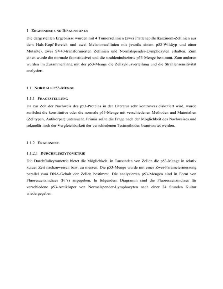 1 ERGEBNISSE UND DISKUSSIONEN Die dargestellten Ergebnisse wurden mit 4 Tumorzellinien (zwei Plattenepithelkarzinom-Zellinien aus dem Hals-Kopf-Bereich und zwei Melanomzellinien mit jeweils einem p53-Wildtyp und einer Mutante), zwei SV40-transformierten Zellinien und Normalspender-Lymphozyten erhalten. Zum einen wurde die normale (konstitutive) und die strahleninduzierte p53-Menge bestimmt. Zum anderen wurden im Zusammenhang mit der p53-Menge die Zellzyklusverteilung und die Strahlensensitivität analysiert. 1.1 NORMALE P53-MENGE 1.1.1 FRAGESTELLUNG Da zur Zeit der Nachweis des p53-Proteins in der Literatur sehr kontrovers diskutiert wird, wurde zunächst die konstitutive oder die normale p53-Menge mit verschiedenen Methoden und Materialien (Zelltypen, Antikörper) untersucht. Primär sollte die Frage nach der Möglichkeit des Nachweises und sekundär nach der Vergleichbarkeit der verschiedenen Testmethoden beantwortet werden. 1.1.2 ERGEBNISSE 1.1.2.1 DURCHFLUßZYTOMETRIE Die Durchflußzytometrie bietet die Möglichkeit, in Tausenden von Zellen die p53-Menge in relativ kurzer Zeit nachzuweisen bzw. zu messen. Die p53-Menge wurde mit einer Zwei-Parametermessung parallel zum DNA-Gehalt der Zellen bestimmt. Die analysierten p53-Mengen sind in Form von Fluoreszenzindizes (Fi’s) angegeben. In folgendem Diagramm sind die Fluoreszenzindizes für verschiedene p53-Antikörper von Normalspender-Lymphozyten nach einer 24 Stunden Kultur wiedergegeben. p53 Fluoreszenzindizes - Lymphozyten 10 Fluoreszenzindex 8 4,61 6 3,49 4 2 0,32 0,11 0 PAb421 PAb1801 PAb240 Antikörper - clone Do-1 Abbildung 1: p53-Fluoreszenzindizes bei Lymphozyten nach 24 Stunden Kultur. Dargestellt sind Mittelwerte und Standardabweichungen von den Mittelwerten. Ein Fi der größer als 0,5 ist stellt einen positiven p53-Nachweis dar. Die beiden Antikörper PAb1801 und PAb240 erbrachten einen p53-Nachweis. Kein p53-Nachweis wurde mit den Antikörpern PAb421 und Do-1 erhalten (Fi<0,5). Eine statistische Analyse des Vergleichs von verschiedenen p53-Antikörpern wurde mit Hilfe des Student t-Tests durchgeführt. Die ermittelten p-Werte sind in folgenden Tabellen dargestellt. P-Werte kleiner als 0,05 (5% Signifikanzniveau) sind grau unterlegt. Zellen Antikörper PAb421 Lymphozyten PAb1801 PAb240 Lymphozyten PAb421 PAb1801 PAb240 Do-1 0,0507 0,0134 0,3198 0,3143 0,0573 0,0055 Tabelle 1: P-Werte für den Vergleich verschiedener p53-Fluoreszenzindizes von p53-Antikörpern bei Lymphozyten Bei den beiden Plattenepithelkarzinom-Zellinien 4197 und 4451 wurde ebenfalls die konstitutive p53Menge nach einer 24 Stunden Kultur gemessen. Nachstehendes Diagramm stellt die erhaltenen Fluoreszenzindizes graphisch dar. p53 Fluoreszenzindizes - Plattenepithelkarzinomzellinien 16 Fluoreszenzindex 4197 4451 12 8,22 8 5,11 3,43 3,48 4,23 4 0,17 0,29 0,55 0 PAb421 PAb1801 PAb240 Antikörper - clone Do-1 Abbildung 2: p53-Fluoreszenzindizes bei 2 Plattenepithelkarzinom-Zellinien (24h Kultur). Dargestellt sind Mittelwerte und Standardabweichungen von den Mittelwerten. Die Zellinie 4451, mit mutiertem p53-Protein, zeigte mit allen Antikörpern einen positiven p53Nachweis. Bei allen vier Antikörpern waren die Fi’s der Zellinie 4451 größer als die Fi’s der Zellinie 4197. Die Zellinie 4197 erbrachten mit den Antikörpern PAb1801 und PAb240 maximale Fi’s, während mit den Antikörpern PAb421 und Do-1 kein p53 Nachweis erzielt wurde (Fi<0,5). Eine statistische Analyse für den Vergleich der unterschiedlichen Fluoreszenzindizes, der einzelnen p53-Antikörper, wurde mit Hilfe des Student t-Tests durchgeführt. Die ermittelten p-Werte sind in folgenden Tabellen dargestellt. P-Werte kleiner als 0,05 (5% Signifikanzniveau) sind grau unterlegt. Inkubation Antikörper PAb421 PAb1801 PAb240 Do-1 PAb421 0,1075 p<0,0001 p<0,0001 p<0,0001 PAb1801 0,0011 0,0109 0,0004 0,0678 PAb240 0,0014 0,0107 0,0004 0,0632 Do-1 0,0486 p<0,0001 p<0,0001 p<0,0001 4197 4451 Tabelle 2: P-Werte für den Vergleich der unterschiedlichen p53-Fluoreszenzindizes, die mit den vier p53-Antikörpern, bei Plattenepithelkarzinom-Zellinien, bestimmt wurden. Die p53-Menge wurde ebenfalls bei einem Paar Melanomzellinien (eine p53 Mutante und ein p53Wildtyp) bestimmt. Die Ergebnisse sind in Abbildung 11 dargestellt. p53 Fluoreszenzindizes - Melanomzellinien 16 Fluoreszenzindex Be11 9,85 Mewo 12 5,71 8 4,16 2,49 4 0,52 0,20 0,52 1,94 0 PAb421 PAb1801 PAb240 Antikörper - clone Do-1 Abbildung 3: p53-Fluoreszenzindizes bei 2 Melanomzellinien (24h Kultur). Dargestellt sind Mittelwerte und Standardabweichungen von den Mittelwerten. Wiederum zeigte die Zellinie mit mutiertem p53-Protein (Mewo) mit allen Antikörper einen positiven p53-Nachweis. Die Zellinie mit p53-Wildtypprotein (Be11) erbrachte beim Nachweis mit den Antikörpern PAb1801 und PAb240 im Vergleich zur Zellinie 4451 einen höheren Fluoreszenzindex. Dagegen zeigte der Nachweis mit dem Antikörper PAb421 bei der Zellinie Mewo einen Fi von 0,52 (p53-Nachweis) und bei der Zellinie Be11 einen kleineren Fi von 0,2 (kein p53-Nachweis). Ähnliche Verhältnisse bestehen hinsichtlich des Antikörpers Do-1, wobei hier allerdings für beide Zellinien ein p53-Nachweis zu verzeichnen war. Eine statistische Analyse des Vergleichs der verschiedenen Fluoreszenzindizes wurde mit Hilfe des Student t-Tests durchgeführt. Die ermittelten p-Werte sind in folgenden Tabellen dargestellt. P-Werte kleiner als 0,05 (5% Signifikanzniveau) sind grau unterlegt. Zellen Antikörper PAb421 PAb1801 PAb240 Do-1 PAb421 0,1986 0,0002 0,0780 0,0089 PAb1801 0,0310 0,2879 0,1384 0,0653 PAb240 0,0211 0,1284 0,0488 0,0339 Do-1 0,4963 0,0003 0,1036 0,0166 Be11 Mewo Tabelle 3: P-Werte für den Vergleich der p53-Fluoreszenzindizes von p53-Antikörpern bei Melanomzellinien. 1.1.2.2 „WESTERN BLOTTING“ Der p53-Nachweis mit Hilfe des „Western blots“ sollte zum einen ebenfalls die konstitutive p53Menge nachweisen und zum anderen die Spezifität der Antikörper überprüfen. Die ans