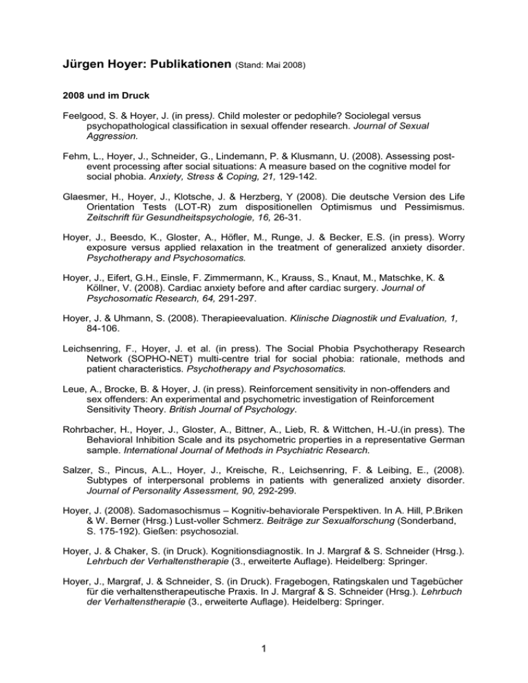 Jürgen Hoyer: Publikationen (Stand: Mai 2008) 2008 und im Druck Feelgood, S. & Hoyer, J. (in press). Child molester or pedophile? Sociolegal versus psychopathological classification in sexual offender research. Journal of Sexual Aggression. Fehm, L., Hoyer, J., Schneider, G., Lindemann, P. & Klusmann, U. (2008). Assessing postevent processing after social situations: A measure based on the cognitive model for social phobia. Anxiety, Stress & Coping, 21, 129-142. Glaesmer, H., Hoyer, J., Klotsche, J. & Herzberg, Y (2008). Die deutsche Version des Life Orientation Tests (LOT-R) zum dispositionellen Optimismus und Pessimismus. Zeitschrift für Gesundheitspsychologie, 16, 26-31. Hoyer, J., Beesdo, K., Gloster, A., Höfler, M., Runge, J. & Becker, E.S. (in press). Worry exposure versus applied relaxation in the treatment of generalized anxiety disorder. Psychotherapy and Psychosomatics. Hoyer, J., Eifert, G.H., Einsle, F. Zimmermann, K., Krauss, S., Knaut, M., Matschke, K. & Köllner, V. (2008). Cardiac anxiety before and after cardiac surgery. Journal of Psychosomatic Research, 64, 291-297. Hoyer, J. & Uhmann, S. (2008). Therapieevaluation. Klinische Diagnostik und Evaluation, 1, 84-106. Leichsenring, F., Hoyer, J. et al. (in press). The Social Phobia Psychotherapy Research Network (SOPHO-NET) multi-centre trial for social phobia: rationale, methods and patient characteristics. Psychotherapy and Psychosomatics. Leue, A., Brocke, B. & Hoyer, J. (in press). Reinforcement sensitivity in non-offenders and sex offenders: An experimental and psychometric investigation of Reinforcement Sensitivity Theory. British Journal of Psychology. Rohrbacher, H., Hoyer, J., Gloster, A., Bittner, A., Lieb, R. & Wittchen, H.-U.(in press). The Behavioral Inhibition Scale and its psychometric properties in a representative German sample. International Journal of Methods in Psychiatric Research. Salzer, S., Pincus, A.L., Hoyer, J., Kreische, R., Leichsenring, F. & Leibing, E., (2008). Subtypes of interpersonal problems in patients with generalized anxiety disorder. Journal of Personality Assessment, 90, 292-299. Hoyer, J. (2008). Sadomasochismus – Kognitiv-behaviorale Perspektiven. In A. Hill, P.Briken & W. Berner (Hrsg.) Lust-voller Schmerz. Beiträge zur Sexualforschung (Sonderband, S. 175-192). Gießen: psychosozial. Hoyer, J. & Chaker, S. (in Druck). Kognitionsdiagnostik. In J. Margraf & S. Schneider (Hrsg.). Lehrbuch der Verhaltenstherapie (3., erweiterte Auflage). Heidelberg: Springer. Hoyer, J., Margraf, J. & Schneider, S. (in Druck). Fragebogen, Ratingskalen und Tagebücher für die verhaltenstherapeutische Praxis. In J. Margraf & S. Schneider (Hrsg.). Lehrbuch der Verhaltenstherapie (3., erweiterte Auflage). Heidelberg: Springer. 1 Hoyer, J. & Herzberg, P.Y. (in Druck). Optimismus. In M. Jerusalem & J. Bengel (Hrsg.), Gesundheitspsychologie (Reihe Handbuch der Psychologie). Göttingen: Hogrefe. Jacobi, F. & Hoyer, J. (2008). Gesundheitsberichterstattung über Psychotherapie nach dem Gesundheitsmodernisierungsgesetz – ein kritischer Fall. Psychotherapeutenjournal, 7, 140-144. 2007 Chaker, S. & Hoyer, J. (2007). Erythrophobie: Störungswissen und Verhaltenstherapie. Verhaltenstherapie, 17, 183-190. Fehm. L., Schneider, G. & Hoyer, J. (2007). Is post-event processing specific for social phobia? Journal of Behaviour Therapy and Experimental Psychiatry, 38, 11-22. Helbig, S. & Hoyer, J. (2007). Hilft wenig viel? Effekte einer Minimalintervention in der Wartezeit auf eine ambulante Psychotherapie. Verhaltenstherapie, 17, 109-115. Hoyer, J., Hacker, J. & Lindenmeyer, J. (2007). Meta-cognition in alcohol abusers: How are alcohol-related intrusions appraised? Cognitive Therapy and Research, 31, 817-831. Hoyer, J., Kunst, H. & Hammelstein, P. (2007). Sexualstraftäter: krank oder kriminell? Report Psychologie, 32, 488-501. Lang, T. & Hoyer, J. (2007). Time-intensive massed exposure and fast remission of agoraphobia: A case example. Behavioural and Cognitive Psychotherapy, 35, 371-375. Ströhle, A., Höfler, M., Pfister, H., Müller, A. G., Hoyer, J., Wittchen, H. U., et al. (2007). Physical activity and prevalence and incidence of mental disorders in adolescents and young adults. Psychological Medicine, 37, 1657-1666. Faselt, F. & Hoyer, J. (2007). Formen des Optimismus und ihr Vorhersagewert für die Gesundheit. In P.G. Richter, R. Rau & S. Mühlpfordt (Hrsg.). Arbeit und Gesundheit (S. 95-109). Lengerich: Pabst. Hoyer, J., Beesdo, K. & Becker, E.S. (2007). Patientenratgeber Generalisierte Angststörung. Göttingen: Hogrefe. Hoyer, J. & Merker, N. (2007). Akzeptanz-Verhaltenstherapie und Generalisierte Angststörung. In U. Anderssen-Reuster (Hrsg.), Achtsamkeit in Psychotherapie und Psychosomatik (S. 159-171). Stuttgart: Schattauer. Mühlig, S. & Hoyer, J. (2007). Sekundäre Prävention psychischer Störungen am Arbeitsplatz – das Beispiel Substanzstörungen. In P.G. Richter, R. Rau & S. Mühlpfordt (Hrsg.). Arbeit und Gesundheit (S. 324-342). Lengerich: Pabst. 2006 Ahrens-Eipper, S. & Hoyer, J. (2006). Applying the Clark-Wells model of social phobia to children: a case of dictation phobia. Behavioural and Cognitive Psychotherapy, 34, 103-106. 2 Esser, G., Freyberger, H. J., Hoffmann, S. O., Hoyer, J., Richter, R. & Harfst, T. (2006). Anpassung der Psychotherapie-Richtlinien zur Zulassung psychotherapeutischer Verfahren und Methoden -- Vorschläge der Expertenkommission der Bundespsychotherapeutenkammer (BPtK). Psychodynamische Psychotherapie, 5, 99-108. Hammelstein, P. & Hoyer, J. (2006). Sexuelle Störungen. In H.-U. Wittchen & J. Hoyer (Hrsg.), Klinische Psychologie und Psychotherapie (S. 911-926). Heidelberg: Springer. Herzberg, Y., Glaesmer, H. & Hoyer, J. (2006). Separating optimism and pessimism: A robust psychometric analysis of the LOT-R. Psychological Assessment, 18, 433-438. Hoyer, J. (2006). Angstdiagnostik. In F. Petermann & M. Eid (Hrsg.) Psychologische Diagnostik (Reihe Handbuch der Psychologi
