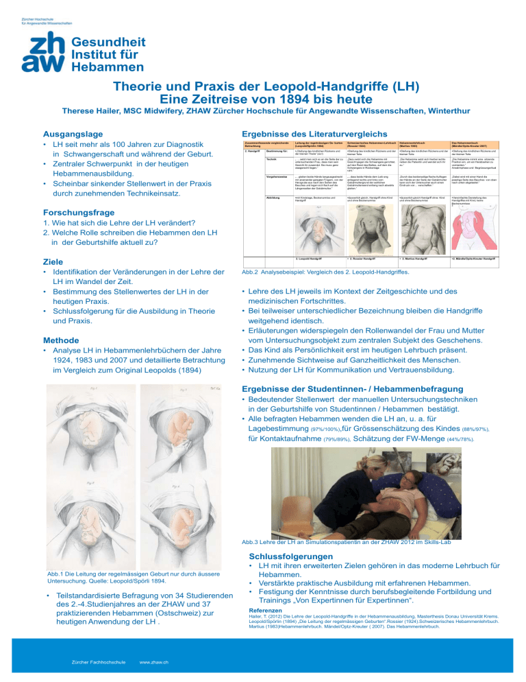 Gesundheit Institut für Hebammen Theorie und Praxis der Leopold-Handgriffe (LH) Eine Zeitreise von 1894 bis heute Therese Hailer, MSC Midwifery, ZHAW Zürcher Hochschule für Angewandte Wissenschaften, Winterthur Ergebnisse des Literaturvergleichs Ausgangslage • LH seit mehr als 100 Jahren zur Diagnostik in Schwangerschaft und während der Geburt. • Zentraler Schwerpunkt in der heutigen Hebammenausbildung. • Scheinbar sinkender Stellenwert in der Praxis durch zunehmenden Technikeinsatz. Zusammenfassende vergleichende Betrachtung 2. Handgriff Leitung der regelmässigen Ge- burten (Leopold/Spörlin 1894) Schweizerisches Hebammen-Lehrbuch (Rossier 1924) Hebammenlehrbuch (Martius 1983) Das Hebammenbuch (Mändle/Opitz-Kreuter 2007) Bestimmung für: „Stellung des kindlichen Rückens und der kleinen Theile“ (sic!) Stellung des kindlichen Rückens und der kleinen Teile Stellung des kindlichen Rückens und der kleinen Teile Stellung des kindlichen Rückens und der kleinen Teile Technik „ ….setzt man sich so an die Seite der zu untersuchenden Frau, dass man sein Gesicht ihr zuwendet. Sie muss ganz waagerecht liegen.“ „Dazu setzt sich die Hebamme mit Gesicht gegen die Schwangere gerichtet, auf den Rand des Bettes, auf dem die Schwangere in Rückenlage ruht.“ „Die Hebamme setzt sich hierbei rechts neben die Patientin und wendet sich ihr zu.“ „Die Hebamme nimmt eine sitzende Position ein, um ein Herabsehen zu vermeiden.“ Anwärmphase und Begrüssungsritual Vorgehensweise „…gleiten beide Hände langausgestreckt mit aneinander gelegten Fingern, von der Herzgrube aus nach den Seiten des Bauches und legen sich flach auf die Längenseiten der Gebärmutter.“ „...dass beide Hände dem Leib eng anliegend rechts und links vom Gebärmuttergrund der seitlichen Gebärmutterwand entlang nach abwärts gleiten.“ „Durch das beiderseitige flache Auflegen der Hände an der Seite der Gebärmutter kann sich der Untersucher auch einen Eindruck von… verschaffen.“ „Dabei wird mit einer Hand die jeweilige Seite des Bauches von oben nach unten abgetastet.“ Abbildung mit Kindslage, Beckenumriss und Handgriff äusserlich gleich, Handgriff ohne Kind und ohne Beckenumriss äusserlich gleich Handgriff ohne Kind und ohne Beckenumriss Vereinfachte Darstellung des Handgriffes mit Kind, keine Beckenumrisse 2. Leopold Handgriff 2. Rossier Handgriff 2. Martius Handgriff 2. Mändle/Opitz-Kreuter Handgriff Forschungsfrage 1. Wie hat sich die Lehre der LH verändert? 2. Welche Rolle schreiben die Hebammen den LH in der Geburtshilfe aktuell zu? Ziele • Identifikation der Veränderungen in der Lehre der LH im Wandel der Zeit. • Bestimmung des Stellenwertes der LH in der heutigen Praxis. • Schlussfolgerung für die Ausbildung in Theorie und Praxis. Methode • Analyse LH in Hebammenlehrbüchern der Jahre 1924, 1983 und 2007 und detaillierte Betrachtung im Vergleich zum Original Leopolds (1894) Abb.2 Analysebeispiel: Vergleich des 2. Leopold-Handgriffes. • Lehre des LH jeweils im Kontext der Zeitgeschichte und des medizinischen Fortschrittes. • Bei teilweiser unterschiedlicher Bezeichnung bleiben die Handgriffe weitgehend identisch. • Erläuterungen widerspiegeln den Rollenwandel der Frau und Mutter vom Untersuchungsobjekt zum zentralen Subjekt des Geschehens. • Das Kind als Persönlichkeit erst im heutigen Lehrbuch präsent. • Zunehmende Sichtweise auf Ganzheitlichkeit des Menschen. • Nutzung der LH für Kommunikation und Vertrauensbildung. Ergebnisse der Studentinnen- / Hebammenbefragung • Bedeutender Stellenwert der manuellen Untersuchungstechniken in der Geburtshilfe von Studentinnen / Hebammen bestätigt. • Alle befragten Hebammen wenden die LH an, u. a. für Lagebestimmung (97%/100%),für Grössenschätzung des Kindes (88%/97%), für Kontaktaufnahme (79%/89%), Schätzung der FW-Menge (44%/78%). Abb.3 Lehre der LH an Simulationspatientin an der ZHAW 2012 im Skills-Lab Schlussfolgerungen Abb.1 Die Leitung der regelmässigen Geburt nur durch äussere Untersuchung. Quelle: Leopold/Spörli 1894. • Teilstandardisierte Befragung von 34 Studierenden des 2.-4.Studienjahres an der ZHAW und 37 praktizierenden Hebammen (Ostschweiz) zur heutigen Anwendung der LH . Zürcher Fachhochschule www.zhaw.ch • LH mit ihren erweiterten Zielen gehören in das moderne Lehrbuch für Hebammen. • Verstärkte praktische Ausbildung mit erfahrenen Hebammen. • Festigung der Kenntnisse durch berufsbegleitende Fortbildung und Trainings „Von Expertinnen für Expertinnen“. Referenzen Hailer, T. (2012) Die Lehre der Leopold-Handgriffe in der Hebammenausbildung, Masterthesis Donau Universität Krems. Leopold/Spörlin (1894) „Die Leitung der regelmässigen Geburten“.Rossier (1924).Schweizerisches Hebammenlehrbuch. Martius (1983)Hebammenlehrbuch. Mändel/Optz-Kreuter ( 2007). Das Hebammenlehrbuch.