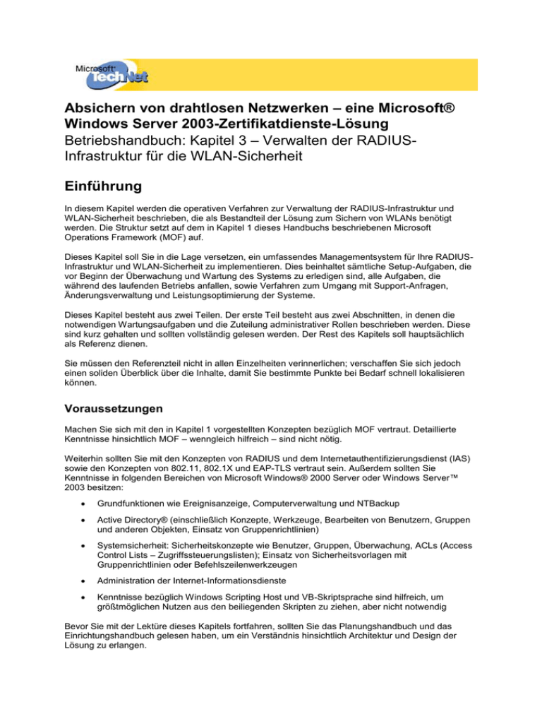 Absichern von drahtlosen Netzwerken – eine Microsoft® Windows Server 2003-Zertifikatdienste-Lösung Betriebshandbuch: Kapitel 3 – Verwalten der RADIUSInfrastruktur für die WLAN-Sicherheit Einführung In diesem Kapitel werden die operativen Verfahren zur Verwaltung der RADIUS-Infrastruktur und WLAN-Sicherheit beschrieben, die als Bestandteil der Lösung zum Sichern von WLANs benötigt werden. Die Struktur setzt auf dem in Kapitel 1 dieses Handbuchs beschriebenen Microsoft Operations Framework (MOF) auf. Dieses Kapitel soll Sie in die Lage versetzen, ein umfassendes Managementsystem für Ihre RADIUSInfrastruktur und WLAN-Sicherheit zu implementieren. Dies beinhaltet sämtliche Setup-Aufgaben, die vor Beginn der Überwachung und Wartung des Systems zu erledigen sind, alle Aufgaben, die während des laufenden Betriebs anfallen, sowie Verfahren zum Umgang mit Support-Anfragen, Änderungsverwaltung und Leistungsoptimierung der Systeme. Dieses Kapitel besteht aus zwei Teilen. Der erste Teil besteht aus zwei Abschnitten, in denen die notwendigen Wartungsaufgaben und die Zuteilung administrativer Rollen beschrieben werden. Diese sind kurz gehalten und sollten vollständig gelesen werden. Der Rest des Kapitels soll hauptsächlich als Referenz dienen. Sie müssen den Referenzteil nicht in allen Einzelheiten verinnerlichen; verschaffen Sie sich jedoch einen soliden Überblick über die Inhalte, damit Sie bestimmte Punkte bei Bedarf schnell lokalisieren können. Voraussetzungen Machen Sie sich mit den in Kapitel 1 vorgestellten Konzepten bezüglich MOF vertraut. Detaillierte Kenntnisse hinsichtlich MOF – wenngleich hilfreich – sind nicht nötig. Weiterhin sollten Sie mit den Konzepten von RADIUS und dem Internetauthentifizierungsdienst (IAS) sowie den Konzepten von 802.11, 802.1X und EAP-TLS vertraut sein. Außerdem sollten Sie Kenntnisse in folgenden Bereichen von Microsoft Windows® 2000 Server oder Windows Server™ 2003 besitzen: Grundfunktionen wie Ereignisanzeige, Computerverwaltung und NTBackup Active Directory® (einschließlich Konzepte, Werkzeuge, Bearbeiten von Benutzern, Gruppen und anderen Objekten, Einsatz von Gruppenrichtlinien) Systemsicherheit: Sicherheitskonzepte wie Benutzer, Gruppen, Überwachung, ACLs (Access Control Lists – Zugriffssteuerungslisten); Einsatz von Sicherheitsvorlagen mit Gruppenrichtlinien oder Befehlszeilenwerkzeugen Administration der Internet-Informationsdienste Kenntnisse bezüglich Windows Scripting Host und VB-Skriptsprache sind hilfreich, um größtmöglichen Nutzen aus den beiliegenden Skripten zu ziehen, aber nicht notwendig Bevor Sie mit der Lektüre dieses Kapitels fortfahren, sollten Sie das Planungshandbuch und das Einrichtungshandbuch gelesen haben, um ein Verständnis hinsichtlich Architektur und Design der Lösung zu erlangen. Übersicht Im Folgenden werden die Hauptabschnitte dieses Kapitels beschrieben. Notwendige Wartungsaufgaben – enthält zwei Tabellen mit den Aufgaben zur Bereitstellung des Managementsystems und dessen Instandhaltung. Administrative Rollen – beschreibt die administrativen Rollen, die in dieser Lösung verwendet werden, deren Aufgabenbereiche und Zuordnungen zu MOF-Teamrollen und administrativen Sicherheitsgruppen. Aufgaben Betrieb – beinhaltet alle Aufgaben, die bei der Wartung der RADIUS-Infrastruktur und der WLAN-Sicherheit anfallen, z.B. Überwachung, Sicherung, verzeichnis- und sicherheitsbezogene Aufgaben. Aufgaben Support – beinhaltet Verfahren zur Lösung von Systemproblemen. Dies beinhaltet die Wiederherstellung aus einer Sicherung und Verfahren zum Umgang mit einem fehlerhaften IAS-Server. Aufgaben Optimierung – beinhaltet Verfahren zur Planung von Kapazitäten. Aufgaben Änderung – beinhaltet allgemeine Aufgaben zu Veränderungen an der Konfiguration des IAS-Servers und deren Überführung in die Produktivumgebung. Außerdem finden Sie hier Verfahren zum Auslesen und Warten der Konfiguration des IAS-Servers. Problembehandlung – beinhaltet Verfahren zur Behandlung von Problemen, die im Zusammenhang mit einer RADIUS-Infrastruktur auftreten können. Außerdem finden Sie hier Beschreibungen von hilfreichen Werkzeugen zur Problembehandlung und Verfahren zur Protokollierung verschiedener Komponenten. Weiterführende Informationen – beinhaltet eine Liste zusätzlicher Informationsquellen. Notwendige Wartungsaufgaben In diesem Teil finden Sie Listen mit den notwendigen Aufgaben zur Aufrechterhaltung Ihrer RADIUSInfrastruktur. Diese Aufgaben sind in zwei Tabellen aufgeführt: Einmalige Aufgaben vor und während des Setup und fortlaufende Aufgaben im Betrieb. Die Aufgaben werden später detaillierter im Text beschrieben. Die Gruppierung der Aufgaben erfolgt nach Quadranten- und Service-ManagementFunktionen (SMF) des MOF. Erste Setup-Aufgaben In dieser Tabelle sind die für die Inbetriebnahme Ihrer RADIUS-Infrastruktur und WLAN-Sicherheit notwendigen Aufgaben aufgelistet. Abhängig von den von Ihnen verwendeten Standards und Praktiken ist es denkbar, dass Sie nicht alle Aufgaben durchführen müssen; Sie sollten sich die Beschreibungen durchlesen und dann entscheiden. Andere Aufgaben wiederum müssen unter Umständen zu einem späteren Zeitpunkt erneut ausgeführt werden, z.B. müssen Sie im Falle der Bereitstellung eines neuen IAS-Servers die Sicherung und Überwachung erneut konfigurieren. Tabelle 1 – Erste Setup-Aufgaben Aufgabenname Rollencluster MOF SMF RADIUS-Clients auf dem IAS-Server hinzufügen Infrastruktur Netzwerkadministration Computer zu den WLAN-Richtliniengruppen hinzufügen Infrastruktur Verzeichnisdienstadministration Benutzer zu den RAS-Richtliniengruppen hinzufügen Infrastruktur Verzeichnisdienstadministration Kategorisierung von Überwachungswarnmeldungen Infrastruktur Dienstüberwachung und steuerung Betrieb Überwachung von Kapazitätsengpässen der Zertifikatdienste Infrastruktur Dienstüberwachung und steuerung Export der IAS-Konfiguration konfigurieren Betrieb Storage-Ma
