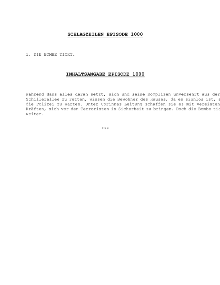 SCHLAGZEILEN EPISODE 1000 1. DIE BOMBE TICKT. INHALTSANGABE EPISODE 1000 Während Hans alles daran setzt, sich und seine Komplizen unversehrt aus der Schillerallee zu retten, wissen die Bewohner des Hauses, da es sinnlos ist, a die Polizei zu warten. Unter Corinnas Leitung schaffen sie es mit vereinten Kräften, sich vor den Terroristen in Sicherheit zu bringen. Doch die Bombe tic weiter. *** BABY CECILIA BACH Darsteller Kategorie: Ab Block : Bis Block : Alter : Beziehung z. Serie : 1000 202 Ab Folge: 202 Neugeborenes Tochter von Corinna und Chris, die während der Geiselnahme zur Welt kommt. Aussehen + Typ : Rot, schrumpelig. Rollen Profil : Liebenswert Kleidung : Bettuch Gagen Kategorie : HERBERT KUPFER Darsteller Kategorie: 1000 Ab Block : 202 Ab Folge: Bis Block : 202 Alter : Ca. 30 Beziehung z. Spezialist, der die Bombe Serie : entschärft. Aussehen + Typ : Schlank, sportlich. Rollen Profil : Profi, der Rolle angemessen sachlich Kleidung : Arbeitskleidung Gagen Kategorie : 1000 . 01 T6 0'20" SCHILLER REBECCA MATTERN VIKTOR FALKENBERG ANDREAS SANDMANN JOSEF PATZEK DIRK FISCHER SEK-LER O.T. POLIZISTEN O.T. SANITÄTER O.T. MORGEN Direkter Anschluß an 999.30/31 TOTENSTILLE. REBECCA LEGT DEN HÖRER AUF. PATZEK ATMET HÖRBAR AUS. FISCHER SITZT MIT AUSDRUCKSLOSEM GESICHT AUF SEINEM STUHL. IN DIESEM MOMENT STÜRMEN VIKTOR UND ANDREAS DURCH DIE TÜR. EIN SEK-LER WILL SIE AUFHALTEN. VIKTOR SCHIEBT IHN BARSCH BEISEITE. 1. VIKTOR Aus dem Weg, bevor ich mich vergesse! ANDREAS STÜRMT SOFORT AUF FISCHER ZU, PACKT IHN AM KRAGEN. 2. ANDREAS Was haben Sie da angerichtet? Schieöwütiger Idiot! PATZEK ZIEHT ANDREAS SCHNELL WEG. 3. PATZEK Herr Sandmann, bitte. PATZEK WENDET SICH AN FISCHER. 4. PATZEK So, und jetzt übernehme ich die Einsatzleitung. 5. FISCHER (MÖRBE) Okay, wie Sie meinen. FISCHER NIMMT LANGSAM SEIN HEADSET VOM KOPF, LEGT ES AUF DEN TISCH. *** 1000 . 02 T6 0'50" DACHWOHNUNG WOHNBEREICH HANS REBERG ASTRID VON BODENBACH TOTE GANGSTER O.T. TOTE SEK-LER O.T. 2 GANGSTER O.T. WOLFGANG WEIGEL MARGOT WEIGEL NICK WEIGEL UTE KIEFER CLAUDIA FALKENBERG ALEXA FALKENBERG JESSICA FALKENBERG SEBASTIAN SANDMANN SUE SOMMERFELD CARO MATTERN TOM FOSTER LAURA BÖHME MORGEN DIE GEFANGENEN STARREN WIE IN TRANCE AUF DIE TÜR, EINIGE WEINEN, LAURA LIEGT APATHISCH IN MARGOTS SCHOSS. REBERG KOMMT MIT SCHNELLEN, ABGEHACKTEN SCHRITTEN HEREIN, IN SEINEN AUGEN DIE KALTE WUT. IM EINGANGSBEREICH LIEGEN DIE LEICHEN VON ZWEI SEK-LERN. HINTER REBERG FOLGT ASTRID MIT EINEM RUCKSACK. 1. REBERG Wieviele sind übrig? 2. ASTRID Wir beide, Hagen, Wassili und Ernst. HINTER ASTRID UND REBERG KOMMEN ZWEI GANGSTER HEREIN. DER EINE HAT EINEN STREIFSCHUSS AM ARM, DER ANDERE HUMPELT. 3. SUE (VERZWEIFELT) Warum geben Sie nicht endlich auf? Bevor es noch mehr Tote gibt?! REBERG BEACHTET SUE NICHT, WENDET SICH AN DIE BEIDEN GANGSTER. 4. REBERG Schafft die Leichen weg. Wassili, du sicherst das Foyer. Wenn sich jemand dem Haus nähert: sofort feuern. DIE BEIDEN GANGSTER NICKEN, BEGINNEN, DIE LEICHEN AUS DER WOHNUNG ZU ZIEHEN. 5. REBERG (ZU ASTRID) Du gehst hoch und machst den Sprengsatz auf dem Dach klar. Ich will, dass hier kein Stein auf dem anderen bleibt. ENTSETZTES RAUNEN GEHT DURCH DIE GRUPPE DER GEFANGENEN. ASTRID VERLÄSST DEN RAUM. 6. WOLFGANG Das ... das können Sie doch nicht machen. REBERG IGNORIERT WOLFGANG, NESTELT AN SEINEM HEADSET. 7. REBERG Hagen? Hörst du mich? ... Bring her, was von den Leuten unten noch übrig ist. Es soll alle erwischen, wenn das Dach in die Luft geht. UNTER DEN GEFANGENEN BRICHT PANIK AUS. 8. UTE Der bringt uns um, der bringt uns eiskalt um. REBERG WENDET SICH AN DIE GRUPPE. 9. REBERG (BELLT) Bedankt euch bei der Polizei! Die haben meinen Bruder getötet. Dafür bezahlt Ihr jetzt. Mit eurem Blut! BLANKES ENTSETZEN MACHT SICH BREIT. *** 1000 . 03 T6 / 04 0'45" KRANKENHAUS KRANKENZIMMER/ WECHSELSCHNITT/ A.D. EXT. STRASSE KLARA BOSBACH PROF. XAVER BOSBACH TV REPORTER (WOLFRAM KONS) PRESSE O.T. SCHAULUSTIGE O.T. POLIZISTEN O.T. MORGEN KLARA SITZT IN IHREM KLEID AUF DEM BETT, VOLLSTÄNDIG GESCHMINKT. SIE HAT DIE TABLETTEN IN DAS WASSERGLAS GESCHÜTTET, SIEHT VERKLÄRT HINAB IN DIE MILCHIG WEISSE FLÜSSIGKEIT. 1. KLARA Lebwohl, Roman ... irgendwann sehen wir uns wieder ... KLARA HEBT DAS GLAS ZUM MUND. IHRE LIPPEN BERÜHREN DEN RAND. KLARA SCHLIESST DIE AUGEN ... IN DIESEM MOMENT KOMMT BOSBACH OHNE ANZUKLOPFEN HEREINGESTÜRMT. 2. BOSBACH Klara! Schnell! Mach den Fernseher an! VOR SCHRECK VERSCHÜTTET KLARA DAS GLAS. DIE FLÜSSIGKEIT LÄUFT IN IHR BETT. BOSBACH BEMERKT ES NICHT, NIMMT AUFGEREGT DIE FERNBEDIENUNG, SCHALTET DEN FERNSEHER EIN. 3. BOSBACH In der Schillerallee ist etwas Furchtbares passiert. IN DIESEM MOMENT ERSCHEINT DER REPORTER AUF DER MATTSCHEIBE. / WECHSELSCHNITT (IM ERMESSEN DER REGIE) 4. REPORTER ... soeben wurde bekannt, dass bei dem gescheiterten Zugriff der Polizei mindestens sechs Mitglieder einer Spezialeinheit ums Leben gekommen sind. Über Opfer unter den Geiseln liegen bislang keine Informationen vor. Wie aus Polizeikreisen verlautete, kam es zu der Katastrophe, weil die Geiselnehmer sogenannte ‘Cop-Killer-Munition‘ benutzten. Es handelt sich dabei um Spezialgeschosse, die ausschliesslich vom Militär verwendet werden ... KLARA LEGT SICH BETROFFEN DIE HAND VOR DEN MUND. 5. KLARA Mein Gott ... Roman ... MIT EINEM SATZ SPRINGT KLARA AUS DEM BETT. 6. KLARA Ich muss da hin! 7. BOSBACH (BESCHWICHTIGEND) Klara. 8. KLARA Komm! KLARA NIMMT EINE JACKE, ZIEHT SIE AN. *** 1000 . 05 T6 / 06 4'10" DACHWOHNUNG WOHNBEREICH / WECHSELSCHNITT / SCHILLER HANS REBERG HAGEN WOLFGANG WEIGEL MARGOT WEIGEL IRENE WEIGEL ANNA WEIGEL NICK WEIGEL UTE KIEFER CORINNA BACH CLAUDIA FALKENBERG ALEXA FALKENBERG JESSICA FALKENBERG LONA DEE SEBASTIAN SANDMANN ROMAN KLINGENBERG SUE SOMMERFELD KAI FLEMING CARO MATTERN TOM FOSTER LAURA BÖHME REBECCA MATTERN VIKTOR FALKENBERG ANDREAS SANDMANN JOSEF PATZEK POLIZISTEN O.T. SANITÄTER O.T. SEK-LER O.T. MORGEN REBERG STEHT MIT GEZOGENER WAFFE AN DER TÜR, SIEHT HINA
