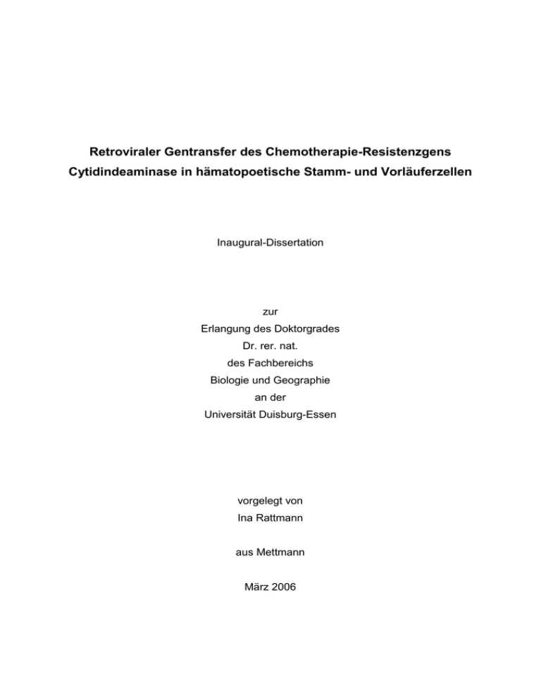 Retroviraler Gentransfer des Chemotherapie-Resistenzgens Cytidindeaminase in hämatopoetische Stamm- und Vorläuferzellen Inaugural-Dissertation zur Erlangung des Doktorgrades Dr. rer. nat. des Fachbereichs Biologie und Geographie an der Universität Duisburg-Essen vorgelegt von Ina Rattmann aus Mettmann März 2006 Die der vorliegenden Arbeit zugrundeliegenden Experimente wurden an der Inneren Klinik (Tumorforschung), Direktor Prof. Dr. S. Seeber, der Universität Duisburg-Essen durchgeführt. 1. Gutachter: Prof. Dr. B. Opalka 2. Gutachter: PD. Dr. L. Klein-Hitpass 3. Gutachter: Vorsitzender des Prüfungsausschusses: Tag der mündlichen Prüfung: Prof. Dr. P. Bayer Tag der mündlichen Prüfung: 26. Juli 2006 Inhaltsverzeichnis Abkürzungsverzeichnis.............................................................................................6 Abbildungsverzeichnis..............................................................................................9 Tabellenverzeichnis.................................................................................................11 1 Einleitung...................................................................................................... 12 1.1 Hämatopoetische Zellen als Zielzellen für die Gentherapie ..................... 12 1.1.1 1.1.2 1.1.3 1.1.4 1.1.5 1.2 1.2.1 1.2.2 1.2.3 1.3 1.3.1 1.3.2 1.3.3 Gentherapeutische Anwendungen ........................................................... 12 Chemotherapie-Resistenzgene ................................................................ 14 Selektion hämatopoetischer Zellen mittels Chemotherapie-Resistenzgene ................................................................................................................. 15 Aufbau des hämatopoetischen Systems .................................................. 16 Charakterisierung hämatopoetischer Stammzellen .................................. 17 Gentransfer mittels C-Typ-retroviraler Vektoren ....................................... 19 Aufbau und Lebenszyklus eines C-Typ-Retrovirus ................................... 19 Genomische Struktur C-Typ-retroviraler Gentherapie-Vektoren ............... 21 Retrovirale Verpackungszelllinien ............................................................. 23 Cytidindeaminase ........................................................................................ 25 Funktion als Chemotherapie-Resistenzgen .............................................. 25 Physiologische Eigenschaften der CDD ................................................... 25 AraC und Gemcitabin als Substrat der Cytidindeaminase ........................ 26 1.4 Ziel der Arbeit ............................................................................................... 29 2 Material und Methoden ................................................................................ 31 2.1 Material ......................................................................................................... 31 2.1.1 2.1.2 2.1.3 2.1.4 2.1.5 2.1.6 2.1.7 2.1.8 2.2 2.2.1 2.2.2 2.2.3 2.2.4 Chemikalien und Reagenzien ................................................................... 31 Zellkulturmedien und Zusätze................................................................... 31 Antikörper ................................................................................................. 32 Wachstumsfaktoren .................................................................................. 32 Puffer und Lösungen ................................................................................ 32 Geräte ...................................................................................................... 33 Primäre Zellen, Zelllinien und Tiere .......................................................... 34 Retrovirale Vektoren ................................................................................. 34 Molekularbiologische Methoden................................................................. 35 Transformation kompetenter E. coli-Bakterien des Stammes DH5 ........ 35 Plasmidpräparation aus Bakterien ............................................................ 35 DNA Agarosegelelektrophorese ............................................................... 36 Konzentrations- und Reinheitsbestimmung von DNA ............................... 36 Inhaltsverzeichnis 2.3 2.3.1 2.3.2 2.3.3 2.3.4 2.3.5 2.4 Zellbiologische Standardmethoden ........................................................... 36 Kultivierung von Zellen ............................................................................. 36 Kryokulturen ............................................................................................. 37 Durchflusszytometrie ................................................................................ 37 Antikörperfärbung ..................................................................................... 38 Beschichtung der Zellkulturgefäße mit RetroNektin ................................ 38 Generierung einer stabilen Produzentenzelllinie zur Produktion hochtitriger Virusüberstände ...................................................................... 38 2.4.1 2.4.2 2.4.3 2.4.4 2.4.5 2.5 Transduktion von FNX-eco-Zellen mit GALV-Überständen ...................... 38 Anreicherung transduzierter FNX-eco-Zellen ........................................... 39 Selektion einzelner Produzentenzellklone ................................................ 39 Produktion retroviraler Überstände ........................................................... 40 Titration retroviraler Überstände ............................................................... 40 In vitro-Analysen zur CDD-vermittelten Zytostatikaresistenz in humanen CD34+-Zellen ................................................................................................. 41 2.5.1 2.5.2 2.5.3 2.5.4 2.5.5 2.6 2.6.1 2.6.2 2.6.3 2.6.4 2.6.5 2.6.6 2.6.7 2.6.8 Isolierung humaner CD34+-Zel