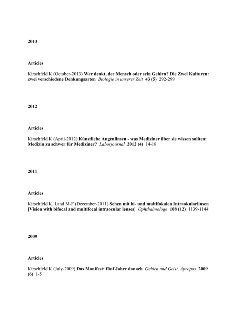 2013 Articles Kirschfeld K (October-2013) Wer denkt, der Mensch oder sein Gehirn? Die Zwei Kulturen: zwei verschiedene Denkungsarten Biologie in unserer Zeit 43 (5) 292-299 2012 Articles Kirschfeld K (April-2012) Künstliche Augenlinsen - was Mediziner über sie wissen sollten: Medizin zu schwer für Mediziner? Laborjournal 2012 (4) 14-18 2011 Articles Kirschfeld K, Land M-F (December-2011) Sehen mit bi- und multifokalen Intraokularlinsen [Vision with bifocal and multifocal intraocular lenses] Ophthalmologe 108 (12) 1139-1144 2009 Articles Kirschfeld K (July-2009) Das Manifest: fünf Jahre danach Gehirn und Geist, Apropos 2009 (6) 1-5 Kirschfeld K, Kunze P (2009) Nachruf auf Klaus Vogt Zoologie 2009 51-55 2008 Articles Kirschfeld K (June-2008) Relationship between the amplitude of alpha waves and reaction time Neuroreport 19 (9) 907-910 Kirschfeld K (January-2008) Conservative Treatment of Benign Prostatic Hyperplasia: The Use of Mucolytics Deutsches Ärzteblatt International 105 (3) 53 Kirschfeld K (January-2008) Konservative Behandlung des benignen Prostatasyndroms: Einsatz eines Mukolytikums Deutsches Ärzteblatt 105 (3) 53 Contributions to books Kirschfeld K Die Hierarchie von Gehirn und Geist 243-268 In: Was bedeutet Leben?: Beiträge aus den Geisteswissenschaften (Ed) Baumann, U. Lembeck, Frankfurt a. M., Germany (2008) 2007 Articles Bär S, Kirschfeld K (March-2007) Fallbeispiel eines Fallbeispiels: Erfahrungen eines Biologen mit einer medizinischen Hypothese Laborjournal 2007 (3) 14-18 Pupular Scientific Articles () 2006 Articles Kirschfeld K (November-2006) Leserbrief zu "Chronische Prostatitis: Finden wir einen Ausweg aus dem Dilemma?" Der Urologe 1-3 Kirschfeld K (April-2006) Stopping motion and the flash-lag effect Vision Research 46 (8-9) 1547-1551 Kirschfeld K (January-2006) Behandlung bei chronisch abakterieller Prostatitis mit einem Mukolytikum Der Urologe 1-8 Posters Kirschfeld K (March-2006) The Hierarchy of Brain and Mind 9th Tübingen Perception Conference (TWK 2006) Tübingen, Germany 2005 Articles Kirschfeld K (February-2005) The physical basis of alpha waves in the electroencephalogram and the origin of the "Berger effect" Biological Cybernetics 92 (3) 177-185 Hentschke H, Schwarz C, Antkowiak B (January-2005) Neocortex is the major target of sedative concentrations of volatile anesthetics: strong depression of firing rates and increase of GABAA receptor-mediated inhibition European Journal of Neuroscience 21 (1) 93-102 Kammer T, Puls K, Strasburger H, Hill NJ, Wichmann FA (January-2005) Transcranial magnetic stimulation in the visual system: I. The psychophysics of visual suppression Experimental Brain Research 160 (1) 118-128 Kammer T, Puls K, Erb M, Grodd W (January-2005) Transcranial magnetic stimulation in the visual system: II. Characterization of induced phosphenes and scotomas Experimental Brain Research 160 (1) 129-140 Kirschfeld K (2005) Successful treatment of prostatitis syndrome with a mucolyticum World Journal of Urology 1-7 Posters Kirschfeld K (May-2005) Alpha Waves: A new tool to investigate visual attention with high temporal resolution Annual Meeting of the Association for Research in Vision and Ophthalmology (ARVO 2005) Fort Lauderdale, FL, USA Investigative Ophthalmology & Visual Science 46 (Supplement) B857 2004 Articles Kirschfeld K (November-2004) Complex functions of the brain Zoology 104 (3-4) 256-267 Posters Kirschfeld K (October-2004) Linear and nonlinear components in alpha waves of the EEG and in visually evoked potentials (VEPs) 34th Annual Meeting of the Society for Neuroscience (Neuroscience 2004) San Diego, CA, USA Kirschfeld K (February-2004) Can Visual Stimuli Affect the Phase of Brain Oscillations? 7th Tübingen Perception Conference (TWK 2004) Tübingen, Germany 2003 Articles Kammer T, Scharnowski F, Herzog MH (June-2003) Combining backward masking and transcranial magnetic stimulation in human observers Neuroscience Letters 343 (3) 171174 Nijhawan R, Kirschfeld K (April-2003) Analogous Mechanisms Compensate for Neural Delays in the Sensory and the Motor Pathways: Evidence from Motor Flash-Lag Current Biology 13 (9) 749-753 Contributions to books Karnath H-O, Kammer T Manifestationen von Frontalhirnschädigungen 515-528 In: Neuropsychologie (Ed) Karnath, H.-O. , P. Thier Springer, Berlin, Germany (2003) 2002 Articles Kammer T, Rehberg B, Menne D, Wartenberg HC, Wenningmann I, Urban BW (December2002) Propofol and Sevoflurane in Subanesthetic Concentrations Act Preferentially on the Spinal Cord: Evidence from Multimodal Electrophysiological Assessment Anesthesiology 97 (6) 1416-1425 Thielscher A, Kammer T (November-2002) Linking physics with physiology in TMS: A sphere field model to determinethe cortical stimulation site in TMS Neuroimage 17 (3) 1117-1130 Kammer T, Beck S (August-2002) Phosphene thresholds evoked by transcranial magnetic stimulation are insensitive to short-lasting variations in ambient light Experimental Brain Research 145 (3) 407-410 Antkowiak B (July-2002) In vitro networks: cortical mechanisms of anaesthetic action British Journal of Anaesthesia 89 (1) 102-111 Posters Saur R, Scharnowski F, Kammer T (March-2002) Wie kann man räumliches Arbeitsgedächtnis exakt vermessen? 44. Tagung Experimentell Arbeitender Psychologen (TeaP 2002) Chemnitz, Germany Experimentelle Psychologie 44 193 Vorwerg M, Kammer T (February-2002) Der Flash-lag Effekt: Lässt sich eine neuronale Latenzdifferenz für die Wahrnehmung bewegter und geblitzter visueller Reize mit TMS nachweisen? 5. Tübinger Wahrnehmungskonferenz (TWK 2002) Tübingen, Germany Saur R, Erb M, Grodd W, Kammer T (February-2002) Gibt es doch eine modalitätspezifsche Segregation despräfrontalen Kortex?: Eine fMRI-Studie 5. Tübinger Wahrnehmungskonferenz (TWK 2002) Tübingen, Germany Puls K, Kammer T (February-2002) Maskierung visueller Reize durch Magnetstimulation in zwei Zeitperioden 5. Tübinger Wahrnehmungskonferenz (TWK 2002) Tübingen, Germany 2001 Article