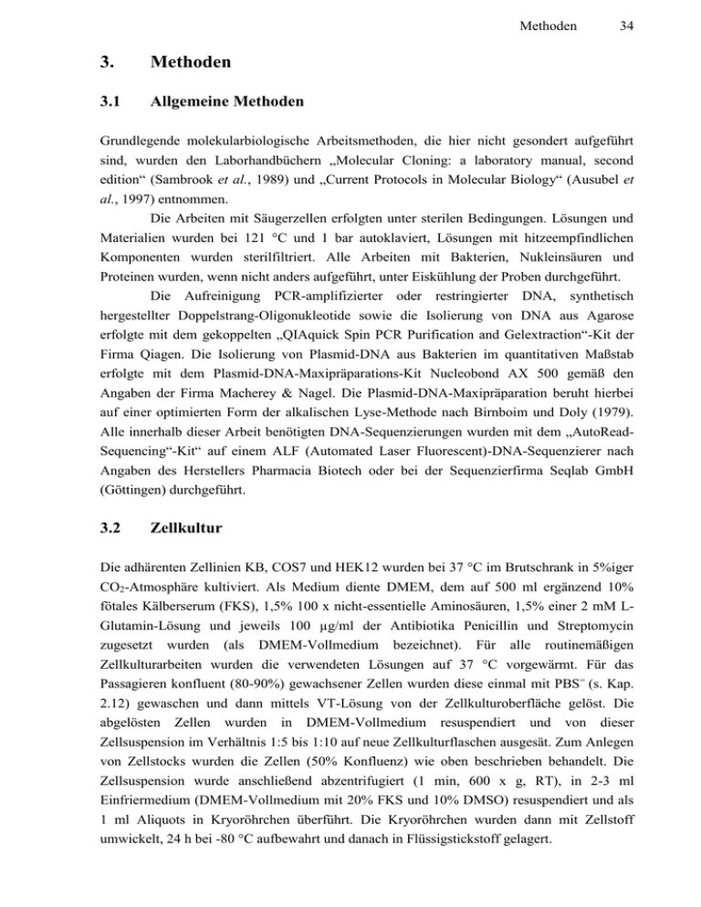 Methoden 3. Methoden 3.1 Allgemeine Methoden 34 Grundlegende molekularbiologische Arbeitsmethoden, die hier nicht gesondert aufgeführt sind, wurden den Laborhandbüchern „Molecular Cloning: a laboratory manual, second edition“ (Sambrook et al., 1989) und „Current Protocols in Molecular Biology“ (Ausubel et al., 1997) entnommen. Die Arbeiten mit Säugerzellen erfolgten unter sterilen Bedingungen. Lösungen und Materialien wurden bei 121 °C und 1 bar autoklaviert, Lösungen mit hitzeempfindlichen Komponenten wurden sterilfiltriert. Alle Arbeiten mit Bakterien, Nukleinsäuren und Proteinen wurden, wenn nicht anders aufgeführt, unter Eiskühlung der Proben durchgeführt. Die Aufreinigung PCR-amplifizierter oder restringierter DNA, synthetisch hergestellter Doppelstrang-Oligonukleotide sowie die Isolierung von DNA aus Agarose erfolgte mit dem gekoppelten „QIAquick Spin PCR Purification and Gelextraction“-Kit der Firma Qiagen. Die Isolierung von Plasmid-DNA aus Bakterien im quantitativen Maßstab erfolgte mit dem Plasmid-DNA-Maxipräparations-Kit Nucleobond AX 500 gemäß den Angaben der Firma Macherey & Nagel. Die Plasmid-DNA-Maxipräparation beruht hierbei auf einer optimierten Form der alkalischen Lyse-Methode nach Birnboim und Doly (1979). Alle innerhalb dieser Arbeit benötigten DNA-Sequenzierungen wurden mit dem „AutoReadSequencing“-Kit“ auf einem ALF (Automated Laser Fluorescent)-DNA-Sequenzierer nach Angaben des Herstellers Pharmacia Biotech oder bei der Sequenzierfirma Seqlab GmbH (Göttingen) durchgeführt. 3.2 Zellkultur Die adhärenten Zellinien KB, COS7 und HEK12 wurden bei 37 °C im Brutschrank in 5%iger CO2-Atmosphäre kultiviert. Als Medium diente DMEM, dem auf 500 ml ergänzend 10% fötales Kälberserum (FKS), 1,5% 100 x nicht-essentielle Aminosäuren, 1,5% einer 2 mM LGlutamin-Lösung und jeweils 100 µg/ml der Antibiotika Penicillin und Streptomycin zugesetzt wurden (als DMEM-Vollmedium bezeichnet). Für alle routinemäßigen Zellkulturarbeiten wurden die verwendeten Lösungen auf 37 °C vorgewärmt. Für das Passagieren konfluent (80-90%) gewachsener Zellen wurden diese einmal mit PBS= (s. Kap. 2.12) gewaschen und dann mittels VT-Lösung von der Zellkulturoberfläche gelöst. Die abgelösten Zellen wurden in DMEM-Vollmedium resuspendiert und von dieser Zellsuspension im Verhältnis 1:5 bis 1:10 auf neue Zellkulturflaschen ausgesät. Zum Anlegen von Zellstocks wurden die Zellen (50% Konfluenz) wie oben beschrieben behandelt. Die Zellsuspension wurde anschließend abzentrifugiert (1 min, 600 x g, RT), in 2-3 ml Einfriermedium (DMEM-Vollmedium mit 20% FKS und 10% DMSO) resuspendiert und als 1 ml Aliquots in Kryoröhrchen überführt. Die Kryoröhrchen wurden dann mit Zellstoff umwickelt, 24 h bei -80 °C aufbewahrt und danach in Flüssigstickstoff gelagert. Methoden 3.3 35 Transfektion eukaryontischer Zellen Die Transfektion eukaryontischer Zellen erfolgte mittels liposomaler Transfektionsreagenzien (Lipofektion, s. Kap. 3.3.1) oder durch Elektroporation (s. Kap. 3.3.2). 3.3.1 Lipofektion Die Transfektion eukaryontischer Zellen unter Verwendung der liposomalen Transfektionsreagenzien Lipofectamine und Polyfectin erfolgte gemäß den Angaben der Hersteller. Für die Transfektion wurden in einer 6-Loch-Zellkulturschale 2 bis 2,5 x 105 Zellen pro Loch (9,6 cm2) in 2 ml DMEM-Vollmedium 18 bis 24 h vor Transfektionsbeginn ausgesät. Der Transfektionsansatz wurde für 6 bis 8 h auf den Zellen belassen, anschließend durch DMEMVollmedium ersetzt und wie in Kap. 3.2 beschrieben kultiviert. Die Zellen wurden 24 bis 48 h später geerntet. Für Immunpräzipitationen (s. Kap. 3.6.6) und Immunfluoreszenz-Untersuchungen (s. Kap. 3.6.7) wurden 8 x 105 Zellen (aufgeteilt auf vier Löcher einer 6-Loch-Zellkulturschale) mit 10 µl Polyfectin und 1,5 µg DNA pro Loch transfiziert. 24 h nach Transfektionsbeginn wurden die transfizierten Zellen einmal mit PBS= (s. Kap. 2.12) gewaschen und von der Zellkulturoberfläche mittels VT-Lösung gelöst. Die abgelösten Zellen von vier Löchern wurden in DMEM-Vollmedium aufgenommen und abzentrifugiert (78 x g, RT, 2 min). Das Zellpellet wurde in DMEM-Vollmedium resuspendiert, die Zellen auf eine 78 cm2Zellkulturschale ausgesät und für weitere 24 h bis 48 h inkubiert (s. Kap. 3.2). 3.3.2 Elektroporation Um eine erhöhte Transfektionseffizienz zu erreichen, wurden COS7-Zellen nach einer modifizierten Methode von Melkonyan et al. (1996) elektroporiert. Hierzu wurden 9,2 x 106 Zellen mit 15 µg der zu transfizierenden DNA in 400 µl Elektroporationspuffer (RPMI1640Medium mit 10 mM Glucose, 0,1 mM DTT und 1,25% DMSO) vermischt, blasenfrei in Elektroporationsküvetten überführt und für 1 min bei RT inkubiert. Anschließend wurden die Zellen bei 250 V und 960 µF für 2 s elektroporiert. Nach einer fünfminütigen Inkubationszeit bei RT wurden die transfizierten Zellen in DMEM-Vollmedium, das zusätzlich 1,25% DMSO enthielt, auf 78 cm2-Zellkulturschalen ausgesät. Nach 24 h wurden die Zellen auf neue 78 cm2-Zellkulturschalen passagiert und für weitere 24 h in DMEM-Vollmedium kultiviert. 3.4 Bestimmung der CAT-Aktivität in Zellextrakten Die Bestimmung der CAT-Aktivität transient transfizierter eukaryontischer Zellen erfolgte nach Brockmann et al. (1996). Zur Bestimmung der CAT-Aktivität wurden 30 µg Gesamtzellextrakt, 2 µl [14C]-Chloramphenicol, 25 µl einer 4 mM Acetyl-CoA-Lösung (in Methoden 36 0,25 M Tris/HCl, pH 7,5) gemischt und mit 0,25 M Tris/HCl, pH 7,5 das Probenvolumen auf 150 µl eingestellt. Der Ansatz wurde zwischen 15 min bis 2 h bei 37 °C inkubiert. Die anschließende Chromatographie zur Auftrennung des acetylierten Chloramphenicols erfolgte auf Dünnschichtchromatographieplatten für 45 min in einer dampfdruckgesättigten DCKammer. Als Laufmittel diente ein Gemisch aus Chloroform:Methanol (Verhältnis 19:1). Nach Trocknung der Dünnschichtchromatographieplatte wurde die Quantifizierung des [ 14C]markierten Chloramp