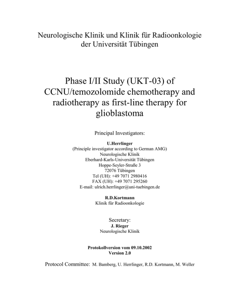 Neurologische Klinik und Klinik für Radioonkologie der Universität Tübingen Phase I/II Study (UKT-03) of CCNU/temozolomide chemotherapy and radiotherapy as first-line therapy for glioblastoma Principal Investigators: U.Herrlinger (Principle investigator according to German AMG) Neurologische Klinik Eberhard-Karls-Universität Tübingen Hoppe-Seyler-Straße 3 72076 Tübingen Tel (UH): +49 7071 2980416 FAX (UH): +49 7071 295260 E-mail: [email protected] R.D.Kortmann Klinik für Radioonkologie Secretary: J. Rieger Neurologische Klinik Protokollversion vom 09.10.2002 Version 2.0 Protocol Committee: M. Bamberg, U. Herrlinger, R.D. Kortmann, M. Weller UKT-03 Phase I/II Study of CCNU/Temozolomide-Chemotherapy and Radiotherapy for glioblastoma Version 2.0 (09.10.2002) Phase I/II Study (UKT-03) of CCNU/Temozolomide Chemotherapy and Radiotherapy as firstline therapy for glioblastoma page 1. SYNOPSIS ..........................................................................................................................................................3 2. ABBREVIATIONS.............................................................................................................................................3 3. INTRODUCTION ..............................................................................................................................................4 4. OBJECTIVES .....................................................................................................................................................5 4.1. PRIMARY OBJECTIVE ......................................................................................................................................5 4.2. SECONDARY OBJECTIVES ................................................................................................................................5 5. INVESTIGATIONAL PLAN ............................................................................................................................6 5.1. SUMMARY OF STUDY DESIGN ..........................................................................................................................6 5.2. DISCUSSION OF DESIGN AND CONTROLS ..........................................................................................................6 5.3. INVESTIGATOR INFORMATION .........................................................................................................................6 5.4. STUDY POPULATION AND ENTRY CRITERIA .....................................................................................................7 5.5. PATIENT ASSIGNMENT ....................................................................................................................................8 5.6. DOSAGE AND ADMINISTRATION ......................................................................................................................8 5.7. BLINDING .....................................................................................................................................................10 5.8 CONCOMITANT THERAPY ............................................................................................................................... 10 5.9. EFFICACY AND SAFETY EVALUATION ............................................................................................................10 5.10. PATIENT DISPOSITION CRITERIA ..................................................................................................................13 5.11. COMPLIANCE ..............................................................................................................................................13 5.12. QUALITY ASSURANCE .................................................................................................................................14 6. DATA ANALYSIS METHODS ......................................................................................................................14 6.1. EFFICACY AND SAFETY ANALYSIS .................................................................................................................14 7. REGULATORY AFFAIRS .............................................................................................................................14 7.1 GENERAL CONSIDERATIONS ...........................................................................................................................14 7.2. HANDLING OF PATIENTS' DATA .....................................................................................................................15 7.3 INSURANCE....................................................................................................................................................15 8. SPONSORING..................................................................................................................................................15 9. REFERENCES .................................................................................................................................................15 10. ATTACHMENTS ...........................................................................................................................................17 2 UKT-03 Phase I/II Study of CCNU/Temozolomide-Chemotherapy and Radiotherapy for glioblastoma Version 2.0 (09.10.2002) Phase I/II Study (UKT-03) of CCNU/temozolomide chemotheapy and radiotherapy as first-line therapy for glioblastoma 1. Synopsis Single agent nitrosourea-based chemotherapy has proven to increase survival in patients with malignant gliomas. Recently, another alkylating drug, temozolomide, has demonstrated efficacy in patients with malignant glioma. Previous studies in patients with recurrent gliomas have shown that BCNU, a nitrosourea compound applied intravenously, and oral temozolomide can be safely applied in combination chemotherapy. The UKT-03 trial now investigates the toxicity and efficacy of combined oral CCNU and t