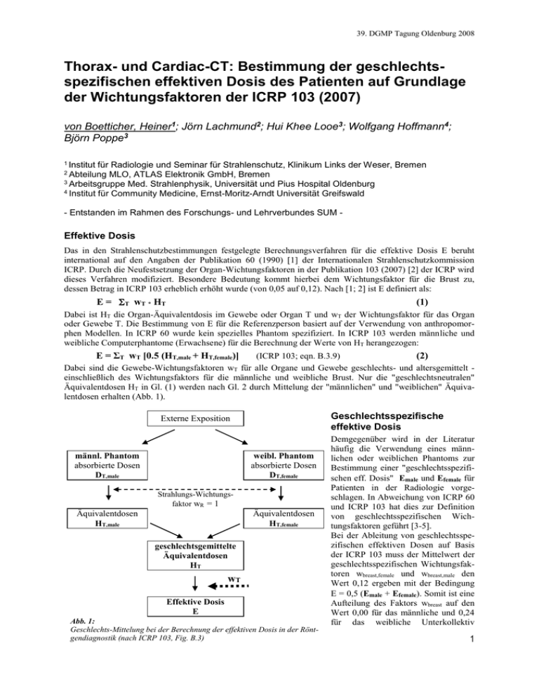 39. DGMP Tagung Oldenburg 2008 Thorax- und Cardiac-CT: Bestimmung der geschlechtsspezifischen effektiven Dosis des Patienten auf Grundlage der Wichtungsfaktoren der ICRP 103 (2007) von Boetticher, Heiner1; Jörn Lachmund2; Hui Khee Looe3; Wolfgang Hoffmann4; Björn Poppe3 1 Institut für Radiologie und Seminar für Strahlenschutz, Klinikum Links der Weser, Bremen MLO, ATLAS Elektronik GmbH, Bremen 3 Arbeitsgruppe Med. Strahlenphysik, Universität und Pius Hospital Oldenburg 4 Institut für Community Medicine, Ernst-Moritz-Arndt Universität Greifswald 2 Abteilung - Entstanden im Rahmen des Forschungs- und Lehrverbundes SUM - Effektive Dosis Das in den Strahlenschutzbestimmungen festgelegte Berechnungsverfahren für die effektive Dosis E beruht international auf den Angaben der Publikation 60 (1990) [1] der Internationalen Strahlenschutzkommission ICRP. Durch die Neufestsetzung der Organ-Wichtungsfaktoren in der Publikation 103 (2007) [2] der ICRP wird dieses Verfahren modifiziert. Besondere Bedeutung kommt hierbei dem Wichtungsfaktor für die Brust zu, dessen Betrag in ICRP 103 erheblich erhöht wurde (von 0,05 auf 0,12). Nach [1; 2] ist E definiert als: E = T w T * HT (1) Dabei ist HT die Organ-Äquivalentdosis im Gewebe oder Organ T und wT der Wichtungsfaktor für das Organ oder Gewebe T. Die Bestimmung von E für die Referenzperson basiert auf der Verwendung von anthropomorphen Modellen. In ICRP 60 wurde kein spezielles Phantom spezifiziert. In ICRP 103 werden männliche und weibliche Computerphantome (Erwachsene) für die Berechnung der Werte von HT herangezogen: E = ΣT wT [0.5 (HT,male + HT,female)] (ICRP 103; eqn. B.3.9) (2) Dabei sind die Gewebe-Wichtungsfaktoren wT für alle Organe und Gewebe geschlechts- und altersgemittelt einschließlich des Wichtungsfaktors für die männliche und weibliche Brust. Nur die "geschlechtsneutralen" Äquivalentdosen HT in Gl. (1) werden nach Gl. 2 durch Mittelung der "männlichen" und "weiblichen" Äquivalentdosen erhalten (Abb. 1). Geschlechtsspezifische effektive Dosis Externe Exposition männl. Phantom absorbierte Dosen DT,male weibl. Phantom absorbierte Dosen DT,female Strahlungs-Wichtungsfaktor wR = 1 Äquivalentdosen HT,male Äquivalentdosen HT,female geschlechtsgemittelte Äquivalentdosen HT wT Effektive Dosis E Abb. 1: Geschlechts-Mittelung bei der Berechnung der effektiven Dosis in der Röntgendiagnostik (nach ICRP 103, Fig. B.3) Demgegenüber wird in der Literatur häufig die Verwendung eines männlichen oder weiblichen Phantoms zur Bestimmung einer "geschlechtsspezifischen eff. Dosis" Emale und Efemale für Patienten in der Radiologie vorgeschlagen. In Abweichung von ICRP 60 und ICRP 103 hat dies zur Definition von geschlechtsspezifischen Wichtungsfaktoren geführt [3-5]. Bei der Ableitung von geschlechtsspezifischen effektiven Dosen auf Basis der ICRP 103 muss der Mittelwert der geschlechtsspezifischen Wichtungsfaktoren wbreast,female und wbreast,male den Wert 0,12 ergeben mit der Bedingung E = 0,5 (Emale + Efemale). Somit ist eine Aufteilung des Faktors wbreast auf den Wert 0,00 für das männliche und 0,24 für das weibliche Unterkollektiv 1 39. DGMP Tagung Oldenburg 2008 sinnvoll und durch das Konzept von ICRP 60 und ICRP 103 gerechtfertigt, das auf geschlechtsgemittelten Wichtungsfaktoren beruht [3-5]. In ICRP 103 ist eine weitere Gleichung für die Bestimmung von E angegeben, die für die Definition einer geschlechtsspezifischen Dosis ebenfalls von Bedeutung ist: E = wbreast Hbreast,female + Σ(T≠breast) wT [0.5 (HT,male + HT,female)] (ICRP 103, eqn. B.3.8) (3) Aus Gl. (2) und (3) erhält man: Hbreast = 0.5 (Hbreast,male + Hbreast,female) = Hbreast,female (4) Somit stellt Gl. (3) eine andere Form dar, Hbreast zu berechnen (mathematisch für Hbreast,male = Hbreast,female); es folgt aber nicht, dass Hbreast,male = 0 oder wbreast ein geschlechtsspezifischer Wichtungsfaktor ist. Durch Gl. (3) wird lediglich betont, dass der Wichtungsfaktor für die Brust im Wesentlichen von der Inzidenz und Mortalität für den weiblichen Brustkrebs abgeleitet wurde. Anwendungen Zur exemplarischen Darstellung der unterschiedlichen Modellansätze führten wir Dosisbestimmungen bei einer standardmäßigen Thoraxuntersuchung und einer Koronarangiographie an einem Mehrschicht-Spiral-CT durch (Fa. Toshiba, Aquilion 64). Die Ermittlung der Organdosen erfolgte mit TLDs und einem "weiblichen" Alderson-Phantom. Die Messungen wurden nach einem standardisierten Verfahren durchgeführt und ausgewertet [5]. Bei der Ermittlung von geschlechtsspezifischen effektiven Dosen wurde bei Zugrundlegung des Modells der ICRP 60 (wT = 0,05 für die Brust) der Frau ein Faktor von 0,10 und dem Mann der Faktor 0,00 zugeordnet, bei Zugrundelegung des Modells der ICRP 103 (wT = 0,12 für die Brust) entsprechend der Frau der Faktor 0,24 und dem Mann der Faktor 0,00 [3-5]. Für das Kollektiv der Frauen wurde der Dosiswert für die weibliche Brust eingesetzt. Der Wichtungsfaktor für das Organ “Gebärmutter” wurde analog dem Wichtungsfaktor für die Brust behandelt. Beim Organ “Keimdrüsen” wurde der Wichtungsfaktor nach ICRP 60 bzw. ICRP 103 beibehalten, aber die geschlechtsspezifische Dosis eingesetzt. Ergebnisse Der im Modell der ICRP 103 angehobene Wichtungsfaktor für die Brust führt zu einer deutlichen Erhöhung der effektiven Dosis beim Thorax-CT (21 %) und Cardio-CT (31%). Bei Bestimmung einer geschlechtsspezifischen effektiven Dosis erhält die Frau auf Grundlage von ICRP 60 eine um den Faktor 1,7 höhere Dosis als der Mann, auf Grundlage von ICRP 103 beträgt die Erhöhung das 3,3-fache (Tab. 1) [6]. Die Neufestlegung der Berechnungsgrundlagen führt zu einer höheren Dosis und einem deutlich erhöhten gender effect bei Röntgenuntersuchungen, bei denen die Brust betroffen ist. Dies sollte bei der Indikationsstellung berücksichtigt werden. Thorax-CT Effektive Dosis E Efemale Emale Coronar-CT Effektive Dosis E Efemale Emale ICRP 60 100 % 113,4 % 86,6 % ICRP 60 1