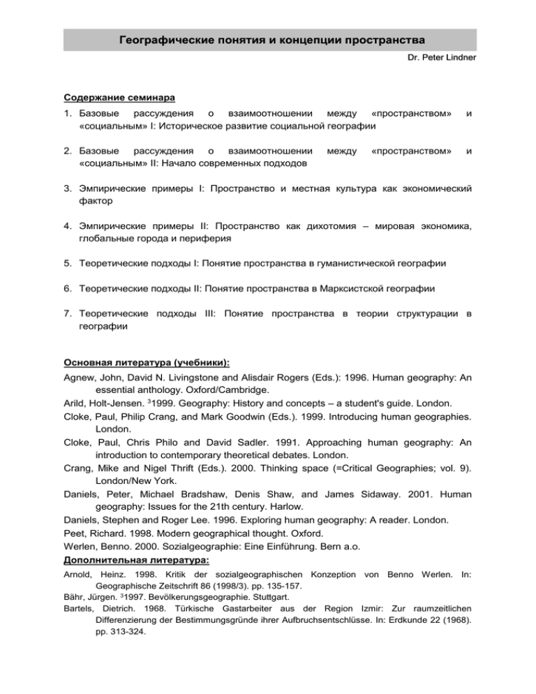 Географические понятия и концепции пространства Dr. Peter Lindner Содержание семинара 1. Базовые рассуждения о взаимоотношении между «пространством» «социальным» I: Историческое развитие социальной географии и 2. Базовые рассуждения о взаимоотношении «социальным» II: Начало современных подходов и между «пространством» 3. Эмпирические примеры I: Пространство и местная культура как экономический фактор 4. Эмпирические примеры II: Пространство как дихотомия – мировая экономика, глобальные города и периферия 5. Теоретические подходы I: Понятие пространства в гуманистической географии 6. Теоретические подходы II: Понятие пространства в Марксистской географии 7. Теоретические подходы III: Понятие пространства в теории структурации в географии Основная литература (учебники): Agnew, John, David N. Livingstone and Alisdair Rogers (Eds.): 1996. Human geography: An essential anthology. Oxford/Cambridge. Arild, Holt-Jensen. 31999. Geography: History and concepts – a student's guide. London. Cloke, Paul, Philip Crang, and Mark Goodwin (Eds.). 1999. Introducing human geographies. London. Cloke, Paul, Chris Philo and David Sadler. 1991. Approaching human geography: An introduction to contemporary theoretical debates. London. Crang, Mike and Nigel Thrift (Eds.). 2000. Thinking space (=Critical Geographies; vol. 9). London/New York. Daniels, Peter, Michael Bradshaw, Denis Shaw, and James Sidaway. 2001. Human geography: Issues for the 21th century. Harlow. Daniels, Stephen and Roger Lee. 1996. Exploring human geography: A reader. London. Peet, Richard. 1998. Modern geographical thought. Oxford. Werlen, Benno. 2000. Sozialgeographie: Eine Einführung. Bern a.o. Дополнительная литература: Arnold, Heinz. 1998. Kritik der sozialgeographischen Konzeption von Benno Werlen. In: Geographische Zeitschrift 86 (1998/3). pp. 135-157. Bähr, Jürgen. 31997. Bevölkerungsgeographie. Stuttgart. Bartels, Dietrich. 1968. Türkische Gastarbeiter aus der Region Izmir: Zur raumzeitlichen Differenzierung der Bestimmungsgründe ihrer Aufbruchsentschlüsse. In: Erdkunde 22 (1968). pp. 313-324. Berry, Brian J.L. and David Harvey. 1974. David Harvey: Social justice and the city. In: Antipode 6 (1974). pp. 142-149. Bobek, Hans. 1957. Gedanken über das logische System der Geographie. In: Mitteilungen der Österreichischen Gesellschaft für Geographie 99 (1957). pp. 122-145. Bobek, Hans. 1969 [1948]. Stellung und Bedeutung der Sozialgeographie. In: Storkebaum, Werner (Ed.). 1969 [1948]. Sozialgeographie (=Wege der Forschung; Bd. LIX). Darmstadt. pp. 44-62 (first published in Erdkunde 2 (1948), pp. 118-125). Boeckler, Marc and Peter Lindner. 2000. Jüngere Tendenzen im Umgang mit Kultur und Region in der Wirtschafts- und Sozialgeographie. In: Bahadir, Sefik Alp (Ed.). 2000. Kultur und Region im Zeichen der Globalisierung: Wohin treiben die Regionalkulturen? (=Schriften des Zentralinstituts für Regionalforschung der Universität Erlangen-Nürnberg; Bd. 36). Neustadt a.d. Aisch. pp. 105-128. Burgers, Jack. 1996. No polarisation in Dutch cities? Inequality in a corporatist country. In: Urban Studies 33 (1996/1). pp. 99-105. Buttimer, Anne. 1976. Grasping the dynamism of lifeworld. In: Annals of the Association of American Geographers 66 (1976). pp. 277-292. Buttimer, Anne. 1994. Classics in human geography revisited: Author's response. In: Progress in Human Geography 18 (1994/4). pp. 504-506. Buttimer, Anne. 1996. Author's response. In: Progress in Human Geography 20 (1996/4). pp. 517-519. Christaller, Walter. 1968. Wie ich zur Theorie der zentralen Orte gekommen bin. In: Geographische Zeitschrift 56 (1968/2). pp. 88-101. Curry, Michael R. 1996. Classics in human geography revisited: Commentary 1 (to: Buttimer, A., 1974: Values in geography. Commission on College Geography Resource Paper 24. Washington, DC: Association of American Geographers.). In: Progress in Human Geography 20 (1996/4). pp. 513-514. Daniels, Stephen. 1994. Classics in human geography revisited: Commentary 1 (to: Buttimer, A., 1976: Grasping the dynamism of lifeworld. Annals of the Association of American Geographers 66, 277-92). In: Progress in Human Geography 18 (1994/4). pp. 501-502. Escher, Anton and Eugen Wirth. 1992. Die Medina von Fes: Geographische Beiträge zu Persistenz und Dynamik, Verfall und Erneuerung einer traditionellen islamischen Stadt in handlungstheoretischer Sicht (=Erlanger Geographische Arbeiten H. 53/Mitteilungen der Fränkischen Geographischen Gesellschaft; Bd. 39). Erlangen. Friedmann, John. 2001. World cities revisited: A comment. In: Urban Studies 38 (2001/13). pp. 25352536. Friedrichs, Jürgen. 1977. Stadtanalyse: Soziale und räumliche Organisation der Gesellschaft. Reinbek bei Hamburg. Garhammer, Manfred. 2000. Die Bedeutung des Raumes für die regionale, nationale und globale Vergesellschaftung – zur Aktualität von Simmels Soziologie des Raumes. In: Bahadir, Sefik Alp (Ed.). 2000. Kultur und Region im Zeichen der Globalisierung: Wohin treiben die Regionalkulturen? (=Schriften des Zentralinstituts für Regionalforschung der Universität Erlangen-Nürnberg; Bd. 36). Neustadt a.d. Aisch. pp. 15-39. Giddens, Anthony. 21995 (1984). Die Konstitution der Gesellschaft: Grundzüge einer Theorie der Strukturierung (=Theorie und Gesellschaft; Bd. 1). Frankfurt/New York. Glückler, Johannes. 1999
