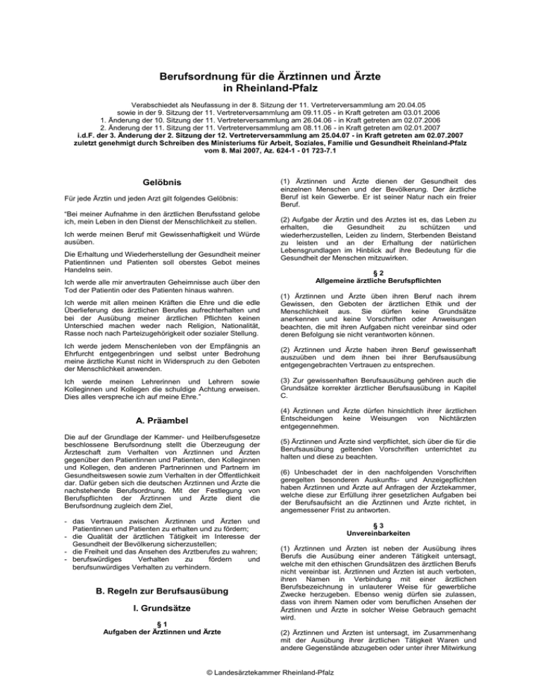 Berufsordnung für die Ärztinnen und Ärzte in Rheinland-Pfalz Verabschiedet als Neufassung in der 8. Sitzung der 11. Vertreterversammlung am 20.04.05 sowie in der 9. Sitzung der 11. Vertreterversammlung am 09.11.05 - in Kraft getreten am 03.01.2006 1. Änderung der 10. Sitzung der 11. Vertreterversammlung am 26.04.06 - in Kraft getreten am 02.07.2006 2. Änderung der 11. Sitzung der 11. Vertreterversammlung am 08.11.06 - in Kraft getreten am 02.01.2007 i.d.F. der 3. Änderung der 2. Sitzung der 12. Vertreterversammlung am 25.04.07 - in Kraft getreten am 02.07.2007 zuletzt genehmigt durch Schreiben des Ministeriums für Arbeit, Soziales, Familie und Gesundheit Rheinland-Pfalz vom 8. Mai 2007, Az. 624-1 - 01 723-7.1 Gelöbnis Für jede Ärztin und jeden Arzt gilt folgendes Gelöbnis: “Bei meiner Aufnahme in den ärztlichen Berufsstand gelobe ich, mein Leben in den Dienst der Menschlichkeit zu stellen. Ich werde meinen Beruf mit Gewissenhaftigkeit und Würde ausüben. Die Erhaltung und Wiederherstellung der Gesundheit meiner Patientinnen und Patienten soll oberstes Gebot meines Handelns sein. Ich werde alle mir anvertrauten Geheimnisse auch über den Tod der Patientin oder des Patienten hinaus wahren. (1) Ärztinnen und Ärzte dienen der Gesundheit des einzelnen Menschen und der Bevölkerung. Der ärztliche Beruf ist kein Gewerbe. Er ist seiner Natur nach ein freier Beruf. (2) Aufgabe der Ärztin und des Arztes ist es, das Leben zu erhalten, die Gesundheit zu schützen und wiederherzustellen, Leiden zu lindern, Sterbenden Beistand zu leisten und an der Erhaltung der natürlichen Lebensgrundlagen im Hinblick auf ihre Bedeutung für die Gesundheit der Menschen mitzuwirken. §2 Allgemeine ärztliche Berufspflichten Ich werde mit allen meinen Kräften die Ehre und die edle Überlieferung des ärztlichen Berufes aufrechterhalten und bei der Ausübung meiner ärztlichen Pflichten keinen Unterschied machen weder nach Religion, Nationalität, Rasse noch nach Parteizugehörigkeit oder sozialer Stellung. (1) Ärztinnen und Ärzte üben ihren Beruf nach ihrem Gewissen, den Geboten der ärztlichen Ethik und der Menschlichkeit aus. Sie dürfen keine Grundsätze anerkennen und keine Vorschriften oder Anweisungen beachten, die mit ihren Aufgaben nicht vereinbar sind oder deren Befolgung sie nicht verantworten können. Ich werde jedem Menschenleben von der Empfängnis an Ehrfurcht entgegenbringen und selbst unter Bedrohung meine ärztliche Kunst nicht in Widerspruch zu den Geboten der Menschlichkeit anwenden. (2) Ärztinnen und Ärzte haben ihren Beruf gewissenhaft auszuüben und dem ihnen bei ihrer Berufsausübung entgegengebrachten Vertrauen zu entsprechen. Ich werde meinen Lehrerinnen und Lehrern sowie Kolleginnen und Kollegen die schuldige Achtung erweisen. Dies alles verspreche ich auf meine Ehre.” (3) Zur gewissenhaften Berufsausübung gehören auch die Grundsätze korrekter ärztlicher Berufsausübung in Kapitel C. A. Präambel (4) Ärztinnen und Ärzte dürfen hinsichtlich ihrer ärztlichen Entscheidungen keine Weisungen von Nichtärzten entgegennehmen. Die auf der Grundlage der Kammer- und Heilberufsgesetze beschlossene Berufsordnung stellt die Überzeugung der Ärzteschaft zum Verhalten von Ärztinnen und Ärzten gegenüber den Patientinnen und Patienten, den Kolleginnen und Kollegen, den anderen Partnerinnen und Partnern im Gesundheitswesen sowie zum Verhalten in der Öffentlichkeit dar. Dafür geben sich die deutschen Ärztinnen und Ärzte die nachstehende Berufsordnung. Mit der Festlegung von Berufspflichten der Ärztinnen und Ärzte dient die Berufsordnung zugleich dem Ziel, - das Vertrauen zwischen Ärztinnen und Ärzten und Patientinnen und Patienten zu erhalten und zu fördern; - die Qualität der ärztlichen Tätigkeit im Interesse der Gesundheit der Bevölkerung sicherzustellen; - die Freiheit und das Ansehen des Arztberufes zu wahren; - berufswürdiges Verhalten zu fördern und berufsunwürdiges Verhalten zu verhindern. B. Regeln zur Berufsausübung I. Grundsätze §1 Aufgaben der Ärztinnen und Ärzte (5) Ärztinnen und Ärzte sind verpflichtet, sich über die für die Berufsausübung geltenden Vorschriften unterrichtet zu halten und diese zu beachten. (6) Unbeschadet der in den nachfolgenden Vorschriften geregelten besonderen Auskunfts- und Anzeigepflichten haben Ärztinnen und Ärzte auf Anfragen der Ärztekammer, welche diese zur Erfüllung ihrer gesetzlichen Aufgaben bei der Berufsaufsicht an die Ärztinnen und Ärzte richtet, in angemessener Frist zu antworten. §3 Unvereinbarkeiten (1) Ärztinnen und Ärzten ist neben der Ausübung ihres Berufs die Ausübung einer anderen Tätigkeit untersagt, welche mit den ethischen Grundsätzen des ärztlichen Berufs nicht vereinbar ist. Ärztinnen und Ärzten ist auch verboten, ihren Namen in Verbindung mit einer ärztlichen Berufsbezeichnung in unlauterer Weise für gewerbliche Zwecke herzugeben. Ebenso wenig dürfen sie zulassen, dass von ihrem Namen oder vom beruflichen Ansehen der Ärztinnen und Ärzte in solcher Weise Gebrauch gemacht wird. (2) Ärztinnen und Ärzten ist untersagt, im Zusammenhang mit der Ausübung ihrer ärztlichen Tätigkeit Waren und andere Gegenstände abzugeben oder unter ihrer Mitwirkung © Landesärztekammer Rheinland-Pfalz Berufsordnung für die Ärztinnen und Ärzte in Rheinland-Pfalz -2- abgeben zu lassen sowie gewerbliche Dienstleistungen zu erbringen oder erbringen zu lassen, soweit nicht die Abgabe des Produkts oder die Dienstleistung wegen ihrer Besonderheiten notwendiger Bestandteil der ärztlichen Therapie sind. Zur Behandlung bedürfen Ärztinnen und Ärzte der Einwilligung der Patientin oder des Patienten. Der Einwilligung hat grundsätzlich die erforderliche Aufklärung im persönlichen Gespräch vorauszugehen. §4 Fortbildung §9 Schweigepflicht (1) Ärztinnen und Ärzte, die ihren Beruf ausüben, sind verpflichtet, sich in dem Umfange beruflich fortzubilden, wie es zur Erhaltung und Entwicklung