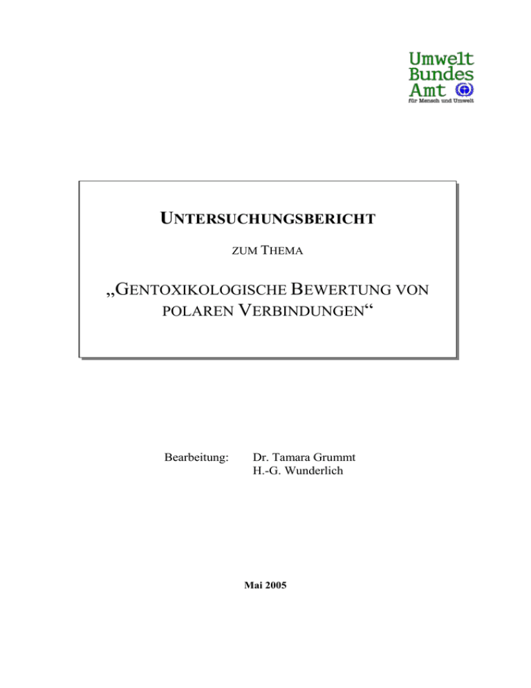 UNTERSUCHUNGSBERICHT ZUM THEMA „GENTOXIKOLOGISCHE BEWERTUNG VON POLAREN VERBINDUNGEN“ Bearbeitung: Dr. Tamara Grummt H.-G. Wunderlich Mai 2005 Abschlussbericht „Gentoxikologische Bewertung von polaren Verbindungen“, 2005 Inhaltsverzeichnis Seite 1. Aufgabenstellung ........................................................................................... 2 2. Ausgangssituation .......................................................................................... 2 3. Testsubstanzen ............................................................................................... 2 4. Gentoxizitätsprüfung ...................................................................................... 3 4.1 Methodisches Konzept ................................................................................... 3 4.2 Testkonzentrationen ....................................................................................... 4 4.3 Biologische Testverfahren.............................................................................. 5 4.3.1 Ames-Test – Salmonella/Mikrosomen-Test .................................................. 5 4.3.1.1 Bakterienstämme ............................................................................................ 5 4.3.1.2 Stoffwechselsystem (S9-Fraktion) ................................................................. 6 4.3.1.3 Prüfprotokoll .................................................................................................. 6 4.3.1.4 Bewertung ...................................................................................................... 7 4.3.2 Nachweis von Zytotoxizität – Bestimmung der plating efficiency ................ 7 4.3.3 Nachweis der Apoptose .................................................................................. 9 4.3.4 Zytogenetik – Bestimmung der Chromosomenaberrationsrate (CA) ............ 10 4.3.4.1 Zelllinie .......................................................................................................... 10 4.3.4.2 Medium- und Wachstumsbedingungen .......................................................... 10 4.3.4.3 Zytogenetische Untersuchungen .................................................................... 10 4.3.4.4 Mikroskopische Auswertung.......................................................................... 11 4.3.4.5 Bewertung ...................................................................................................... 11 5. Ergebnisse und wissenschaftliche Bewertung der Datenlage ........................ 12 6. Anhang - Einzeldaten ..................................................................................... 1 - 62 Klassischer Ames-Test TA 98, TA 100 ......................................................... 1 - 40 Ames-Test TA 98NR, TA 100NR.................................................................. 41 - 50 Chromosomenaberrationsrate......................................................................... 51 - 57 plating efficiency ............................................................................................ 58 - 62 1 Abschlussbericht „Gentoxikologische Bewertung von polaren Verbindungen“, 2005 1. Aufgabenstellung Das Fachgebiet II 3.6 „Toxikologie des Trink- und Badebeckenwassers“ im Umweltbundesamt erhielt von der Länderarbeitsgemeinschaft LABO, vertreten durch das geschäftsführende Land Mecklenburg-Vorpommern, im Rahmen des Länderfinanzierungsprogramms „Wasser und Boden“ 2002 den Auftrag, das Forschungsvorhaben „Gentoxikologische Bewertung von polaren Verbindungen“ zu bearbeiten. Die Zielsetzung des Vorhabens bestand darin, das gentoxische Potenzial von ausgewählten Einzelsubstanzen aus der Gruppe der polaren Nitroaromaten zu charakterisieren. Die wissenschaftliche Bewertung von prioritären Wirkmechanismen bildet u. a. die Grundlage für die Ableitung von gesundheitlichen Orientierungs- bzw. Leitwerten im Trinkwasser. 2. Ausgangssituation Mit der Weiterentwicklung der Einzelstoffanalytik für sprengstofftypische Verbindungen wurden an Standorten ehemaliger TNT-Produktionsstätten in Boden- und Grundwasserproben polare Nitroaromaten nachgewiesen. Hinsichtlich des Grundwasserschutzes im Einzugsgebiet und die damit verbundene Sicherung der Trinkwasserversorgung sind diese Verbindungen auf Grund ihrer guten Wasserlöslichkeit und hohen Mobilität von besonderer Relevanz. Die Kontrolle und Überwachung der qualitativen und quantitativen Schadstoffmuster sind zwingend notwendig für einen nachhaltigen Grundwasserschutz. Die Ausgestaltung der Messprogramme ( u. a. Häufigkeit der Analysen, Nachweisgrenzen, Substanzspektrum) und die Fortschreibung des bestehenden regulatorischen Rahmens richten sich nach dem Gefährdungspotenzial der Schadstoffe. Für die viele Einzelsubstanzen umfassende Stoffgruppe der Nitroaromaten werden bei Vorhandensein der Nitrogruppe als aktives Strukturprinzip gentoxische Wirkmechanismen als prioritär angesehen. Die nicht verfügbaren experimentellen Daten zur Gentoxizität von polaren Nitroaromaten machten eine Gefährdungsabschätzung nicht möglich. Um diese definieren zu können, sind Kenntnisse zum Wirkmechanismus der Substanzen von elementarer Bedeutung. In diesem Kontext wurde im Projekt eine Erstbewertung für prioritäre Einzelsubstanzen aus der Gruppe der polaren Nitroaromaten hinsichtlich ihres gentoxischen Potenzials durch den Einsatz von In-vitro-Kurzzeittests vorgenommen. 3. Testsubstanzen Die Auswahl der Testsubstanzen erfolgte aus einer auf Orientierungsmessungen basierenden Substanzliste der Länderarbeitsgruppe „Polare Verbindungen“. Die ausgewählten 20 Verbindungen sind in die Substanzgruppen Amino-/Nitro-Benzoesäuren, Amino-/NitroToluolsulfonsäuren und Nitrophenole einzuordnen. Tabelle 1 listet die Einzelsubstanzen auf. 2 Abschlussbericht „Gentoxikologische Bewertung von polaren Verbindungen“, 2005 Tab. 1: Substanzspektrum Hersteller Reinheit (%) CAS-Nr. Molekul