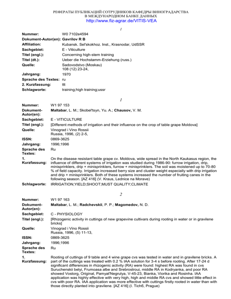 РЕФЕРАТЫ ПУБЛИКАЦИЙ СОТРУДНИКОВ КАФЕДРЫ ВИНОГРАДАРСТВА В МЕЖДУНАРОДНОМ БАНКЕ ДАННЫХ http://www.fiz-agrar.de/VITIS-VEA 1 W0 7102e4594 Gavrilov R B Kubansk. Sel'skokhoz. Inst., Krasnodar, UdSSR E - Viticulture Concerning high-stem training Ueber die Hochstamm-Erziehung (russ.) Sadovodstvo (Moskau) 108 (12) 23-24, Jahrgang: 1970 Sprache des Textes: ru 2. Kurzfassung: ttt Schlagworte: training;high training;ussr Nummer: Dokument-Autor(en): Affiliation: Sachgebiet: Titel (engl.): Titel (dt.): Quelle: 1 Nummer: DokumentAutor(en): Sachgebiet: Titel (engl.): Quelle: ISSN: Jahrgang: Sprache des Textes: 1. Kurzfassung: Schlagworte: W1 97 153 Maltabar, L. M.; Skobel'tsyn, Yu. A.; Chausov, V. M. E - VITICULTURE [Different methods of irrigation and their influence on the crop of table grape Moldova] Vinograd i Vino Rossii Russia, 1996, (2) 2-5, 0869-3625 1996;1996 Ru On the disease resistant table grape cv. Moldova, wide spread in the North Kaukasus region, the influence of different systems of irrigation was studied during 1986-90: furrow irrigation, drip, minisprinklers, drip + minisprinklers, furrow + minisprinklers. The soil was moistened up to 70-80 % of field capacity. Irrigation increased berry size and cluster weight especially with drip irrigation and drip + minisprinklers. Both of these systems increased the number of fruiting canes in the following season. [AZ 416] (V. Kraus, Lednice na Morave) IRRIGATION;YIELD;SHOOT;MUST QUALITY;CLIMATE 2 Nummer: DokumentAutor(en): Sachgebiet: Titel (engl.): Quelle: ISSN: Jahrgang: Sprache des Textes: 1. Kurzfassung: W1 97 163 Maltabar, L. M.; Radchevskii, P. P.; Magomedov, N. D. C - PHYSIOLOGY [Rhizogenic activity in cuttings of new grapevine cultivars during rooting in water or in gravilene bricks] Vinograd i Vino Rossii Russia, 1996, (5) 11-13, 0869-3625 1996;1996 Ru Rooting of cuttings of 9 table and 4 wine grape cvs was tested in water and in gravilene bricks. A part of the cuttings was treated with 0.2 % IAA solution for 3-4 s before rooting. After 17-24 d significant differences in rhizogenic activity (RA) were found: highest RA was found in cvs Suruchenskii belyi, Frumoasa albe and Srebrostroui, middle RA in Kodryanka, and poor RA showed Vostorg, Original, Pamyat'Negrulya, V-45-23, Bianka, Viorika and Rosinha. IAA application was highly effective with very high, high and middle RA cvs and showed little effect in cvs with poor RA. IAA application was more effective with cuttings firstly rooted in water than with those directly planted into gravilene. [AZ 416] (I. Tichб, Prague) Schlagworte: CUTTING;ADVENTITIOUS ROOT;HYDROPONICS;VARIETY OF VINE Nummer: DokumentAutor(en): Sachgebiet: Titel (engl.): Quelle: W1 97 165 Matuzok, N. V.; Maltabar, L. M. 3 E - VITICULTURE [Estimation of grape harvest forecasting before pruning of vines] Vinograd i Vino Rossii Russia, 1996, (5) 26-29, 0869-3625 1996;1996 Ru ISSN: Jahrgang: Sprache des Textes: 1. Estimation of the grape harvest is normally based on 2 crop coefficients: the average number of Kurzfassung: inflorescences of fertile shoots and the average number of inflorescences per vine using the microscropic method of counting initial inflorescences of 10 winter buds. The new method presented introduces a 3rd parameter, the coefficient of productivity: average number of inflorescences of 10 winter buds on the cane (frozen or damaged buds excluded). The optimal pruning length of canes corresponds to the (cv. specific) coefficient, the demanded grape yield/ha and the number of vines/ha. Based on the data of 7 cvs a formula is given for calculating the productivity coefficient for 1-bud to 10-bud pruning. [AZ 416] (D. Pospнsilovб, Bratislava) Schlagworte: GRAPE HARVEST;YIELD;FORECASTING;MODEL;VARIETY OF VINE 4 Nummer: DokumentAutor(en): Affiliation: Sachgebiet: Titel (engl.): Titel (dt.): Quelle: Jahrgang: Sprache des Textes: 2. Kurzfassung: Schlagworte: W0 7102c4243 Maltabar LM; Unguryanu SI Moldavsk. Nauchno-Issled. Inst. Sadovod. Vinogradar. Vinodel., Kishinev, UdSSR C - Physiology Influence of the moisture level of the scion cuttings on the health and regeneration capacity of the buds Der Einfluss des Feuchtigkeitsgehaltes der Edelreisstecklinge auf die Gesundheit und Regenerationsfaehigkeit der Knospen (russ.) Sadovod. Vinogradar. i Vinodel. Moldavii (Kishinev) 25 (11) 31-33, 1970 ru ttt water;hydration;bud;shoot;frost;resistance;bud burst 5 Nummer: Dokument-Autor(en): Sachgebiet: Titel (engl.): Titel (dt.): Quelle: W0 7102c6038 Kolesnik ZV; Maltabar LM C - Physiology On the physiological affinity of the vine Ueber die physiologische Affinitaet der Rebe (russ.) Trudy Moldavsk. Nauchno-Issled. Inst. Sadovod. Vinogradar. Vinodel. (Kishinev) 15 175-188, Jahrgang: 1969 Sprache des Textes: ru 1. Kurzfassung: s. a.: Hort. Abstr. 41, 437 (1971) 2. Kurzfassung: ttt Schlagworte: affinity;grafted vine;take;biogenesis;metabolism;photosynthesis 6 Nummer: Dokument-Autor(en): Sachgebiet: Titel (engl.): Titel (dt.): Quelle: W0 7102e0290 Maltabar LM; Tikhvinskii IN; Pomanenko NN E - Viticulture Technology of electro-stratification in vine grafting Technologie der Elektro-Stratifikation bei der Rebpfropfung (russ.) Sadovodstvo (Moskau) 106 (10) 24-25, Jahrgang: 1968 Sprache des Textes: ru 2. Kurzfassung: ttt Schlagworte: grafting;stratification 7 Nummer: Dokument-Autor(en): Affiliation: Sachgebiet: Titel (engl.): Titel (dt.): Quelle: W0 7102e2239 Maltabar LM Moldavsk. Nauchno-Issled. Inst. Sadovod. Vinogradar. Vinodel., Kishinev, UdSSR E - Viticulture The cultivation of grafted vine cuttings in plastics cups Die Anzucht gepfropfter Rebenstecklinge in Plastikbechern (russ.) Sadovod. Vinogradar. i Vinodel. Moldavii (Kishinev) 1 37-40, Jahrgang: 1970 Sprache des Textes: ru 2. Kurzfassung: ttt Schlagworte: grafted vine;propagation;cutting 8 Nummer: Dokument-Autor(en): Affiliation: Sachgebiet: Titel (engl.): Titel (dt.): Quelle: W0 7102e2244 Maltabar LM
