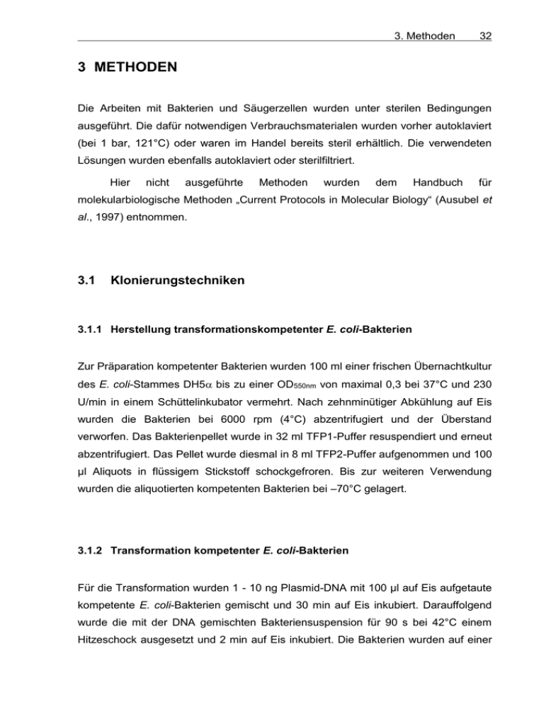 3. Methoden 32 3 METHODEN Die Arbeiten mit Bakterien und Säugerzellen wurden unter sterilen Bedingungen ausgeführt. Die dafür notwendigen Verbrauchsmaterialen wurden vorher autoklaviert (bei 1 bar, 121°C) oder waren im Handel bereits steril erhältlich. Die verwendeten Lösungen wurden ebenfalls autoklaviert oder sterilfiltriert. Hier nicht ausgeführte Methoden wurden dem Handbuch für molekularbiologische Methoden „Current Protocols in Molecular Biology“ (Ausubel et al., 1997) entnommen. 3.1 Klonierungstechniken 3.1.1 Herstellung transformationskompetenter E. coli-Bakterien Zur Präparation kompetenter Bakterien wurden 100 ml einer frischen Übernachtkultur des E. coli-Stammes DH5 bis zu einer OD550nm von maximal 0,3 bei 37°C und 230 U/min in einem Schüttelinkubator vermehrt. Nach zehnminütiger Abkühlung auf Eis wurden die Bakterien bei 6000 rpm (4°C) abzentrifugiert und der Überstand verworfen. Das Bakterienpellet wurde in 32 ml TFP1-Puffer resuspendiert und erneut abzentrifugiert. Das Pellet wurde diesmal in 8 ml TFP2-Puffer aufgenommen und 100 µl Aliquots in flüssigem Stickstoff schockgefroren. Bis zur weiteren Verwendung wurden die aliquotierten kompetenten Bakterien bei –70°C gelagert. 3.1.2 Transformation kompetenter E. coli-Bakterien Für die Transformation wurden 1 - 10 ng Plasmid-DNA mit 100 µl auf Eis aufgetaute kompetente E. coli-Bakterien gemischt und 30 min auf Eis inkubiert. Darauffolgend wurde die mit der DNA gemischten Bakteriensuspension für 90 s bei 42°C einem Hitzeschock ausgesetzt und 2 min auf Eis inkubiert. Die Bakterien wurden auf einer 3. Methoden 33 LB-Agar-Platte, die 50 - 100 µg/ml des Antibiotikums Ampicillin enthielt, ausgestrichen und über Nacht bei 37°C inkubiert. Die Kolonien wurden, wie unter Kap. 3.2.4 beschrieben, einem PCR-Screening unterzogen, um die Anwesenheit des Inserts zu verifizieren. Bei einem positiven Ergebnis wurde die entsprechende Kolonie in 5 ml LB-Flüssigkulturmedium mit 50 - 100 µg/ml Ampicillin über Nacht bei 37°C und 230 U/min im Schüttler angezogen, eine Glycerinstammlösung angelegt, die sich aus 80% der Übernachtkultur und 30% Glycerin zusammensetzt, und bei – 70°C aufbewahrt. 3.1.3 Aufreinigung von Plasmid-DNA aus E. coli-Bakterien Die Aufreinigung von Plasmid-DNA aus E. coli-Bakterien basierte auf dem Prinzip der alkalischen Lyse (Birnboim und Doly, 1979). 3.1.3.1 Mini-Päparation 3 ml einer Übernachtkultur wurden bei 4000 g, 4°C, für 1 min abzentrifugiert. Der Überstand wurde verworfen und die Bakterien in 200 µl S1-Puffer resuspendiert. Dazu wurden 200 µl S2-Puffer gegeben und durch Invertieren vermischt. Nach 5minütiger Inkubation bei RT wurde kalter Puffer S3 dazugegeben, gut vermischt und nach weiteren 5 min auf Eis 10 min bei 12000 g, 4°C, zentrifugiert. Der Überstand wurde in ein neues Reaktionsgefäß überführt und die DNA mit 420 µl Isopropanol gefällt. Es erfolgte nach einer Zentrifugation bei 12000 g (30 min, 4°C) die vollständige Entfernung des Überstandes und eine Trocknung der DNA bei Raumtemperatur. Die Plasmid-DNA wurde in 50 µl TE-Puffer aufgenommen und bei 4°C gelagert. 3.1.3.2 Maxi-Präparation Die Präparation von Plasmid-DNA aus 150 - 300 ml Übernachtkultur erfolgte mit dem Nucleobond-AX-500-Kit (Machery und Nagel) nach den Anweisungen des 3. Methoden 34 Herstellers. Die aufgereinigte DNA wurde in 100 - 150 µl A. bidest aufgenommen und bis zur weiteren Verwendung bei –20°C gelagert. 3.1.4 Schneiden von DNA mit Restriktionsendonukleasen Das Schneiden von DNA erfolgte mit 1 U Enzym pro 1 µg DNA in einem vom Hersteller bereitgestellten Puffer. Dabei war darauf zu achten, dass das Volumen des eingesetzten Enzyms 5% des Reaktionsvolumens nicht überschritt. Die Inkubationszeit betrug ca. 4 h bei 37°C. 3.1.5 Dephosphorylierung von geschnittener Plasmid-DNA Um eine Religation geschnittener Plasmid-DNA zu verhindern, wurden mit Hilfe alkalischer Phosphatase Phosphatase“, Roche aus Kälberdarm Molecular (CIAP, Biochemicals), die „Calf am Intestinal 5`-Ende Alkaline gelegene Phosphatgruppe entfernt. Dazu wurde zu dem geschnittenen Plasmid 1/10 Volumen des 10 x CIAP-Puffers und 1 U der Phosphatase gegeben. Es folgte eine 30minütige Inkubation bei 37°C. Danach wurde die Reaktion durch Zugabe von DNAProbenpuffer gestoppt. 3.1.6 Elektrophoretische Auftrennung von DNA im Agarosegel Um DNA-Fragmente aufzutrennen, wurden horizontale Agarosegele in einem TAEPuffersystem verwendet. Je nach Größe des aufzutrennenden Fragmentes wurden 0,8 - 1,2% Gele hergestellt, die mit 0,5 µg/ml Ethidiumbromid versehen waren, um die DNA unter UV-Licht sichtbar zu machen. Die Elektrophorese wurde bei einer Spannung von 2 - 5 V/cm2 durchgeführt. Um die Konzentration eines DNAFragmentes im Gel abzuschätzen, wurde die Intensität der DNA-Bande im Gel mit einem aufgetragenen Standard verglichen. 3. Methoden 35 3.1.7 Aufreinigung von DNA-Fragmenten aus Agarosegelen Die DNA-Fragmente wurden unter UV-Licht aus dem Gel ausgeschnitten und mit Hilfe eines Gelextraktionskits („QIAquick Gel Extraction-Kit“, Qiagen) nach Angaben des Herstellers aufgereinigt. 3.1.8 Ligation von DNA mit überhängenden Enden Zuvor geschnittene und aufgereinigte DNA-Fragmente wurden unter Verwendung einer T4-DNA-Ligase, die die Bildung von Phosphodiester-Bindungen zwischen freien 5`-Phosphatgruppen und freien 3`-Hydroxylgruppen der DNA-Moleküle katalysiert, mit einem ebenfalls geschnittenen und aufgereinigten Plasmid ligiert. Für die Ligation wurde ein molarer Überschuss des Inserts im Verhältnis 3:1 zum Plasmid eingesetzt. Der typische Ligationsansatz setzte sich folgendermaßen zusammen: 30 fmol Vektor-DNA 90 fmol Insert-DNA 1,5 µl 10x Ligationspuffer 1 U T4-Ligase ad 15 µl A. bidest Der Ligationsansatz wurde über Nacht bei 16°C inkubiert und dann für die Transformation kompetenter E. coli-Bakterien eingesetzt. 3. Methoden 3.2 36 Polymerase-Ketten-Reaktion (polymerase-chain-reaction, PCR) Die