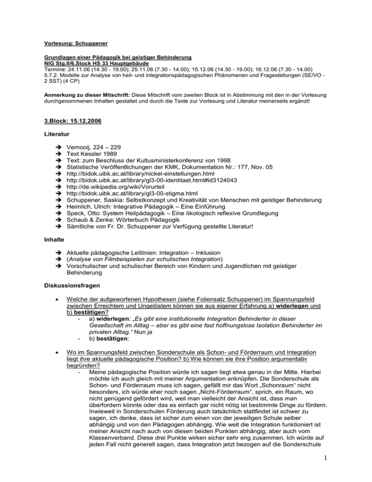 Vorlesung: Schuppener Grundlagen einer Pädagogik bei geistiger Behinderung NIG Stg.II/6.Stock HS 33 Hauptgebäude Termine: 24.11.06 (14.30 - 19.00); 25.11.06 (7.30 - 14.00); 15.12.06 (14.30 - 19.00); 16.12.06 (7.30 - 14.00) 5.7.2. Modelle zur Analyse von heil- und integrationspädagogischen Phänomenen und Fragestellungen (SE/VO 2 SST) (4 CP) Anmerkung zu dieser Mitschrift: Diese Mitschrift vom zweiten Block ist in Abstimmung mit den in der Vorlesung durchgenommenen Inhalten gestaltet und durch die Texte zur Vorlesung und Literatur meinerseits ergänzt! 3.Block: 15.12.2006 Literatur Vernooij, 224 – 229 Text Kessler 1989 Text: zum Beschluss der Kultusministerkonferenz von 1998 Statistische Veröffentlichungen der KMK, Dokumentation Nr.: 177, Nov. 05 http://bidok.uibk.ac.at/library/nickel-einstellungen.html http://bidok.uibk.ac.at/library/gl3-00-identitaet.html#id3124043 http://de.wikipedia.org/wiki/Vorurteil http://bidok.uibk.ac.at/library/gl3-00-stigma.html Schuppener, Saskia: Selbstkonzept und Kreativität von Menschen mit geistiger Behinderung Heimlich, Ulrich: Integrative Pädagogik – Eine Einführung Speck, Otto: System Heilpädagogik – Eine ökologisch reflexive Grundlegung Schaub & Zenke: Wörterbuch Pädagogik Sämtliche von Fr. Dr. Schuppener zur Verfügung gestellte Literatur! Inhalte Aktuelle pädagogische Leitlinien: Integration – Inklusion (Analyse von Filmbeispielen zur schulischen Integration) Vorschulischer und schulischer Bereich von Kindern und Jugendlichen mit geistiger Behinderung Diskussionsfragen Welche der aufgeworfenen Hypothesen (siehe Foliensatz Schuppener) im Spannungsfeld zwischen Erreichtem und Ungelöstem können sie aus eigener Erfahrung a) widerlegen und b) bestätigen? - a) widerlegen: „Es gibt eine institutionelle Integration Behinderter in dieser Gesellschaft im Alltag – aber es gibt eine fast hoffnungslose Isolation Behinderter im privaten Alltag.“ Nun ja - b) bestätigen: Wo im Spannungsfeld zwischen Sonderschule als Schon- und Förderraum und Integration liegt ihre aktuelle pädagogische Position? b) Wie können sie ihre Position argumentativ begründen? - Meine pädagogische Position würde ich sagen liegt etwa genau in der Mitte. Hierbei möchte ich auch gleich mit meiner Argumentation anknüpfen. Die Sonderschule als Schon- und Förderraum muss ich sagen, gefällt mir das Wort „Schonraum“ nicht besonders, ich würde eher noch sagen „Nicht-Förderraum“, sprich, ein Raum, wo nicht genügend gefördert wird, weil man vielleicht der Ansicht ist, dass man überfordern könnte oder das es einfach gar nicht nötig ist bestimmte Dinge zu fördern. Inwieweit in Sonderschulen Förderung auch tatsächlich stattfindet ist schwer zu sagen, ich denke, dass ist sicher zum einen von der jeweiligen Schule selber abhängig und von den Pädagogen abhängig. Wie weit die Integration funktioniert ist meiner Ansicht nach auch von diesen beiden Punkten abhängig, aber auch vom Klassenverband. Diese drei Punkte wirken sicher sehr eng zusammen. Ich würde auf jeden Fall nicht generell sagen, dass Integration jetzt bezogen auf die Sonderschule 1 gar nicht funktioniert. Da sollte man schon differenzieren. Was Integration im Allgemeinen betrifft, so steh ich hier wieder in einem anderen Spannungsfeld, nämlich in dem der Integration – Selbstbestimmung. Ich selbst arbeite als Persönliche Assistentin, was doch mehr in die Richtung von Selbstbestimmung, zum Teil auch Normalisierung hinzielt. Aber auch selbstbestimmt ist nicht gleich selbstbestimmt, Grenzen sind auch hier sichtbar. Und sie liegen auch hier in erster Linie im finanziellen Bereich. Beispiel: Der Modellversuch „Unbegrenzt Assistenz“ existiert eben bisher nur als Modellversuch, und aus meiner Sicht ist es fraglich, ob dieses Modell in Zukunft auch wirklich umsetzbar sein wird. Wenn ich daran denke, wie lang es schon gebraucht hat, bis der Modellversuch tatsächlich in Gang gekommen ist. Aber ich möchte hier jetzt nicht ausschweifen. Um noch einmal auf meine Pädagogische Position zurückzukommen würde ich sagen, dass die Ansätze und die Leitideen nicht grundsätzlich schlecht sind, vielleicht hätte man da oder dort die Gedanken mehr ausdifferenzieren können, vor allem aber hätte man in der Umsetzung mehr aufpassen sollen. Normalisierung war nach dem ursprünglichen Leitgedanken auch nicht so gesehen, dass Menschen mit Behinderung „an die Gesellschaft angepasst werden müssen“, sondern eben, dass sie ihren Alltag, ihr Leben unter genau den selben normalen Bedingungen leben und gestalten dürfen sollen wie auch Menschen ohne Behinderung. Genauso hätte die Integration nicht dahin führen müssen, dass sie heute quasi zwangsweise als eine Form der BeSonderung gesehen wird, ja in gewisser Weise untrennbar mit ihr verbunden ist. In welchem Kontext lernen sie selbst besser und lieber? Im heterogenen oder homogenen? - Um ehrlich zu sein, lerne ich im homogenen Kontext schon besser. Erstens gibt es die Sicherheit, dass ich mit Leuten zusammenarbeite, die wissen, worum es geht bzw. wie die Rahmenbedingungen sind und warum und von daher ist zweitens natürlich auch ein leichterer oder erleichterter Austausch möglich. In gewisser Hinsicht ist es natürlich eine Art von Bequemlichkeit. Aber in erster Linie ist es die Sicherheit, dass man sich in einem vertrauten und gewohnten Feld befindet. Ad Text: „Integration und Heterogenität“ v. A. HINZ „Zwei grundsätzlich unterschiedliche Umgangsweisen mit Heterogenität – als Problem und auch als Chance“ Kinder sind verschieden, eine Heterogenität der Lerngruppen ist unumgänglich: Wie ging und wie geht die Schule generell damit um? Diskussionspunkt: „Gemeinsames Schulstufensystem vs. „Hierarchisches Schulstufensystem“ - Heterogenität als Problem: Trennung von „Ungleichen“, also von jenen Schülern, die andere im Lernen „Stören“, hemmen oder behindern -> Homogenisierung im Sinne einer Aussonderung, Hierarchisierung,… 