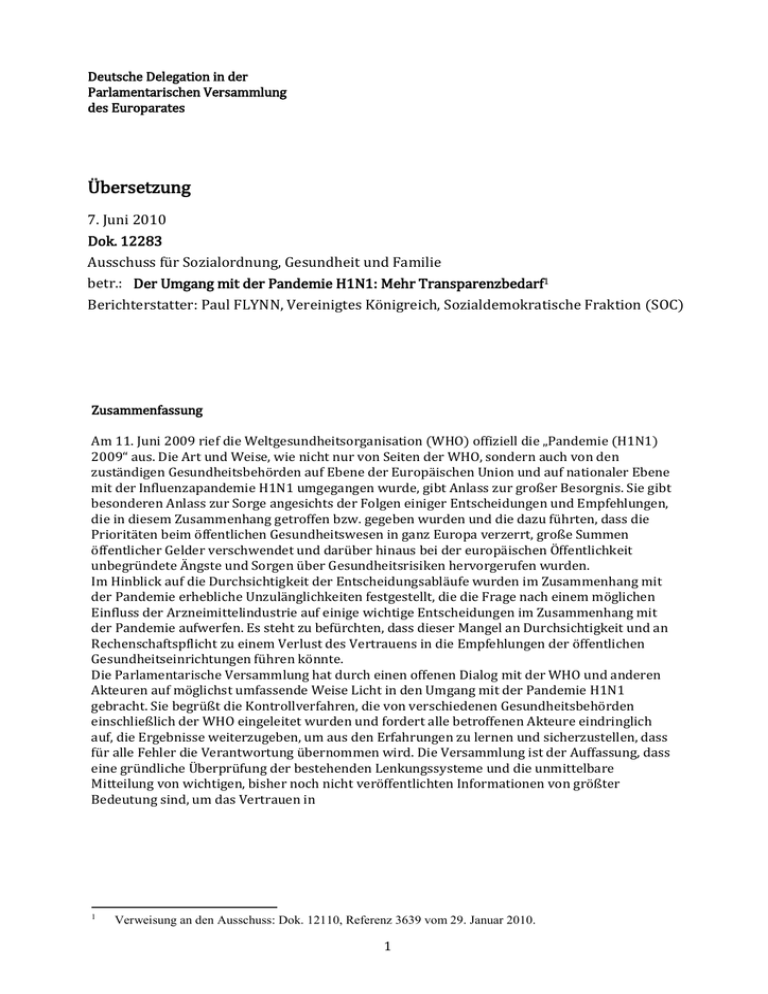 Deutsche Delegation in der Parlamentarischen Versammlung des Europarates Übersetzung 7. Juni 2010 Dok. 12283 Ausschuss für Sozialordnung, Gesundheit und Familie betr.: Der Umgang mit der Pandemie H1N1: Mehr Transparenzbedarf1 Berichterstatter: Paul FLYNN, Vereinigtes Königreich, Sozialdemokratische Fraktion (SOC) Zusammenfassung Am 11. Juni 2009 rief die Weltgesundheitsorganisation (WHO) offiziell die „Pandemie (H1N1) 2009“ aus. Die Art und Weise, wie nicht nur von Seiten der WHO, sondern auch von den zuständigen Gesundheitsbehörden auf Ebene der Europäischen Union und auf nationaler Ebene mit der Influenzapandemie H1N1 umgegangen wurde, gibt Anlass zur großer Besorgnis. Sie gibt besonderen Anlass zur Sorge angesichts der Folgen einiger Entscheidungen und Empfehlungen, die in diesem Zusammenhang getroffen bzw. gegeben wurden und die dazu führten, dass die Prioritäten beim öffentlichen Gesundheitswesen in ganz Europa verzerrt, große Summen öffentlicher Gelder verschwendet und darüber hinaus bei der europäischen Öffentlichkeit unbegründete Ängste und Sorgen über Gesundheitsrisiken hervorgerufen wurden. Im Hinblick auf die Durchsichtigkeit der Entscheidungsabläufe wurden im Zusammenhang mit der Pandemie erhebliche Unzulänglichkeiten festgestellt, die die Frage nach einem möglichen Einfluss der Arzneimittelindustrie auf einige wichtige Entscheidungen im Zusammenhang mit der Pandemie aufwerfen. Es steht zu befürchten, dass dieser Mangel an Durchsichtigkeit und an Rechenschaftspflicht zu einem Verlust des Vertrauens in die Empfehlungen der öffentlichen Gesundheitseinrichtungen führen könnte. Die Parlamentarische Versammlung hat durch einen offenen Dialog mit der WHO und anderen Akteuren auf möglichst umfassende Weise Licht in den Umgang mit der Pandemie H1N1 gebracht. Sie begrüßt die Kontrollverfahren, die von verschiedenen Gesundheitsbehörden einschließlich der WHO eingeleitet wurden und fordert alle betroffenen Akteure eindringlich auf, die Ergebnisse weiterzugeben, um aus den Erfahrungen zu lernen und sicherzustellen, dass für alle Fehler die Verantwortung übernommen wird. Die Versammlung ist der Auffassung, dass eine gründliche Überprüfung der bestehenden Lenkungssysteme und die unmittelbare Mitteilung von wichtigen, bisher noch nicht veröffentlichten Informationen von größter Bedeutung sind, um das Vertrauen in 1 Verweisung an den Ausschuss: Dok. 12110, Referenz 3639 vom 29. Januar 2010. 1 Deutscher Bundestag wichtige Beschlüsse und Empfehlungen betreffend die öffentliche Gesundheit wieder herzustellen und um sicherzustellen, dass sie im Falle der nächsten übertragbaren Krankheit weltweiten Ausmaßes, die durchaus ernster verlaufen kann, befolgt werden. A. Entwurf einer Entschließung2 1. Die Parlamentarische Versammlung ist angesichts des Umgangs mit der Influenzapandemie H1N1, nicht nur seitens der Weltgesundheitsorganisation (WHO), sondern auch seitens der zuständigen Behörden bei der Europäischen Union und auf einzelstaatlicher Ebene, in großer Sorge. Sie ist insbesondere besorgt angesichts der Folgen einiger Entscheidungen und Empfehlungen, die in diesem Zusammenhang getroffen beziehungsweise gegeben wurden und aufgrund derer die Prioritäten beim öffentlichen Gesundheitswesen in ganz Europa verzerrt und große Summen öffentlicher Gelder verschwendet wurden und die darüber hinaus bei der europäischen Öffentlichkeit zu ungerechtfertigten Ängsten und Sorgen über das Gesundheitsrisiko geführt haben. 2. Die Versammlung stellt fest, dass im Hinblick auf die Durchsichtigkeit der Entscheidungsabläufe im Zusammenhang mit der Pandemie erhebliche Unzulänglichkeiten festgestellt wurden, die die Frage nach einem möglichen Einfluss der Arzneimittelindustrie auf einige wichtige Entscheidungen im Zusammenhang mit der Pandemie aufwerfen. Die Versammlung befürchtet, dass dieser Mangel an Durchsichtigkeit und an Rechenschaftspflicht dazu führen könnte, dass das Vertrauen in die Empfehlungen der öffentlichen Gesundheitseinrichtungen sinkt. Das könnte bei der nächsten Krankheit von pandemischem Ausmaß - die sich als wesentlich schwerwiegender als H1N1 erweisen könnte – dramatische Folgen haben. 3. Die Versammlung erinnert an ihre bisherigen Arbeiten im Zusammenhang mit verantwortungsvoller Führung im Gesundheitswesen in den Mitgliedstaaten des Europarates, insbesondere an die Empfehlung Nr. 1725 (2005) betreffend „Europa und die Gefahr der Vogelgrippe – präventive Gesundheitsmaßnahmen“ sowie die Empfehlung Nr. 1787 (2007) betreffend das Vorsorgeprinzip und verantwortungsvolles Risikomanagement. In ihrer Empfehlung Nr. 1908 (2010) betreffend Lobbyismus in einer demokratischen Gesellschaft (Europäischer Verhaltenskodex für Lobbyisten) stellt die Versammlung fest, dass ungeregelter oder heimlicher Lobbyismus eine Gefahr darstellen und demokratische Grundsätze sowie eine verantwortungsvolle Führung untergraben können. 4. Positiv sieht die Versammlung die Prüfung und Bewertung des Umgangs mit der Pandemie H1N1, die kürzlich durch die WHO, die europäischen Einrichtungen für Gesundheitsfragen und einige nationale Regierungen und Parlamente begonnen wurden oder in Kürze beginnen werden. Die Versammlung fordert alle Beteiligten nachdrücklich auf, den Dialog zwischen den Gesundheitseinrichtungen auf allen Ebenen fortzuführen und zu verstärken und den Austausch über verantwortungsvolle Führung im Gesundheitswesen künftig in regelmäßigeren Abständen zu führen. 5. Ungeachtet der Bereitschaft der WHO und der betroffenen europäischen Gesundheitseinrichtungen, in einen Dialog zu treten und den Umgang mit der Pandemie zu prüfen, bedauert es die Versammlung zutiefst, dass besagte Einrichtungen zum Austausch einiger entscheidender Informationen nicht bereit sind. Insbesondere sind sie nicht bereit, die Namen und die Interessenerklärungen der Mitglieder des Notfallausschusses der WHO und einschlägiger Beratungsgremien, d