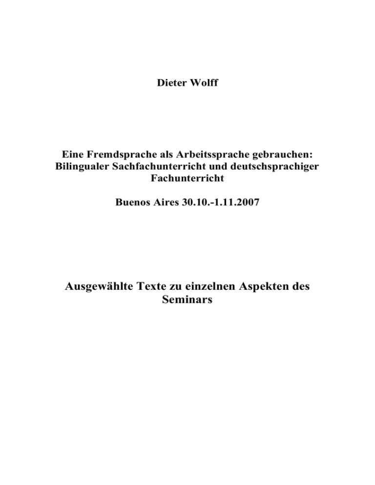 Dieter Wolff Eine Fremdsprache als Arbeitssprache gebrauchen: Bilingualer Sachfachunterricht und deutschsprachiger Fachunterricht Buenos Aires 30.10.-1.11.2007 Ausgewählte Texte zu einzelnen Aspekten des Seminars 2 Vorwort Die Auswahl der hier vorgelegten Texte ist mit der Zielsetzung geschehen, Teile des Seminars in verkürzter Form zu behandeln, weil durch die vorherige Lektüre Kenntnisse des jeweiligen Sachverhalts erworben werden konnten bzw. weil sich die Option eröffnet, nach dem Seminar interessierende Themen noch einmal aufzugreifen und nachzulesen. Während des Seminars sollen jedoch alle Themen, die im Programm vorgesehen sind, wenigstens angesprochen werden. Der größte Teil der Texte stammt von mir selbst; fast alle Texte sind in den letzten Jahren auch veröffentlicht worden. Ein Teil der Texte ist in englischer Sprache, leider hatte ich nicht die Zeit, Übersetzungen durchzuführen. Die Texte sind Themenbereichen des Seminars so zugeordnet, dass die Gliederungspunkte des Seminars als Überschriften für den jeweiligen Text gewählt wurden. Ich setze nicht voraus, dass die Texte vor Beginn des Seminars gelesen worden sind und betrachte die Textsammlung als eine Art Dokumentation, die von den Teilnehmern am Seminar konsultiert werden kann, wenn sie die Zeit dafür haben. Neben den Texten erhält jeder Teilnehmer zu Beginn des Seminars Kopien der verwendeten Powerpoint Präsentationen, in welchen die Inhalte des Seminars knapp zusammengefasst werden. Essen, den 20.9.2007 Dieter Wolff 3 2. Kapitel: Lernerautonomie als übergeordnetes Ziel jeden Unterrichts 2.1 Eine Definition von Lernerautonomie When the term learner autonomy is mentioned in discussions about teaching and learning it is almost always in relation to foreign language learning. The reason for this is that the concept was first developed and put into practice in recent years within a language learning framework. This has led to some misunderstanding: learner autonomy as such has nothing to do with language learning; it is a global pedagogical goal which can be related to all subjects and to all contexts of education. Learner autonomy is not an entirely new concept in pedagogy. Since Comenius the development of learner independence was regarded as one of the most important goals in education. In Germany, the so-called Reform Pedagogy movement made autonomy an important issue, and in France Célestin Freinet created a learning environment for primary schools which made it possible to educate children in such a way that they learned to control their own learning autonomously. Historically speaking, the pedagogical concept of learner autonomy remained for a long time a marginal concept, however. Mainstream pedagogy was rather interested in instructional concepts of learning, concepts in which the teacher played the main role and the learner was degraded to a kind of container into which the teacher would pour his knowledge. Jonassen calls this the sponge method of instruction, “where the goal of learners is to absorb what they are given until the examination, at which the information is wrung out of them”. Here is a well-known definition of learner autonomy: Autonomy is the ability to take charge of one’s learning, which means to have, and to hold, the responsibility for all the decisions concerning all aspects of this learning, i.e.: - determining the objectives; - defining the contents and progressions; - selecting methods and techniques to be used; - monitoring the procedure of acquisition properly speaking (rhythm, time, place, etc.); - evaluating what has been acquired. (Holec 1981,3) This definition shows a number of typical features of learner autonomy: It shows that learner autonomy is a very general concept which can be used in all educational contexts. It shows that the tasks of the autonomous learner are tasks which in traditional pedagogy are entirely tasks carried out by the teacher. 4 It shows that learner autonomy is not an inherent quality of the learner; it is rather something which the learner has to learn while going through the educational process in school. According to Little the most important goal of all education should be the development of autonomy. It should at least be mentioned here that there exist other interpretations of the term autonomous learning and therefore also other approaches to language learning. In some of these approaches autonomy is simply seem as a technical construct: the concept is defined as the act of learning a language outside the framework of an educational institution and without the intervention of a teacher. This kind of approach to the concept of autonomy which is often found in contexts in which the New Technologies are still defined as learning machines which can serve as a substitute for the human teacher has not much to do with the “humanistic” approach to autonomy which was sketched out here. When looking back at the four new paradigms described in this module it has become clear that in modern forms of post-communicative language teaching important concepts of Communicative Language Learning have remained, for example the focus on meaning and communication. But other equally important concepts have come up, for example the focus on authenticity, on social learning and on learner independence. In this context the emphasis on learning strategies and study skills should be specifically mentioned. On the whole, the postcommunicative paradigms in language teaching should be seen as highly innovative and suitable to attain the most important goal we have set in the European context: multilingual education. 2.3 Lernerautonomie in der Praxis des Unterrichts Making learner autonomy work in the language classroom The question arises in what way the principles of learner autonomy can be put into practice in the classroom. An autonomous classroom can be characterised according to the following features: Group work: Work in small group is a typical featur