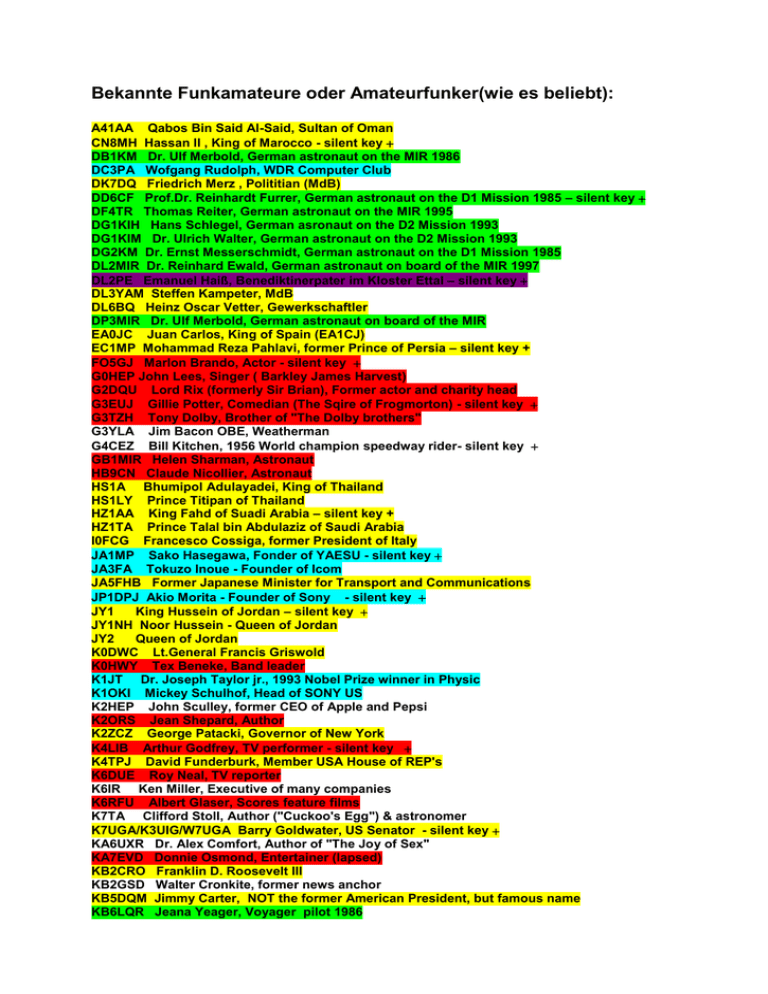 Bekannte Funkamateure oder Amateurfunker(wie es beliebt): A41AA Qabos Bin Said Al-Said, Sultan of Oman CN8MH Hassan II , King of Marocco - silent key DB1KM Dr. Ulf Merbold, German astronaut on the MIR 1986 DC3PA Wofgang Rudolph, WDR Computer Club DK7DQ Friedrich Merz , Polititian (MdB) DD6CF Prof.Dr. Reinhardt Furrer, German astronaut on the D1 Mission 1985 – silent key DF4TR Thomas Reiter, German astronaut on the MIR 1995 DG1KIH Hans Schlegel, German asronaut on the D2 Mission 1993 DG1KIM Dr. Ulrich Walter, German astronaut on the D2 Mission 1993 DG2KM Dr. Ernst Messerschmidt, German astronaut on the D1 Mission 1985 DL2MIR Dr. Reinhard Ewald, German astronaut on board of the MIR 1997 DL2PE Emanuel Haiß, Benediktinerpater im Kloster Ettal – silent key DL3YAM Steffen Kampeter, MdB DL6BQ Heinz Oscar Vetter, Gewerkschaftler DP3MIR Dr. Ulf Merbold, German astronaut on board of the MIR EA0JC Juan Carlos, King of Spain (EA1CJ) EC1MP Mohammad Reza Pahlavi, former Prince of Persia – silent key + FO5GJ Marlon Brando, Actor - silent key G0HEP John Lees, Singer ( Barkley James Harvest) G2DQU Lord Rix (formerly Sir Brian), Former actor and charity head G3EUJ Gillie Potter, Comedian (The Sqire of Frogmorton) - silent key G3TZH Tony Dolby, Brother of "The Dolby brothers" G3YLA Jim Bacon OBE, Weatherman G4CEZ Bill Kitchen, 1956 World champion speedway rider- silent key GB1MIR Helen Sharman, Astronaut HB9CN Claude Nicollier, Astronaut HS1A Bhumipol Adulayadei, King of Thailand HS1LY Prince Titipan of Thailand HZ1AA King Fahd of Suadi Arabia – silent key + HZ1TA Prince Talal bin Abdulaziz of Saudi Arabia I0FCG Francesco Cossiga, former President of Italy JA1MP Sako Hasegawa, Fonder of YAESU - silent key JA3FA Tokuzo Inoue - Founder of Icom JA5FHB Former Japanese Minister for Transport and Communications JP1DPJ Akio Morita - Founder of Sony - silent key JY1 King Hussein of Jordan – silent key JY1NH Noor Hussein - Queen of Jordan JY2 Queen of Jordan K0DWC Lt.General Francis Griswold K0HWY Tex Beneke, Band leader K1JT Dr. Joseph Taylor jr., 1993 Nobel Prize winner in Physic K1OKI Mickey Schulhof, Head of SONY US K2HEP John Sculley, former CEO of Apple and Pepsi K2ORS Jean Shepard, Author K2ZCZ George Patacki, Governor of New York K4LIB Arthur Godfrey, TV performer - silent key K4TPJ David Funderburk, Member USA House of REP's K6DUE Roy Neal, TV reporter K6IR Ken Miller, Executive of many companies K6RFU Albert Glaser, Scores feature films K7TA Clifford Stoll, Author ("Cuckoo's Egg") & astronomer K7UGA/K3UIG/W7UGA Barry Goldwater, US Senator - silent key KA6UXR Dr. Alex Comfort, Author of "The Joy of Sex" KA7EVD Donnie Osmond, Entertainer (lapsed) KB2CRO Franklin D. Roosevelt III KB2GSD Walter Cronkite, former news anchor KB5DQM Jimmy Carter, NOT the former American President, but famous name KB6LQR Jeana Yeager, Voyager pilot 1986 KB6LQS Dick Rutan, Voyager pilot 1986 KB6OLJ Paul J. Cohen, Mathematican KB7LPW Len Winkler, Radiotalk show host KC4OCA Gordon Barnes, Weatherman KD4WUJ Patty Loveless (Patricia Ramey),Country singers, XYL of W4WRO KD5EDS Eileen Collins, American astronaut KD6OY Garry Shankling, Comedian KD6WUS Hugh Downs, TV compere ("Concentration") KG6FZX Dennis Tito - Earth's first space tourist KG7JF Jeff Duntemann, Author and puplisher of Coriolis Group KH6IJ Kathasi Nose, Radio columnist and former physics professor KI6M Stu Gilliam, Comedian KN4UB Larry Junstrom, Rock musican (bass player in .38 Special) KN6NT Rudolph Valentino, Dancer - silent key + KX2Z Tony Boniovi, Cosin of Jon Bon Jovi LI2B Thor Heyerdahl - Member of Kon Tiki Raft Expedition - silent key LU1SM Carlos Saul Menem, President of Argentinia N4KET David French, CNN newsman N4RH Ralph Haller, FCC PRB chief N5YYV Kathy Sullivan, Chief Scientist NOAA (former astronaut) N6CKF Lloyd Bochner, Actor ("Colby") N6NHG Kevin Mitnick, Hacker N6FUP Stu Cook, Bass player for CCR (Creedence Clearwater Revival) N6GGM Laura Cook, XYL of N6FUP N6KGB Steward Granger (born James Steward), Actor - silent key N6YOS Priscillia Presley (Lou Lou Beaulieu), Actress N9LC George Sweigert, Inventor of cordless phone (ex W8ZIS) NK7U Loe Rudi, Baseball player NZ6N Randy Powel, Actor OD5LE Emile Lahoud, President of Libanon OE0MIR Franz Viehböck, Austrian astronaut OE5AH Arch Duke Anton of Habsburg – silent key + ON1AFD Count Dirk Frimouth, Belgian astronaut PE1LFO Dr. Wubbo Ockels, dutch astronaut on the D1 Mission 1985 S21A Head of Bangladeshi PPT SP3RN Maximilian Kolbe - WW II martyr/Canonized Saint RC - silent key SU1VN Prinz Talal from Saudi Arabia SV2ASP Father Monk Apollo, Missionary TI2DR David Ruben MD, Author of "Everything you wanted to know.." U2MIR/UV3AM Musa Manorov, Cosmonaut UA1LO Yuri Gagarin, Cosmonaut - silent key UT5UDX Sergey Rebrov, Soccerplayer of Dynamo Kiev VE3RX Arthur Meen, former Ontario Cabinet minister VE3VGW Gilles Morin, Ontario MPP and Deputy speaker VK2AHU Dick Huey, Professor- emeritus (ex VK2HU) VK2AHZ Tex Morton (Robert Morton), Singer - silent key VK2BL Graham Connelly, Radio Anncouncer VK2DIK Dick Smith, Enterepreneur & millionaire VK2EF Sir Ernest Fisk, MD of AWA, Radio pioneer - silent key VK2IG Dave Gray, Deputy Commissioner VK2KB Sir Allan Fairhall, Politican VK2YOW Bob Hughes, Radio announcer VK3JU Ross Hull, Australian radio pioneer VK4HA Harry Angel, Centenarian VK4HH Norman Hurrl, Inventor (ex VK2BC) VK5AX Alf Traeger. Inventor of the pedal wireless VK5NIV Ivan Venning, Australian MP VK6TP/G3KDH Tommy Price, Speedway rider of Wempley fame VR6TC Tom Christian, 3-grandson of Fletcher Christian - (Bounty) VU2RG Rajiv Gandhi, Prime minister if India - silent key VU2SON Sonja Gandhi, XYL of VU2RG W0CXX Arthur Collins, Founder of Collins Radio - silent key W0ORE Tony England, Astronaut W2BLM Harold H.Beverage, Inventor of the Beverage Antenna – silent key + W2JOF Cliff Richard (Harry Webb), Singer W2SKE Bill Leonard, former President of CBS News - silent key W2TQ Joel Miller, IEEE lawyer W3ACE Armin