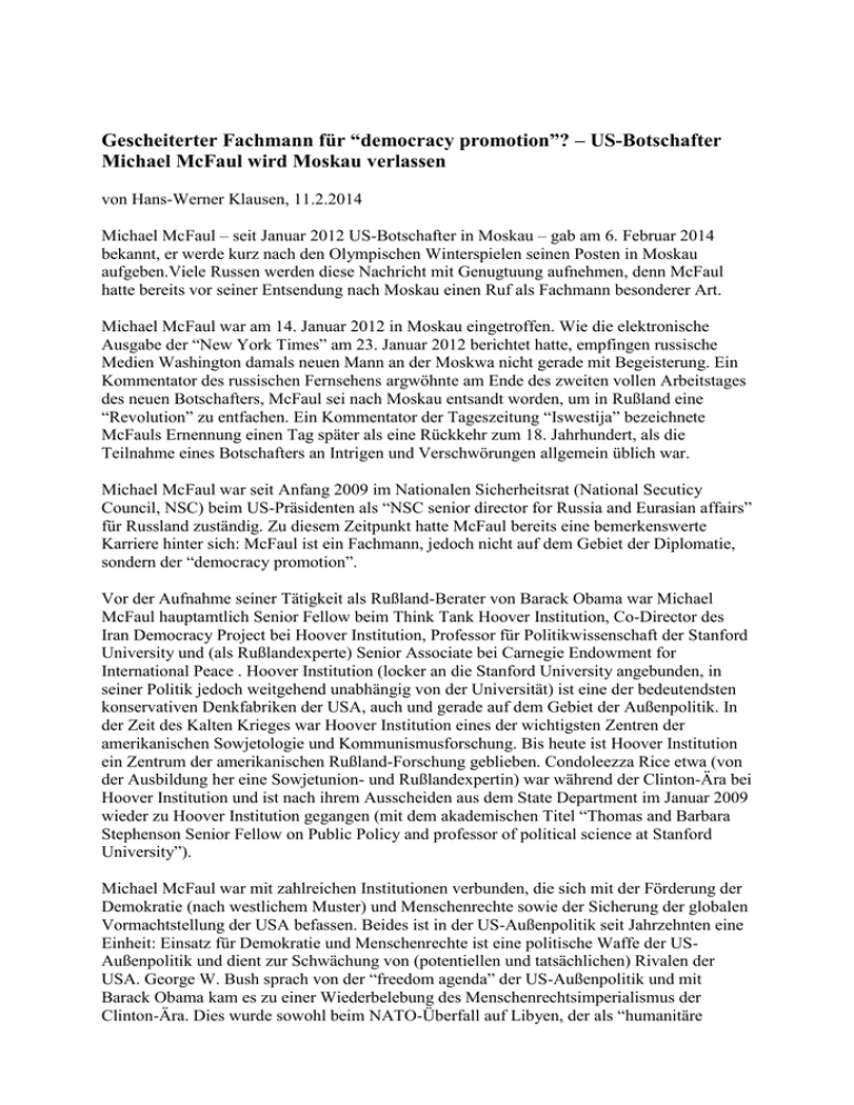 Gescheiterter Fachmann für “democracy promotion”? – US-Botschafter Michael McFaul wird Moskau verlassen von Hans-Werner Klausen, 11.2.2014 Michael McFaul – seit Januar 2012 US-Botschafter in Moskau – gab am 6. Februar 2014 bekannt, er werde kurz nach den Olympischen Winterspielen seinen Posten in Moskau aufgeben.Viele Russen werden diese Nachricht mit Genugtuung aufnehmen, denn McFaul hatte bereits vor seiner Entsendung nach Moskau einen Ruf als Fachmann besonderer Art. Michael McFaul war am 14. Januar 2012 in Moskau eingetroffen. Wie die elektronische Ausgabe der “New York Times” am 23. Januar 2012 berichtet hatte, empfingen russische Medien Washington damals neuen Mann an der Moskwa nicht gerade mit Begeisterung. Ein Kommentator des russischen Fernsehens argwöhnte am Ende des zweiten vollen Arbeitstages des neuen Botschafters, McFaul sei nach Moskau entsandt worden, um in Rußland eine “Revolution” zu entfachen. Ein Kommentator der Tageszeitung “Iswestija” bezeichnete McFauls Ernennung einen Tag später als eine Rückkehr zum 18. Jahrhundert, als die Teilnahme eines Botschafters an Intrigen und Verschwörungen allgemein üblich war. Michael McFaul war seit Anfang 2009 im Nationalen Sicherheitsrat (National Secuticy Council, NSC) beim US-Präsidenten als “NSC senior director for Russia and Eurasian affairs” für Russland zuständig. Zu diesem Zeitpunkt hatte McFaul bereits eine bemerkenswerte Karriere hinter sich: McFaul ist ein Fachmann, jedoch nicht auf dem Gebiet der Diplomatie, sondern der “democracy promotion”. Vor der Aufnahme seiner Tätigkeit als Rußland-Berater von Barack Obama war Michael McFaul hauptamtlich Senior Fellow beim Think Tank Hoover Institution, Co-Director des Iran Democracy Project bei Hoover Institution, Professor für Politikwissenschaft der Stanford University und (als Rußlandexperte) Senior Associate bei Carnegie Endowment for International Peace . Hoover Institution (locker an die Stanford University angebunden, in seiner Politik jedoch weitgehend unabhängig von der Universität) ist eine der bedeutendsten konservativen Denkfabriken der USA, auch und gerade auf dem Gebiet der Außenpolitik. In der Zeit des Kalten Krieges war Hoover Institution eines der wichtigsten Zentren der amerikanischen Sowjetologie und Kommunismusforschung. Bis heute ist Hoover Institution ein Zentrum der amerikanischen Rußland-Forschung geblieben. Condoleezza Rice etwa (von der Ausbildung her eine Sowjetunion- und Rußlandexpertin) war während der Clinton-Ära bei Hoover Institution und ist nach ihrem Ausscheiden aus dem State Department im Januar 2009 wieder zu Hoover Institution gegangen (mit dem akademischen Titel “Thomas and Barbara Stephenson Senior Fellow on Public Policy and professor of political science at Stanford University”). Michael McFaul war mit zahlreichen Institutionen verbunden, die sich mit der Förderung der Demokratie (nach westlichem Muster) und Menschenrechte sowie der Sicherung der globalen Vormachtstellung der USA befassen. Beides ist in der US-Außenpolitik seit Jahrzehnten eine Einheit: Einsatz für Demokratie und Menschenrechte ist eine politische Waffe der USAußenpolitik und dient zur Schwächung von (potentiellen und tatsächlichen) Rivalen der USA. George W. Bush sprach von der “freedom agenda” der US-Außenpolitik und mit Barack Obama kam es zu einer Wiederbelebung des Menschenrechtsimperialismus der Clinton-Ära. Dies wurde sowohl beim NATO-Überfall auf Libyen, der als “humanitäre Intervention” präsentiert wurde, als auch mit der Lügenpropaganda zugunsten der in Syrien operierenden islamistischen Mörderbanden, eindrucksvoll vorgeführt. Man kann Persönlichkeiten wie Michael McFaul dabei durchaus guten Glauben zubilligen, wenn sie sich gleichzeitig für “democracy promotion” und Sicherung der globalen Vorherrschaft der USA einsetzen. Für die mit der westlichen Demokratie beglückten Völker ist dieses Wirken oftmals allerdings wenig segensreich: in Rußland etwa ist seit den für das Land und seine Bevölkerung katastrophalen Folgen der “Reformen” aus der Jelzin-Ära das Wort “Demokrat” ein Schimpfwort und die “demokratische” Jelzin-Ära ist für die Russen die Zeit der “Dermokrazia” (auf die Wiedergabe der deutschen Übersetzung dieses Wortes möchte der Schreiber dieser Zeilen verzichten). Einen guten Einblick in die Denkweise des US-Botschafters Michael McFaul bietet ein Artikel, den Michael McFaul im Jahre 2002 (Ausgabe April/Mai 2002) in der von Hoover Institution herausgegebenen Zeitschrift “Policy Review” veröffentlicht hatte. Der Artikel trug die programmatische Überschrift “The Liberty Doctrine: Reclaiming the purpose of American power”. McFaul schrieb dort: “Eine neue große Vision für die Anwendung amerikanischer Macht ist nötig. [...] Die Verfolgung der Freiheitsdoktrin als eine Anleitung der amerikanischen Außenpolitik bedeutet, die Förderung individueller Freiheit im Ausland an die Spitze der Agenda zu setzten. Eine Förderung der Freiheit erfordert zunächst die Eindämmung und danach die Eliminierung der gegen die Freiheit gerichteten Kräfte, seien es Individuen, Bewegungen oder Regime. Danach kommt die Konstruktion pro-freiheitlicher Kräfte. [...] Schließlich kommt die Etablierung von Regierungen, die die Freiheit ihrer eigenen Bevölkerung ebenso schätzen und schützten, wie dies die Vereinigten Staaten tun.” (zitiert nach: IMI-Analyse 2008/037, vom 5.11. 2008. Barack Obama: Vorsicht vor allzu großen Hoffnungen! http://www.imi-online.de/2008/11/05/barack-obama-vorsich/ Mit der staatsnahen Nichtregierungsorganisation Freedom House war Michael McFaul ungefähr seit dem Jahre 2006 als Mitglied des Board of Trustees verbunden (Donald Rumsfeld und Paul Wolfowitz hatten während der Clinton-Ära zu den Mitglieder des Board of Board of Trustees von Freedom House gehört; in den Jahren 2002 bis 2005 war der ehemalige CIA-Chef R. James Woolsey 