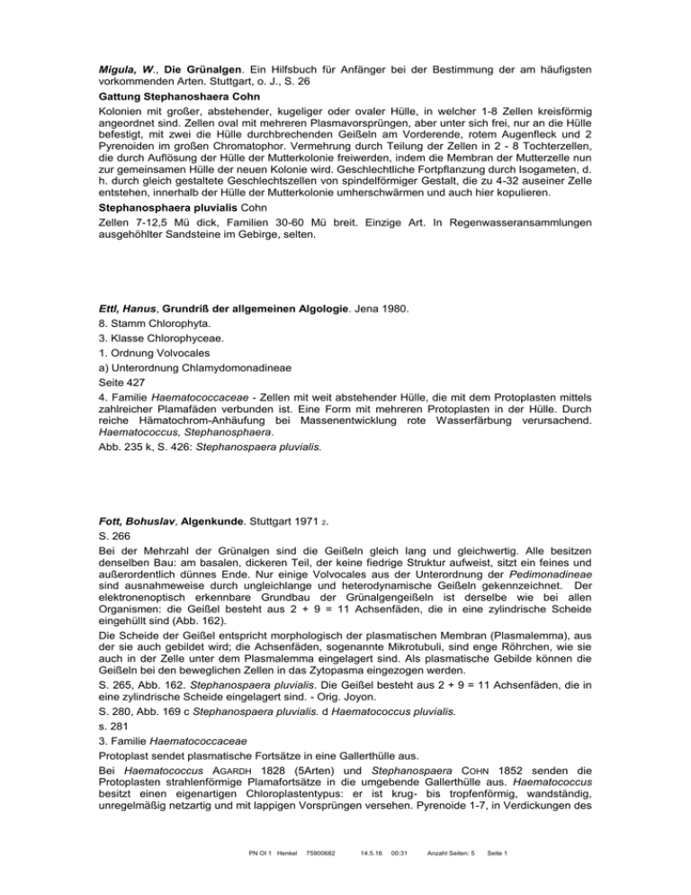 Migula, W., Die Grünalgen. Ein Hilfsbuch für Anfänger bei der Bestimmung der am häufigsten vorkommenden Arten. Stuttgart, o. J., S. 26 Gattung Stephanoshaera Cohn Kolonien mit großer, abstehender, kugeliger oder ovaler Hülle, in welcher 1-8 Zellen kreisförmig angeordnet sind. Zellen oval mit mehreren Plasmavorsprüngen, aber unter sich frei, nur an die Hülle befestigt, mit zwei die Hülle durchbrechenden Geißeln am Vorderende, rotem Augenfleck und 2 Pyrenoiden im großen Chromatophor. Vermehrung durch Teilung der Zellen in 2 - 8 Tochterzellen, die durch Auflösung der Hülle der Mutterkolonie freiwerden, indem die Membran der Mutterzelle nun zur gemeinsamen Hülle der neuen Kolonie wird. Geschlechtliche Fortpflanzung durch Isogameten, d. h. durch gleich gestaltete Geschlechtszellen von spindelförmiger Gestalt, die zu 4-32 auseiner Zelle entstehen, innerhalb der Hülle der Mutterkolonie umherschwärmen und auch hier kopulieren. Stephanosphaera pluvialis Cohn Zellen 7-12,5 Mü dick, Familien 30-60 Mü breit. Einzige Art. In Regenwasseransammlungen ausgehöhlter Sandsteine im Gebirge, selten. Ettl, Hanus, Grundriß der allgemeinen Algologie. Jena 1980. 8. Stamm Chlorophyta. 3. Klasse Chlorophyceae. 1. Ordnung Volvocales a) Unterordnung Chlamydomonadineae Seite 427 4. Familie Haematococcaceae - Zellen mit weit abstehender Hülle, die mit dem Protoplasten mittels zahlreicher Plamafäden verbunden ist. Eine Form mit mehreren Protoplasten in der Hülle. Durch reiche Hämatochrom-Anhäufung bei Massenentwicklung rote Wasserfärbung verursachend. Haematococcus, Stephanosphaera. Abb. 235 k, S. 426: Stephanospaera pluvialis. Fott, Bohuslav, Algenkunde. Stuttgart 1971 2. S. 266 Bei der Mehrzahl der Grünalgen sind die Geißeln gleich lang und gleichwertig. Alle besitzen denselben Bau: am basalen, dickeren Teil, der keine fiedrige Struktur aufweist, sitzt ein feines und außerordentlich dünnes Ende. Nur einige Volvocales aus der Unterordnung der Pedimonadineae sind ausnahmeweise durch ungleichlange und heterodynamische Geißeln gekennzeichnet. Der elektronenoptisch erkennbare Grundbau der Grünalgengeißeln ist derselbe wie bei allen Organismen: die Geißel besteht aus 2 + 9 = 11 Achsenfäden, die in eine zylindrische Scheide eingehüllt sind (Abb. 162). Die Scheide der Geißel entspricht morphologisch der plasmatischen Membran (Plasmalemma), aus der sie auch gebildet wird; die Achsenfäden, sogenannte Mikrotubuli, sind enge Röhrchen, wie sie auch in der Zelle unter dem Plasmalemma eingelagert sind. Als plasmatische Gebilde können die Geißeln bei den beweglichen Zellen in das Zytopasma eingezogen werden. S. 265, Abb. 162. Stephanospaera pluvialis. Die Geißel besteht aus 2 + 9 = 11 Achsenfäden, die in eine zylindrische Scheide eingelagert sind. - Orig. Joyon. S. 280, Abb. 169 c Stephanospaera pluvialis. d Haematococcus pluvialis. s. 281 3. Familie Haematococcaceae Protoplast sendet plasmatische Fortsätze in eine Gallerthülle aus. Bei Haematococcus AGARDH 1828 (5Arten) und Stephanospaera COHN 1852 senden die Protoplasten strahlenförmige Plamafortsätze in die umgebende Gallerthülle aus. Haematococcus besitzt einen eigenartigen Chloroplastentypus: er ist krug- bis tropfenförmig, wandständig, unregelmäßig netzartig und mit lappigen Vorsprüngen versehen. Pyrenoide 1-7, in Verdickungen des PN OI 1 Henkel 75900682 14.5.16 00:31 Anzahl Seiten: 5 Seite 1 Chloroplasten (W YGASCH 1963, 1964). In älteren Zellen sowie in Zygoten häuft sich in großen Mengen ein Gemisch von roten Karotinoiden an, das allgemein Haematochrom genannt wird. Es entsteht in der Nähe Nukleus und ist an die, dem endoplasmatischen Recticulum anliegenden Körperchen gebunden (LANG 1968). Viele pulsierende Vakuolen liegen zerstreut in der Zelle. Die Arten der Gattung Haematococcus kommen am häufigsten in Steinmulden, Betonbecken oder Freibädern vor, z. B. H. pluvialis FLOTOW (Fig. 169d). Stephanospaera mit der einzigen Art S. pluvialis COHN (Abb.169: c) bildet Kolonien mit 8-16 Protoplasten. Diese sind in eine Gallertkugel eingebettet, aus der nur die Geißeln der einzelnen Individuen herausragen. Bei ungeschlechtlicher Vermehrung werden in den einzelnen Zellen Tochterkolonien gebildet. Die geschlechtliche Vermehrung vollzieht sich durch Kopulation von Isogameten. Stephanospaera ist in bezug auf Vorkommen und Ökologie seht interessant. Gemeinsam mit der Gattung Haematococcus vermehrt sie sich in großer Menge in Mulden der Felsen, wo sich Regenwasser sammelt; nach dem Austrocknen bleiben die Mulden durch die goldgelben bis roten Überzüge der organismen gefärbt. Hoek, Christiaan van den, Algen. Einführung in die Phykologie, Stuttgart 1978. S. 288 Haematococcus (Abb. 79 d) Die Alge unterscheidet sich von Sphaerellopsis durch feine Plasmaausstülpungen, die vom Protoplasten in die Schleimschicht ausstrahlen. Die Zellen sind meistens durch carotinoide Pigmente ("Haematochrom"), die im Cytoplasma liegen, rot gefärbt. Die meisten Arten kommen in Regenwasserpfützen vor, in denen sie Wasserblüte erzeugen können. Einige koloniebildende Vertreter der Ordnung Volvocales (Abb. 80, 81) Stephanospaera (Abb. 80 d) Acht bis sechzehn Zellen, die dünne, verzweigte Ausläufer besitzen, liegen in eine gemeinsame Gallertkugel eingebettet, aus der die Geißeln der Zellen herausragen, Stephanospaera pluvialis ist die einzige Art der Gattung. In Regenpfützen auf Felsen kann diese Alge zusammen mit Haematococcus-Arten Wasserblüte bilden. Round, F. E., Biologie der Algen. Eine Einführung. Stuttgart 1975. S. 192 Kohlenstoff. Die Kohlenstoffquellen sind Kohlendioxid, Carbonate, Bicarbonate oder organische Verbindungen. ... S 193 Einige Algen können auch energiereiche organische Verbindungen aufnehmen und verwerten, obwohl sie Photosynthesepigmente besitzen. Diese Organismen kann man fakultativ chemoorganotroph nennen, da sie mit oder ohne Licht wachsen. Den obligat chemo-organotrophen Algen fehlen die Photosynthesepigmente. D