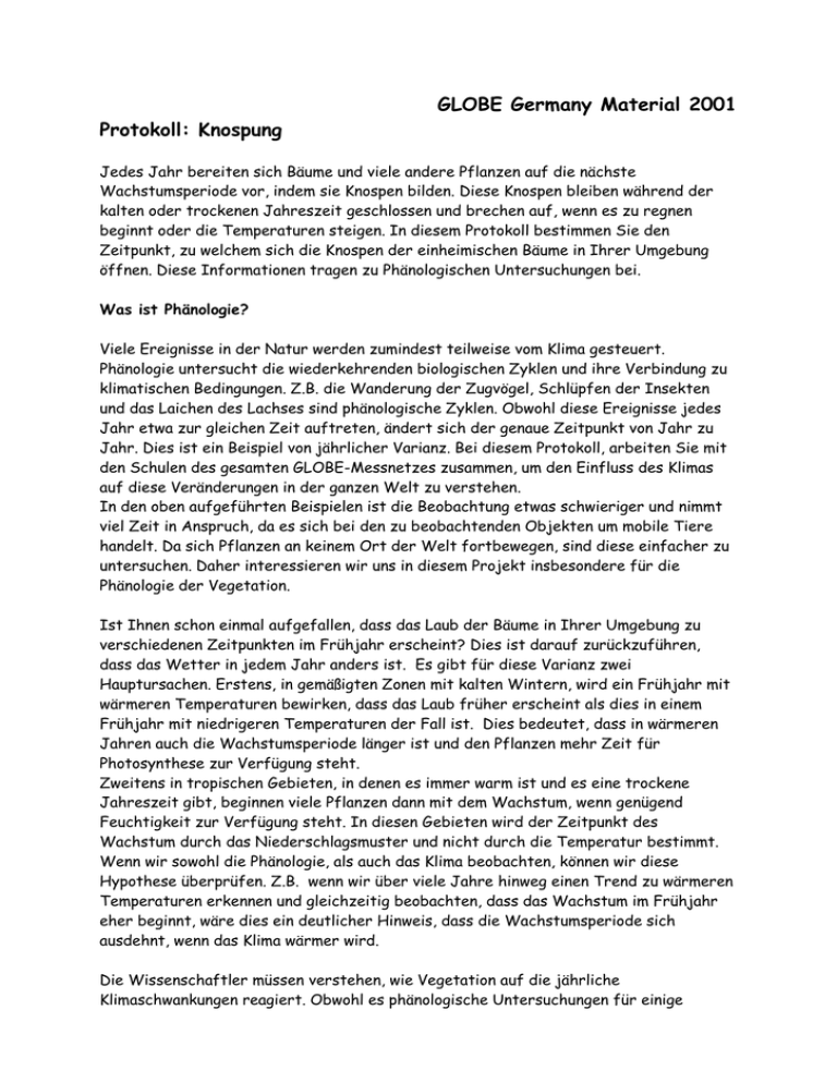 GLOBE Germany Material 2001 Protokoll: Knospung Jedes Jahr bereiten sich Bäume und viele andere Pflanzen auf die nächste Wachstumsperiode vor, indem sie Knospen bilden. Diese Knospen bleiben während der kalten oder trockenen Jahreszeit geschlossen und brechen auf, wenn es zu regnen beginnt oder die Temperaturen steigen. In diesem Protokoll bestimmen Sie den Zeitpunkt, zu welchem sich die Knospen der einheimischen Bäume in Ihrer Umgebung öffnen. Diese Informationen tragen zu Phänologischen Untersuchungen bei. Was ist Phänologie? Viele Ereignisse in der Natur werden zumindest teilweise vom Klima gesteuert. Phänologie untersucht die wiederkehrenden biologischen Zyklen und ihre Verbindung zu klimatischen Bedingungen. Z.B. die Wanderung der Zugvögel, Schlüpfen der Insekten und das Laichen des Lachses sind phänologische Zyklen. Obwohl diese Ereignisse jedes Jahr etwa zur gleichen Zeit auftreten, ändert sich der genaue Zeitpunkt von Jahr zu Jahr. Dies ist ein Beispiel von jährlicher Varianz. Bei diesem Protokoll, arbeiten Sie mit den Schulen des gesamten GLOBE-Messnetzes zusammen, um den Einfluss des Klimas auf diese Veränderungen in der ganzen Welt zu verstehen. In den oben aufgeführten Beispielen ist die Beobachtung etwas schwieriger und nimmt viel Zeit in Anspruch, da es sich bei den zu beobachtenden Objekten um mobile Tiere handelt. Da sich Pflanzen an keinem Ort der Welt fortbewegen, sind diese einfacher zu untersuchen. Daher interessieren wir uns in diesem Projekt insbesondere für die Phänologie der Vegetation. Ist Ihnen schon einmal aufgefallen, dass das Laub der Bäume in Ihrer Umgebung zu verschiedenen Zeitpunkten im Frühjahr erscheint? Dies ist darauf zurückzuführen, dass das Wetter in jedem Jahr anders ist. Es gibt für diese Varianz zwei Hauptursachen. Erstens, in gemäßigten Zonen mit kalten Wintern, wird ein Frühjahr mit wärmeren Temperaturen bewirken, dass das Laub früher erscheint als dies in einem Frühjahr mit niedrigeren Temperaturen der Fall ist. Dies bedeutet, dass in wärmeren Jahren auch die Wachstumsperiode länger ist und den Pflanzen mehr Zeit für Photosynthese zur Verfügung steht. Zweitens in tropischen Gebieten, in denen es immer warm ist und es eine trockene Jahreszeit gibt, beginnen viele Pflanzen dann mit dem Wachstum, wenn genügend Feuchtigkeit zur Verfügung steht. In diesen Gebieten wird der Zeitpunkt des Wachstum durch das Niederschlagsmuster und nicht durch die Temperatur bestimmt. Wenn wir sowohl die Phänologie, als auch das Klima beobachten, können wir diese Hypothese überprüfen. Z.B. wenn wir über viele Jahre hinweg einen Trend zu wärmeren Temperaturen erkennen und gleichzeitig beobachten, dass das Wachstum im Frühjahr eher beginnt, wäre dies ein deutlicher Hinweis, dass die Wachstumsperiode sich ausdehnt, wenn das Klima wärmer wird. Die Wissenschaftler müssen verstehen, wie Vegetation auf die jährliche Klimaschwankungen reagiert. Obwohl es phänologische Untersuchungen für einige Gebiete und einige Vegetationsarten gibt, hat es nie eine einheitliche weltweite Initiative zur phänologischen Beobachtung von Vegetation gegeben. Wenn sie an diesem Projekt teilnehmen, können Sie selbst erforschen, wie Vegetation auf das Klima reagiert und Sie bieten darüber hinaus wichtige Informationen, die nötig sind um den globalen Einfluss des Klimas auf die Vegetation zu verstehen. Bevor Sie beginnen, sollten Sie sich das Atmosphären Kapitel im Lehrerhandbuch durchlesen. Vergegenwärtigen Sie sich den Unterschied zwischen Wetter und Klima. Wetter ist das was man heute, morgen oder nächste Woche erlebt. Klima dagegen beschreibt das Wetter über einen längeren Zeitraum. Der Zeitpunkt der Knospung hängt vom Wetter während des Frühjahrs ab. In jedem Jahr ist das Wetter etwas anders. Wenn Sie die Durchschnittstemperaturen und -niederschlagswerte der verschiedenen Jahre miteinander vergleichen, erhalten Sie die jährliche Varianz des Klimas. Nachdem Sie die Daten an Ihrer Schule über mehrere Jahre gesammelt haben, können Sie die Klimadaten mit den Zeitpunkten der Knospung vergleichen. Sie können dann feststellen, ob das Klima sich ändert und wie die Bäume auf diese Änderung reagieren. Was ist Knospung? Bei Laubbäumen, Büschen und Sträuchern kann man die Wachstumsperionde durch das Erscheinen des Laubes bzw. das Abfallen des Laubes bestimmen. Knospen sind kleine, harte Schutzstrukturen, welche die Blätter im Kleinformat enthalten. Im Frühjahr öffnen sich die Knospen und die neuen Blätter breiten sich aus. Dieses Öffnen der Knospen bezeichnen wir als Knospung. Diese ist leicht zu erkennen. Im Herbst werden die Blätter gelb, rot oder orange und fallen z.B. auch von der Pflanze ab. Diese Erscheinungen wie Verfärbung und Abfallen der Blätter sind im Gegensatz zur Knospung allmähliche Prozesse. Weil hier kein spezifisches Ereignis gefunden werden kann, ist es schwierig, ein genaues Datum für das Ende der Wachstumsperiode anzugeben. Bei immergrünen Gewächsen, bei denen sich das ganze Jahr über Blätter am Baum befinden, ist das Ende der Wachstumsperiode noch schwieriger festzustellen. Auch wird in gemäßigten Klimazonen das Ende der Wachstumsperiode durch die Anzahl der Stunden Tageslicht kontrolliert. Da das Tageslicht für einen bestimmten Tag im Jahr immer gleich ist, endet die Wachstumsperiode im Gegensatz zu ihrem Beginn, welcher durch die Temperatur bestimmt wird, regelmäßig. Wir beobachten daher nur den Beginn der Wachstumsperiode, die Knospung. Protokoll Knospung Zweck Die Beobachtung der Knospung an ausgewählten Bäumen am Messort für Biologie, quantitativer Landbedeckung oder an einem zusätzlich für Phänologie bestimmten Messort. Überblick Die Knospung ist ein Beispiel für einen phänologischen Zyklus. Der Zeitpunkt der Knospung wird entweder durch die Temperatur oder Feuchtigkeit beeinflusst. Die Beobachtungen können dazu herangezogen werden die regionale und globale Verteilung der Vegetation z