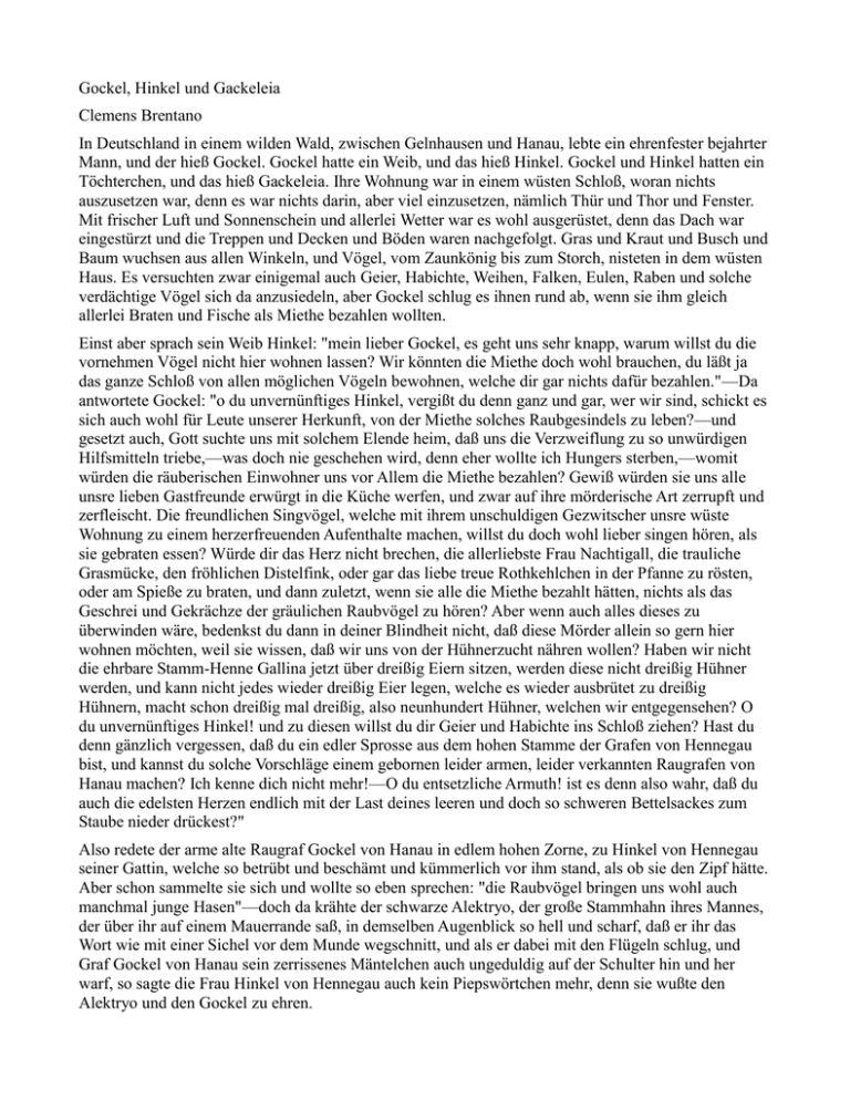 Gockel, Hinkel und Gackeleia Clemens Brentano In Deutschland in einem wilden Wald, zwischen Gelnhausen und Hanau, lebte ein ehrenfester bejahrter Mann, und der hieß Gockel. Gockel hatte ein Weib, und das hieß Hinkel. Gockel und Hinkel hatten ein Töchterchen, und das hieß Gackeleia. Ihre Wohnung war in einem wüsten Schloß, woran nichts auszusetzen war, denn es war nichts darin, aber viel einzusetzen, nämlich Thür und Thor und Fenster. Mit frischer Luft und Sonnenschein und allerlei Wetter war es wohl ausgerüstet, denn das Dach war eingestürzt und die Treppen und Decken und Böden waren nachgefolgt. Gras und Kraut und Busch und Baum wuchsen aus allen Winkeln, und Vögel, vom Zaunkönig bis zum Storch, nisteten in dem wüsten Haus. Es versuchten zwar einigemal auch Geier, Habichte, Weihen, Falken, Eulen, Raben und solche verdächtige Vögel sich da anzusiedeln, aber Gockel schlug es ihnen rund ab, wenn sie ihm gleich allerlei Braten und Fische als Miethe bezahlen wollten. Einst aber sprach sein Weib Hinkel: "mein lieber Gockel, es geht uns sehr knapp, warum willst du die vornehmen Vögel nicht hier wohnen lassen? Wir könnten die Miethe doch wohl brauchen, du läßt ja das ganze Schloß von allen möglichen Vögeln bewohnen, welche dir gar nichts dafür bezahlen."—Da antwortete Gockel: "o du unvernünftiges Hinkel, vergißt du denn ganz und gar, wer wir sind, schickt es sich auch wohl für Leute unserer Herkunft, von der Miethe solches Raubgesindels zu leben?—und gesetzt auch, Gott suchte uns mit solchem Elende heim, daß uns die Verzweiflung zu so unwürdigen Hilfsmitteln triebe,—was doch nie geschehen wird, denn eher wollte ich Hungers sterben,—womit würden die räuberischen Einwohner uns vor Allem die Miethe bezahlen? Gewiß würden sie uns alle unsre lieben Gastfreunde erwürgt in die Küche werfen, und zwar auf ihre mörderische Art zerrupft und zerfleischt. Die freundlichen Singvögel, welche mit ihrem unschuldigen Gezwitscher unsre wüste Wohnung zu einem herzerfreuenden Aufenthalte machen, willst du doch wohl lieber singen hören, als sie gebraten essen? Würde dir das Herz nicht brechen, die allerliebste Frau Nachtigall, die trauliche Grasmücke, den fröhlichen Distelfink, oder gar das liebe treue Rothkehlchen in der Pfanne zu rösten, oder am Spieße zu braten, und dann zuletzt, wenn sie alle die Miethe bezahlt hätten, nichts als das Geschrei und Gekrächze der gräulichen Raubvögel zu hören? Aber wenn auch alles dieses zu überwinden wäre, bedenkst du dann in deiner Blindheit nicht, daß diese Mörder allein so gern hier wohnen möchten, weil sie wissen, daß wir uns von der Hühnerzucht nähren wollen? Haben wir nicht die ehrbare Stamm-Henne Gallina jetzt über dreißig Eiern sitzen, werden diese nicht dreißig Hühner werden, und kann nicht jedes wieder dreißig Eier legen, welche es wieder ausbrütet zu dreißig Hühnern, macht schon dreißig mal dreißig, also neunhundert Hühner, welchen wir entgegensehen? O du unvernünftiges Hinkel! und zu diesen willst du dir Geier und Habichte ins Schloß ziehen? Hast du denn gänzlich vergessen, daß du ein edler Sprosse aus dem hohen Stamme der Grafen von Hennegau bist, und kannst du solche Vorschläge einem gebornen leider armen, leider verkannten Raugrafen von Hanau machen? Ich kenne dich nicht mehr!—O du entsetzliche Armuth! ist es denn also wahr, daß du auch die edelsten Herzen endlich mit der Last deines leeren und doch so schweren Bettelsackes zum Staube nieder drückest?" Also redete der arme alte Raugraf Gockel von Hanau in edlem hohen Zorne, zu Hinkel von Hennegau seiner Gattin, welche so betrübt und beschämt und kümmerlich vor ihm stand, als ob sie den Zipf hätte. Aber schon sammelte sie sich und wollte so eben sprechen: "die Raubvögel bringen uns wohl auch manchmal junge Hasen"—doch da krähte der schwarze Alektryo, der große Stammhahn ihres Mannes, der über ihr auf einem Mauerrande saß, in demselben Augenblick so hell und scharf, daß er ihr das Wort wie mit einer Sichel vor dem Munde wegschnitt, und als er dabei mit den Flügeln schlug, und Graf Gockel von Hanau sein zerrissenes Mäntelchen auch ungeduldig auf der Schulter hin und her warf, so sagte die Frau Hinkel von Hennegau auch kein Piepswörtchen mehr, denn sie wußte den Alektryo und den Gockel zu ehren. Sie wollte eben umwenden und weggehen, da sagte Gockel: "o Hinkel! ich brauche dir nichts mehr zu sagen, der ritterliche Alektryo, der Herold, Wappenprüfer und Kreiswärtel, Notarius Publikus und kaiserlich gekrönte Poet meiner Vorfahren hat meine Rede unterkrähet, und somit dagegen protestirt, daß seinen Nachkommen, den zu erwartenden Hühnchen, die gefährlichen Raubvögel zugesellt würden." Bei diesen letzten Worten bückte sich Frau Hinkel bereits unter der niedrigen Thüre und verschwand mit einem tiefen Seufzer im Hühnerstall. Im Hühnerstall? Ja—denn im wunderbaren, kunstreichen, im neben-, durch—und hintereinandrigen Stil der Urwelt, Mitwelt und Nachwelt erbauten Hühnerstall wohnten Gockel von Hanau, Hinkel von Hennegau und Gackeleia, ihre Fräulein Tochter, und in der Ecke stand in einem alten Schilde das auf gothische Weise von Stroh geflochtene Raugraf Gockelsche Erbhühnernest, in welchem die Glucke Gallina über den dreißig Eiern brütete, und von einer Wand zur andern ruhte eine alte Lanze in zwei Mauerlöchern, auf welcher sitzend der schwarze Alektryo Nachts zu schlafen pflegte. Der Hühnerstall war der einzige Raum in dem alten Schloße, der noch bewohnbar unter Dach und Fach stand. Zu Olims Zeiten, wo Dieses und Jenes geschehen ist, war dieses Schloß eines der herrlichsten und deutlichsten in ganz Deutschland; aber die Franzosen haben es so übel mitgenommen, daß sie es recht abscheulich zurückließen. Ihr König Hahnri hatte gesagt, jeder Franzose solle Sonntags ein Huhn, und wenn keines zu haben sei, ein Hinkel in den Topf stecken und sich eine Suppe kochen. Darauf hielten sie streng, und sahen 