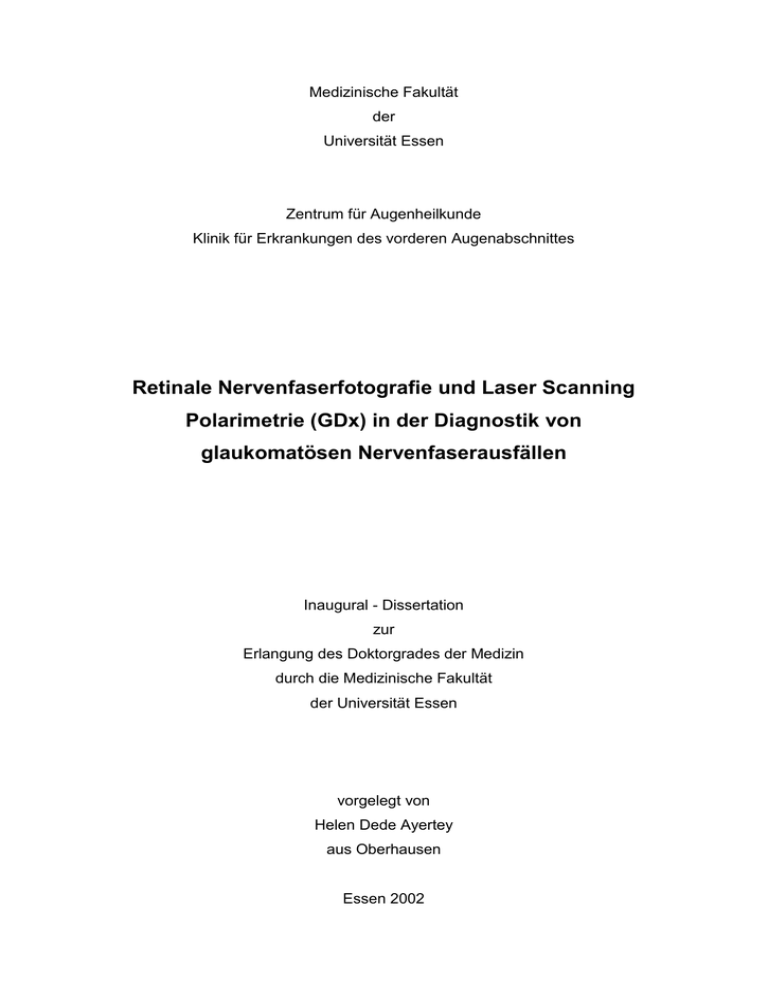 Medizinische Fakultät der Universität Essen Zentrum für Augenheilkunde Klinik für Erkrankungen des vorderen Augenabschnittes Retinale Nervenfaserfotografie und Laser Scanning Polarimetrie (GDx) in der Diagnostik von glaukomatösen Nervenfaserausfällen Inaugural - Dissertation zur Erlangung des Doktorgrades der Medizin durch die Medizinische Fakultät der Universität Essen vorgelegt von Helen Dede Ayertey aus Oberhausen Essen 2002 2 Dekan: Univ.-Prof. Dr. med. H. Grosse-Wilde 1. Gutachter: Univ.-Prof. Dr. med. K.-P. Steuhl 2. Gutachterin: Univ.-Prof. Dr. med. D. Timmann-Braun Tag der mündlichen Prüfung: 12. Juli 2002 3 Vorabveröffentlichungen Wissenschaftliche Zeitschriften: Kremmer, S., Ayertey, H.D., Selbach, J.M., Steuhl, K.P.(2000): Scanning laser polarimetry, retinal nerve fiber layer photography and perimetry in the diagnosis of glaucomatous nerve fiber defects. Graefe´s Arch Clin Exp Ophthalmol 238, 922-926 Zitierfähige Zusammenfassungen: Kremmer, S., Ayertey, H.D., Steuhl, K.P.(1999): Retinale Nervenfaserfotografie und Laser Scanning Polarimetrie (GDx) in der Diagnostik von glaukomatösen Nervenfaserausfällen. Ophthalmologe, 96, Suppl.1, K23 Steuhl, K.P., Ayertey, H.D., Selbach, J.M., Kremmer, S.(2000): Retinal Nerve fiber photography and scanning laser polarimetry (GDx) in the diagnosis of glaucomatous nerve fiber defects. IOVS, 41/4, 1509-B884, S286 4 Erklärung Ich erkläre hiermit, daß ich die vorliegende Arbeit ohne unzulässige Hilfe Dritter und ohne Benutzung anderer als der angegebenen Hilfsmittel angefertigt habe; die aus fremden Quellen direkt oder indirekt übernommenen Gedanken sind als solche kenntlich gemacht. Bei der Auswahl und Auswertung des Materials sowie bei der Herstellung des Manuskriptes habe ich Unterstützungsleistung von folgender Person erhalten: - Herrn Dr. Stephan Kremmer, Oberarzt der Klinik Weitere Personen waren an der geistigen Herstellung der vorliegenden Arbeit nicht beteiligt. Insbesondere habe ich nicht die Hilfe eines Promotionsberaters in Anspruch genommen. Dritte haben von mir weder unmittelbar noch mittelbar geldwerte Leistungen für Arbeiten erhalten, die im Zusammenhang mit dem Inhalt der vorliegenden Dissertation stehen. Die Arbeit wurde von mir bisher weder im Inland noch im Ausland in gleicher oder ähnlicher Form einer anderen Prüfungsbehörde vorgelegt. Köln, den 5 Die dieser Arbeit zugrunde liegenden perimetrischen und polarimetrischen Messungen sind nach entsprechender Anleitung durch Herrn Dr. Stephan Kremmer von mir selbst durchgeführt worden. Die augenärztlichen Untersuchungen der Patienten wurden von Herrn Dr. Stephan Kremmer oder dazu berechtigten Mitarbeitern der Universitätsaugenklinik Essen durchgeführt. Die Nervenfaserfotografien wurden durch Frau Polowczyk und Frau Behne in der Fotoabteilung der Universitätsaugenklinik Essen durchgeführt. 6 Danksagungen Herrn Universitätsprofessor Dr. med. K.-P. Steuhl danke ich für die Überlassung des Themas und die Möglichkeit, die vorliegende Arbeit in seinem Hause durchzuführen. Herrn Dr. med. S. Kremmer danke ich für die wissenschaftliche Betreuung und die umfangreiche Hilfe während der gesamten Bearbeitungszeit. Frau Polowszyk und Frau Behne danke ich für die Durchführung der Nervenfaserfotografien. Ein besonderer Dank gilt den Patienten für Ihre geduldige Teilnahme an den Untersuchungen. 7 Für meine Eltern und Christoph 8 Inhaltsverzeichnis 1. Einleitung .......................................................................................... 12 1.1. Anatomie des Sehnervenkopfes und der Netzhaut .........................................12 1.1.1. Nervus opticus und Lamina cribrosa ........................................................12 1.1.2. Feinstruktur der Retina .............................................................................13 1.1.3. Blutversorgung der Papille .......................................................................16 1.1.3.1. Retrolaminäre Nervenfaserschicht.....................................................16 1.1.3.2. Lamina cribrosa..................................................................................16 1.1.3.3. Prälaminäre Nervenfaserschicht.........................................................17 1.1.3.4. Oberflächliche Nervenfaserschicht.....................................................17 1.2. Optikusatrophie ...............................................................................................18 1.2.1. einfache Optikusatrophie ..........................................................................18 1.2.2. komplexe Optikusatrophie ........................................................................18 1.2.3. glaukomatöse Optikusatrophie .................................................................18 1.3. Definition des Glaukoms .................................................................................20 1.4. Einteilung der Glaukomformen ........................................................................22 1.4.1. Glaukomformen ........................................................................................23 1.4.1.1. Primäres Offenwinkelglaukom............................................................23 1.4.1.2. Normaldruckglaukom..........................................................................23 1.4.1.3. Sonstige Glaukomformen...................................................................24 1.5. Diagnose des Glaukoms .................................................................................27 1.5.1. Tonometrie ...............................................................................................27 1.5.2. Perimetrie .................................................................................................28 1.5.3. Ophthalmoskopie der Papille ....................................................................29 1.5.4. Untersuchung der retinalen Nervenfaserschicht...................................... 29 9 1.6