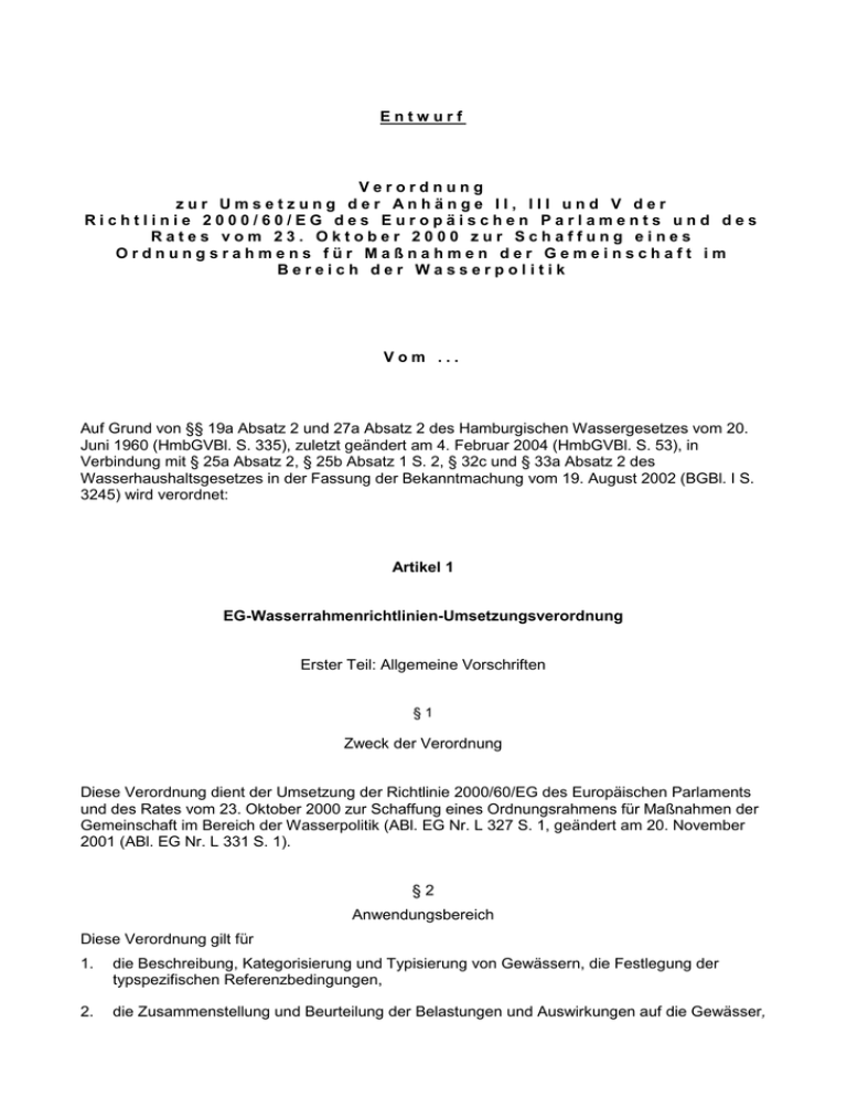 Entwurf Verordnung zur Umsetzung der Anhänge II, III und V der Richtlinie 2000/60/EG des Europäischen Parlaments und des Rates vom 23. Oktober 2000 zur Schaffung eines Ordnungsrahmens für Maßnahmen der Gemeinschaft im Bereich der Wasserpolitik Vom ... Auf Grund von §§ 19a Absatz 2 und 27a Absatz 2 des Hamburgischen Wassergesetzes vom 20. Juni 1960 (HmbGVBl. S. 335), zuletzt geändert am 4. Februar 2004 (HmbGVBl. S. 53), in Verbindung mit § 25a Absatz 2, § 25b Absatz 1 S. 2, § 32c und § 33a Absatz 2 des Wasserhaushaltsgesetzes in der Fassung der Bekanntmachung vom 19. August 2002 (BGBl. I S. 3245) wird verordnet: Artikel 1 EG-Wasserrahmenrichtlinien-Umsetzungsverordnung Erster Teil: Allgemeine Vorschriften §1 Zweck der Verordnung Diese Verordnung dient der Umsetzung der Richtlinie 2000/60/EG des Europäischen Parlaments und des Rates vom 23. Oktober 2000 zur Schaffung eines Ordnungsrahmens für Maßnahmen der Gemeinschaft im Bereich der Wasserpolitik (ABl. EG Nr. L 327 S. 1, geändert am 20. November 2001 (ABl. EG Nr. L 331 S. 1). §2 Anwendungsbereich Diese Verordnung gilt für 1. die Beschreibung, Kategorisierung und Typisierung von Gewässern, die Festlegung der typspezifischen Referenzbedingungen, 2. die Zusammenstellung und Beurteilung der Belastungen und Auswirkungen auf die Gewässer, 2 3. die Überwachung des Zustands der Gewässer sowie 4. die Einstufung und Darstellung des Zustands der Gewässer. §3 Begriffsbestimmungen Im Sinne dieser Verordnung ist 1. Oberflächengewässer: ein oberirdisches Gewässer nach § 1 Absatz 1 Nummer 1 WHG, ein Übergangsgewässer nach Nummer 3 oder ein Küstengewässer nach § 1b Absatz 3 Satz 2 WHG; bei Anforderungen an den chemischen Zustand von Küstengewässern gilt die Begriffsbestimmung des § 1 Absatz 1 Nummer 1a WHG; 2. Oberflächenwasserkörper: ein einheitlicher und bedeutender Abschnitt eines Oberflächengewässers, zum Beispiel ein See, ein Speicherbecken, ein Fluss, ein sonstiges Fließgewässer oder ein Kanal, ein Teil eines Flusses, eines sonstigen Fließgewässers oder Kanals, ein Übergangsgewässer oder ein Küstengewässerstreifen; 3. Übergangsgewässer: ein Oberflächenwasserkörper in der Nähe von Flussmündungen, der aufgrund seiner Nähe zu den Küstengewässern einen gewissen Salzgehalt aufweist, aber im Wesentlichen von Süßwasserströmungen beeinflusst wird; 4. Grundwasserkörper: ein abgegrenztes Grundwasservolumen innerhalb eines oder mehrerer Grundwasserleiter; 5. Unmittelbare Einleitung in das Grundwasser: Einleitung von Stoffen in das Grundwasser ohne Versickern durch den Boden oder den Untergrund; 6. Umweltqualitätsnorm: die Konzentration eines bestimmten Schadstoffs oder einer bestimmten Schadstoffgruppe, die in Wasser, Sedimenten oder Biota aus Gründen des Gesundheits- und Umweltschutzes nicht überschritten werden darf; 7. Verschmutzung: die durch menschliche Tätigkeiten direkt oder indirekt bewirkte Freisetzung von Stoffen oder Wärme in Luft, Wasser oder Boden, die der menschlichen Gesundheit oder der Qualität der aquatischen Ökosysteme oder der direkt von ihnen abhängenden Landökosysteme schaden können, zu einer Schädigung von Sachwerten führen oder eine Beeinträchtigung oder Störung des Erholungswertes und anderer legitimer Nutzungen der Umwelt mit sich bringen. 3 Zweiter Teil: Oberflächengewässer §4 Lage, Grenzen und Zuordnung der Oberflächenwasserkörper, typenspezifische Referenzbedingungen (1) Die Oberflächenwasserkörper innerhalb einer Flussgebietseinheit sind nach Maßgabe des Anhangs 1 Nummer 1 in die Kategorien Flüsse, Seen, Übergangsgewässer und Küstengewässer eingeteilt. Ihre Lage und Grenzen sind festzulegen. Die Oberflächenwasserkörper sind nach den Absätzen 2 und 3 erstmalig zu beschreiben. Oberflächenwasserkörper können zum Zweck dieser erstmaligen Beschreibung in Gruppen zusammengefasst werden. (2) Die Oberflächenwasserkörper in jeder Kategorie sind nach Typen zu unterscheiden. Die Gewässertypen ergeben sich aus Anhang 1 Nummer 2. (3) Die Oberflächenwasserkörper, die für eine Einstufung als künstlich oder erheblich verändert in Betracht kommen, sind zu kennzeichnen. Sie sind den Typen der Gewässerkategorie zuzuordnen, der sie am ähnlichsten sind. (4) Für jeden Gewässertyp sind typspezifische Referenzbedingungen nach Anhang 1 Nummern 3.1, 3.3 bis 3.6 festzulegen, die dem sehr guten ökologischen Zustand entsprechen. Das höchste ökologische Potential nach Anhang 1 Nummer 3.2 ist im Einzelfall aus den Referenzbedingungen des Gewässertyps abzuleiten, dem der künstliche oder erheblich veränderte Oberflächenwasserkörper am ähnlichsten ist. (5) Die Anforderungen nach den Absätzen 1 bis 4 sind bis zum 22. Dezember 2004 zu erfüllen. Sie sind bis zum 22. Dezember 2013 und danach alle 6 Jahre zu überprüfen und gegebenenfalls zu aktualisieren. §5 Zusammenstellung der Gewässerbelastungen und Beurteilung ihrer Auswirkungen (1) Daten über Art und Ausmaß der signifikanten anthropogenen Belastungen der Oberflächenwasserkörper sind nach Anhang 2 zusammenzustellen und aufzubewahren. (2) Auf Grund der Zusammenstellung nach Absatz 1 ist zu beurteilen, wie empfindlich der Zustand von Oberflächenwasserkörpern auf die Belastungen reagiert. Nach Anhang 2 sind die Oberflächenwasserkörper, bei denen das Risiko besteht, dass sie die für die Gewässer festgelegten Bewirtschaftungsziele nach §§ 25a, 25b oder 32c WHG nicht erfüllen (gefährdete Oberflächenwasserkörper) zu ermitteln und, soweit erforderlich, zusätzlich zu beschreiben. (3) Die Anforderungen nach den Absätzen 1 und 2 sind bis zum 22. Dezember 2004 zu erfüllen. Sie sind bis zum 22. Dezember 2013 und danach alle 6 Jahre zu überprüfen und gegebenenfalls zu aktualisieren. §6 Anforderungen an die Einstufung des ökologischen Zustands der Oberflächengewässer (1) Die Ermittlung des ökologischen Zustands des jeweiligen Oberflächenwasserkörpers richtet sich nach den in Anhang 3 