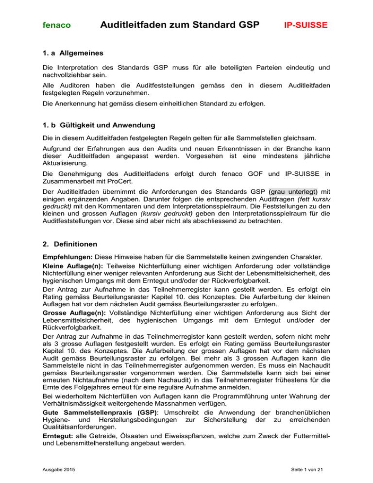 fenaco Auditleitfaden zum Standard GSP IP-SUISSE 1. a Allgemeines Die Interpretation des Standards GSP muss für alle beteiligten Parteien eindeutig und nachvollziehbar sein. Alle Auditoren haben die Auditfeststellungen gemäss den in diesem Auditleitfaden festgelegten Regeln vorzunehmen. Die Anerkennung hat gemäss diesem einheitlichen Standard zu erfolgen. 1. b Gültigkeit und Anwendung Die in diesem Auditleitfaden festgelegten Regeln gelten für alle Sammelstellen gleichsam. Aufgrund der Erfahrungen aus den Audits und neuen Erkenntnissen in der Branche kann dieser Auditleitfaden angepasst werden. Vorgesehen ist eine mindestens jährliche Aktualisierung. Die Genehmigung des Auditleitfadens erfolgt durch fenaco GOF und IP-SUISSE in Zusammenarbeit mit ProCert. Der Auditleitfaden übernimmt die Anforderungen des Standards GSP (grau unterlegt) mit einigen ergänzenden Angaben. Darunter folgen die entsprechenden Auditfragen (fett kursiv gedruckt) mit den Kommentaren und dem Interpretationsspielraum. Die Feststellungen zu den kleinen und grossen Auflagen (kursiv gedruckt) geben den Interpretationsspielraum für die Auditfeststellungen vor. Diese sind aber nicht als abschliessend zu betrachten. 2. Definitionen Empfehlungen: Diese Hinweise haben für die Sammelstelle keinen zwingenden Charakter. Kleine Auflage(n): Teilweise Nichterfüllung einer wichtigen Anforderung oder vollständige Nichterfüllung einer weniger relevanten Anforderung aus Sicht der Lebensmittelsicherheit, des hygienischen Umgangs mit dem Erntegut und/oder der Rückverfolgbarkeit. Der Antrag zur Aufnahme in das Teilnehmerregister kann gestellt werden. Es erfolgt ein Rating gemäss Beurteilungsraster Kapitel 10. des Konzeptes. Die Aufarbeitung der kleinen Auflagen hat vor dem nächsten Audit gemäss Beurteilungsraster zu erfolgen. Grosse Auflage(n): Vollständige Nichterfüllung einer wichtigen Anforderung aus Sicht der Lebensmittelsicherheit, des hygienischen Umgangs mit dem Erntegut und/oder der Rückverfolgbarkeit. Der Antrag zur Aufnahme in das Teilnehmerregister kann gestellt werden, sofern nicht mehr als 3 grosse Auflagen festgestellt wurden. Es erfolgt ein Rating gemäss Beurteilungsraster Kapitel 10. des Konzeptes. Die Aufarbeitung der grossen Auflagen hat vor dem nächsten Audit gemäss Beurteilungsraster zu erfolgen. Bei mehr als 3 grossen Auflagen kann die Sammelstelle nicht in das Teilnehmerregister aufgenommen werden. Es muss ein Nachaudit gemäss Beurteilungsraster vorgenommen werden. Die Sammelstelle kann sich bei einer erneuten Nichtaufnahme (nach dem Nachaudit) in das Teilnehmerregister frühestens für die Ernte des Folgejahres erneut für eine reguläre Aufnahme anmelden. Bei wiederholtem Nichterfüllen von Auflagen kann die Programmführung unter Wahrung der Verhältnismässigkeit weitergehende Massnahmen verfügen. Gute Sammelstellenpraxis (GSP): Umschreibt die Anwendung der branchenüblichen Hygiene- und Herstellungsbedingungen zur Sicherstellung der zu erreichenden Qualitätsanforderungen. Erntegut: alle Getreide, Ölsaaten und Eiweisspflanzen, welche zum Zweck der Futtermittelund Lebensmittelherstellung angebaut werden. Ausgabe 2015 Seite 1 von 21 fenaco Auditleitfaden zum Standard GSP IP-SUISSE Beherrschungs- und Vorbeugemassnahmen (control measures) gemäss Codex Alimentarius: Jede Tätigkeit oder Handlung, die dazu benutzt werden kann, einer Lebensmittelgefahr vorzubeugen oder diese zu eliminieren, oder diese auf ein akzeptierbares Niveau zu reduzieren. Kontrollen setzen Massnahmen und vorgegebene Zielwerte voraus. Diese Voraussetzungen entsprechen der GSP. Mit Kontrollen wird eine Überprüfung der Wirksamkeit der Beherrschungs- und Vorbeugemassnahmen sichergestellt. Korrekturmassnahmen werden bei Abweichungen vom erwünschten Status ergriffen. Verifikationsmassnahmen dienen der Überprüfung des GSP-Standards. 3. GSP – Massnahmen / Anforderungen an die Getreideproduktion 3.1 Allg. Bewirtschaftung Der Produzent hat seinen Betrieb nach den gesetzlichen Vorschriften zu bewirtschaften. Insbesondere hat er dafür zu sorgen, dass die Hilfsstoffe wie Dünger, Pflanzenschutzmittel, Hofdünger und Klärschlamm nach den gesetzlichen Vorschriften eingesetzt werden und deren Einsatz aufgezeichnet wird. Die Dosierung und der Zeitpunkt des Einsatzes müssen gemäss Anleitung der Hersteller und/oder des Lieferanten eingehalten werden. Das Güllen unmittelbar neben erntereifem Getreide/Ölsaaten ist zu unterlassen. Die Anforderungen einer allfälligen Vertragsproduktion (z.B: Bio-SUISSE, IP-SUISSE, Suisse Premium) sind ebenfalls einzuhalten. 3.2 Transportmittel Die Transportmittel müssen vor deren Einsatz besenrein gereinigt werden. Zudem müssen sie für Getreide-/Ölsaatentransporte geeignet und leicht mittels Besen zu reinigen sein und sollten über keine Vertiefungen oder Ritzen verfügen, welche nur ungenügend gereinigt werden können (z.B. Ladewagen mit Kettenschubboden). Traktor und Transportmittel müssen ausreichend gewartet und gereinigt sein, damit verhindert wird, dass das Erntegut bei der Leerung durch z.B. defekte Hydraulikschläuche oder verschmutzte Räder kontaminiert wird. Das Anschliessen der Hydraulikschläuche muss vor dem Überfahren der Gosse geschehen. Betreffend Vorladungen gelten folgende Vorschriften: Verbotene Vorladungen sind: Schlachtabfälle, Tiermehl, radioaktive Stoffe, Asbest oder Stoffe mit Asbestbestandteilen, Mineralöl. Die folgenden kritischen Vorladungen, welche prinzipiell vermieden werden sollten, bedingen eine Nassreinigung und Desinfektion mit anschliessender Trocknung des Transportbehältnisses inklusive deren Dokumentation: Garten-/Blumenerde, die mit tierischem Dung vermischt ist, metallischer Abfall und Drehbankspäne, toxische Stoffe und daraus bestehende Verpackungen, mineralischer Ton, der für die Entgiftung benutzt wird, Saatgut, das mit toxischen Stoffen behandelt wurde, Klärschlamm, Haushaltsabfälle, unbehandelte Lebensmittelrückstände, Glas und Glass