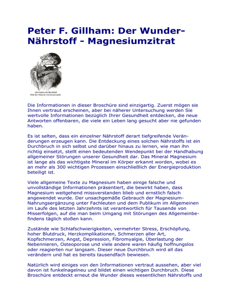 Peter F. Gillham: Der WunderNährstoff - Magnesiumzitrat Die Informationen in dieser Broschüre sind einzigartig. Zuerst mögen sie Ihnen vertraut erscheinen, aber bei näherer Untersuchung werden Sie wertvolle Informationen bezüglich Ihrer Gesundheit entdecken, die neue Antworten offenbaren, die viele ein Leben lang gesucht aber nie gefunden haben. Es ist selten, dass ein einzelner Nährstoff derart tiefgreifende Veränderungen erzeugen kann. Die Entdeckung eines solchen Nährstoffs ist ein Durchbruch in sich selbst und darüber hinaus zu lernen, wie man ihn richtig einsetzt, stellt einen bedeutenden Wendepunkt bei der Handhabung allgemeiner Störungen unserer Gesundheit dar. Das Mineral Magnesium ist lange als das wichtigste Mineral im Körper erkannt worden, wobei es an mehr als 300 wichtigen Prozessen einschließlich der Energieproduktion beteiligt ist. Viele allgemeine Texte zu Magnesium haben einige falsche und unvollständige Informationen präsentiert, die bewirkt haben, dass Magnesium weitgehend missverstanden blieb und ernstlich falsch angewendet wurde. Der unsachgemäße Gebrauch der MagnesiumNahrungsergänzung unter Fachleuten und dem Publikum im Allgemeinen im Laufe des letzten Jahrzehnts ist verantwortlich für Tausende von Misserfolgen, auf die man beim Umgang mit Störungen des Allgemeinbefindens täglich stoßen kann. Zustände wie Schlafschwierigkeiten, vermehrter Stress, Erschöpfung, hoher Blutdruck, Herzkomplikationen, Schmerzen aller Art, Kopfschmerzen, Angst, Depression, Fibromyalgie, Überlastung der Nebennieren, Osteoporose und viele andere waren häufig hoffnungslos oder reagierten nur langsam. Dieser neue Durchbruch wird all das verändern und hat es bereits tausendfach bewiesen. Natürlich wird einiges von den Informationen vertraut aussehen, aber viel davon ist funkelnagelneu und bildet einen wichtigen Durchbruch. Diese Broschüre entdeckt erneut die Wunder dieses wesentlichen Nährstoffs und offenbart, wie man ihn richtig verwendet, um schließlich seine erstaunlichen Eigenschaften zu entschlüsseln. Nachdem Sie diese Daten gelesen haben, werden Sie Ihr eigener Experte darin werden, wie man den Magnesium-Mangel behandelt. Die Daten sind für jedermann absolut lebenswichtig. Sie haben das Leben von vielen verändert. Sie verändern vielleicht auch Ihr Leben. Links: Magnesiumzitrat - 60 Kapseln und Magnesiumzitrat 150 Kapseln Einige Vorab-Bemerkungen zu Magnesium Die Broschüre berichtet über die zahlreichen lebenswichtigen Funktionen des Mineralstoffes Magnesium, der normalerweise nicht Bestandteil des Kunstdüngers ist und daher nur noch mangelhaft in den Böden und in den Nahrungsmitteln enthalten ist. Ein Mangel an Magnesium ist aus diesem Grund sehr weit verbreitet. Und wenn man den Leuten Magnesium gibt, erlebt man daher Wunder. Sie können das – wenn Sie weitere ergänzende Informationen suchen auch auf der Website der "Nutritional Magnesium Association" (http://www.nutritionalmagnesium.org) nachlesen. Magnesium ist Cofaktor von ca. 300 verschiedenen biochemischen Werkzeugen des Körpers. Einer der zahlreichen magnesiumabhängigen biochemischen Vorgänge im Körper ist der "Zusammenbau" von Aminosäuren zu Muskelproteinen. Magnesium ist ein unentbehrlicher Aktivator zahlreicher lebenswichtiger biologischer Prozesse, z.B. aller Reaktionen, an denen ATP beteiligt ist. Magnesium ist für die Aktivierung von etwa 300 Enzymen erforderlich. Nur in Gegenwart von Magnesium funktioniert die vollständige Verstoffwechselung von Eiweißen, Fetten und Kohlehydraten und somit die Energiegewinnung im Körper. Die kontinuierliche Regeneration des Herzmuskels setzt eine ausreichende Magnesiumversorgung voraus. Die "moderne" Ernährung begünstigt den Magnesiummangel. Aus der Tiermedizin ist ein Krankheitsbild bekannt, das an gewisse Ausfallserscheinungen beim Menschen erinnert: die sogenannte Weidetetanie oder "Zitterkrankheit"; die Ursache waren fehlgedüngte und daher magnesiumverarmte Böden. Auch Stress, besonders Lärmstress, führt zu Magnesiumverarmung des Körpers. Bereits 3 bis 4 Tassen Kaffee täglich erhöhen die Magnesiumausscheidung; nach Bosley wird Magnesiummangel vor allem durch den übermäßigen Kaffeegenuss der Menschen unserer Zivilisation hervorgerufen, da Coffein sehr die Ausscheidung von Magnesium wie von Calcium erhöht. Überhöhte Eiweißzufuhr führt zu Magnesium- und Calciumverlusten. Überhöhter Zuckerkonsum führt zu erhöhtem Magnesiumverbrauch. Symptome eines Magnesiummangels: Kardio-vaskulär: Stenokardien, Tachykardien, Extrasystolen, alle Arten von Arrhythmien, erhöhte Thrombosebereitschaft, Durchblutungsstörungen, Kopfschmerz, oft migräneartig, Blutdruckanstieg. Muskulär-tetanisch: Muskelzittern, Muskelschmerzen, Nacken-, Schulter-, Rücken-, Gesichtsmuskelkrämpfe, Taubheit, Kribbeln und Parästhesien der Extremitäten, Waden-, Fußsohlen-, Zehenkrämpfe, Tetanien (Pfötchen-, Geburtshelferstellung). Viszeral: diffuse abdominale Schmerzen, Magen-Darm-Krämpfe, Übelkeit, Erbrechen, Diarrhö, Obstipation, Sphincter-Oddi-, Laryngo, Pyloro-Spasmus, Broncho-, Utero-Spasmus, Eklampsie. Zerebral: Kopfdruck, Schwindel, Nervosität, Reizbarkeit, Unruhe, erhöhte Lärmempfindlichkeit, Lärmphobie, Hyperaktivität, Ein- und Durchschlafstörungen, Angst, Depressionen, nachlassendes Konzentrations- und Erinnerungsvermögen, Verwirrung, Halluzinationen bis zu Paranoia. Magnesium in unterschiedlichen Formen Magnesium wird in unterschiedlichen Formen angeboten. Die bekanntesten und gebräuchlichsten Formen sind Magnesiumoxid, Magnesiumorotat, Magnesiumcarbonat und eben Magnesiumzitrat. Eine vom Körper leicht aufnehmbare Form ist das wasserlösliche Magnesiumzitrat (Magnesiumhydrogencitrat C6H6MgO7·xH2O). Es handelt sich um einen ziemlich sauren Stoff (pH 3,5 bis 4,5), der zudem stark hygroskopisch ist. Wenn man Magnesiumzitrat als Pulver in eine Dose füllt, wird man nach einigen Tagen bemerken, dass das Pulver beginnt, Wasser anzuziehe