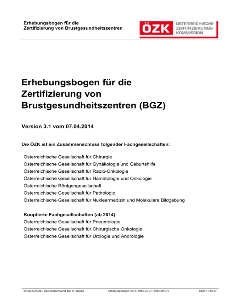 Erhebungsbogen für die Zertifizierung von Brustgesundheitszentren Erhebungsbogen für die Zertifizierung von Brustgesundheitszentren (BGZ) Version 3.1 vom 07.04.2014 Die ÖZK ist ein Zusammenschluss folgender Fachgesellschaften: Österreichische Gesellschaft für Chirurgie Österreichische Gesellschaft für Gynäkologie und Geburtshilfe Österreichische Gesellschaft für Radio-Onkologie Österreichische Gesellschaft für Hämatologie und Onkologie Österreichische Röntgengesellschaft Österreichische Gesellschaft für Pathologie Österreichische Gesellschaft für Nuklearmedizin und Molekulare Bildgebung Kooptierte Fachgesellschaften (ab 2014): Österreichische Gesellschaft für Pneumologie Österreichische Gesellschaft für Chirurgische Onkologie Österreichische Gesellschaft für Urologie und Andrologie © Doc-Cert AG, Speicherschwendi bei St. Gallen Erhebungsbogen V3.1, 2014-04-07 (2014-09-07) Seite 1 von 37 Erhebungsbogen für die Zertifizierung von Brustgesundheitszentren Angaben des Zentrums Name des Brustgesundheitszentrums Straße Ort Name des Ansprechpartners Telefon Fax e-mail Brustgesundheitszentrum Affiliierter Partner © Doc-Cert AG, Speicherschwendi bei St. Gallen Name des BGZ, an das affiliiert werden soll Erhebungsbogen V3.1, 2014-04-07 (2014-09-07) Seite 2 von 37 Erhebungsbogen für die Zertifizierung von Brustgesundheitszentren Kooperationsstruktur des Zentrums Hier werden vom Zentrum folgende Disziplinen / Kooperationspartner aufgeführt: Operative Therapie Medikamentöse Tumortherapie Radioonkologie Radiologische Diagnostik Nuklearmedizin Pathologie Rekonstruktive / Plastische Chirurgie Psychoonkologie Sozialberatung Breast Care Nurse Physiotherapie Datenmanagement Genetische Beratung Manche Disziplinen / Tätigkeitsbereiche können auch durch mehrere Abteilungen oder Kliniken wahrgenommen werden, in diesem Fall wird die Disziplin/der Tätigkeitsbereich entsprechend mehrfach aufgeführt. Kooperationspartner im Zentrum kann nur diejenige Abteilung / Klinik sein, die einen relevanten Anteil der Patientinnen des Zentrums behandelt. Disziplin Abteilung / Klinik Ansprechpartner Operative Therapie Medikamentöse Tumortherapie Radioonkologie Radiologische Diagnostik Nuklearmedizin Pathologie Rekonstruktive Chirurgie Psychoonkologie Sozialberatung Breast Care Nurse Physiotherapie Datenmanagement Genetische Beratung © Doc-Cert AG, Speicherschwendi bei St. Gallen Erhebungsbogen V3.1, 2014-04-07 (2014-09-07) Seite 3 von 37 Erhebungsbogen für die Zertifizierung von Brustgesundheitszentren Allgemeine Angaben zur Struktur eines Brustgesundheitszentrums Ein Brustgesundheitszentrum kann entweder als Einzelstandort zertifiziert sein, aber auch als Verbund mit bis zu vier sogenannten affiliierten Partnern. Ein affiliierter Partner ist kein eigenständiges Brustzentrum, sondern kann nur in Verbindung mit dem „großen Partner“ zertifiziert werden. Die Zahl der Patienten in allen affiliierten Zentren darf die Zahl der Patienten im Brustgesundheitszentrum dabei nicht übersteigen. Eigenständiges Brustgesundheitszentrum – Einzelstandort Chirurgie/ Gynäkologie Pathologie Das Brustgesundheitszentrum muss alle Kernleistungsdisziplinen vorhalten. Radiologie BGZ > 100 Fälle Internistische Onkologie Radioonkologie Brustgesundheitszentrum mit zwei affiliierten Partnern (Beispiel). Chirurgie/ Gynäkologie Der affiliierte Partner muss mindestens über die Disziplinen „Operative Therapie“ und „Diagnostik“ verfügen, kann aber auch weitere Disziplinen vorhalten. Radiologie Pathologie BGZ > 100 Fälle Int. Onkologie Chirurgie/ Gynäkologie Radioonkologie Chirurgie/ Gynäkologie Radiologie AP > 50 Fälle Radiologie AP > 50 Fälle Radioonkologie © Doc-Cert AG, Speicherschwendi bei St. Gallen Erhebungsbogen V3.1, 2014-04-07 (2014-09-07) Diese Konstrukte müssen die Versorgungsrealität abbilden, d.h. die Kooperationspartner müssen einen relevanten Anteil der Patientinnen des Zentrums tatsächlich diagnostizieren, bzw. behandeln. Seite 4 von 37 Erhebungsbogen für die Zertifizierung von Brustgesundheitszentren Brustgesundheitszentren sind interdisziplinäre Einheiten für Diagnostik, Therapie und Erforschung von Brustkrebserkrankungen. Sie entstehen durch Vernetzung und Kooperation mehrerer Fachabteilungen der verschiedenen medizinischen Fachdisziplinen. Diese stellen die jeweilige Expertise sowie die erforderlichen infrastrukturellen und personellen Ressourcen aus ihrer Fachabteilung zur Verfügung. Durch Vereinbarung aller beteiligten Abteilungen / Institute werden unter Berücksichtigung der lokalen Gegebenheiten die organisatorischen Abläufe, die jeweiligen fachspezifischen Inhalte sowie die Verantwortlichkeiten der gemeinsamen Aktivitäten innerhalb des Brustgesundheitszentrums geregelt. Das interdisziplinäre Netzwerk umfasst jedenfalls Abteilungen der operativen, internistischen und Radiotherapeutischen Onkologie sowie von Pathologie, Radiologie, Nuklearmedizin, Psycho-Onkologie, Physiotherapie, plastisch-rekonstruktiver Chirurgie, Sozialarbeit, Seelsorge sowie Datenmanagement. Den Antrag auf Zertifizierung kann nur der Spitalerhalter bzw. die autorisierte Vertretung des Spitalerhalters bei der Österreichischen Zertifizierungskommission stellen. Bedeutung des Tumorboards Das Tumorboard ist das Kernstück des Brustgesundheitszentrums. Alle Kernleistungserbringer nehmen darum am Tumorboard teil. Auch die affiliierten Partner stellen ihre Patientinnen im gemeinsamen Tumorboard vor. So wird der Qualitätsanspruch des Brustgesundheitszentrums für alle seine Patientinnen umgesetzt. Bedeutung der Datenerfassung und des Jahresberichtes Behandlungsqualität ist ein Anspruch, der vom Brustgesundheitszentrum nachgewiesen werden muss. Durch Benchmarking mit anderen Zentren gewinnt das Zentrum weitere Möglichkeiten zur Verbesserung. Aus diesem Grund werden alle Patientinnen eines Brustgesundheitszentrums in einer Datenbank (Qualitätssicherung) dokumentiert. Der vom Zentrum jährlich zu