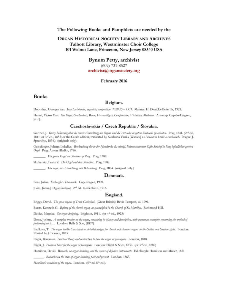 The Following Books and Pamphlets are needed by the ORGAN HISTORICAL SOCIETY LIBRARY AND ARCHIVES Talbott Library, Westminster Choir College 101 Walnut Lane, Princeton, New Jersey 08540 USA Bynum Petty, archivist (609) 731-8527 [email protected] February 2016 Books Belgium. Doorslaer, Georges van. Jean Lestainnier, organiste, compositeur, 1520 (?) – 1551. Malines: H. Dierickx-Beke fils, 1921. Hemel, Victor Van. Het Orgel, Geschiedenis, Bouw, Vervaardigers, Componisten, Virtuozen, Methodes. Antwerp: Cupido-Uitgave, [n.d.]. Czechoslovakia / Czech Republic / Slovakia. Gartner, J. Kurze Belehrung über die innere Einrichtung der Orgeln und die Art selbe in gutem Zustande zu erhalten. Prag, 1841. (2nd ed., 1841, or 3rd ed., 1855; or the Czech edition, translated by Norberta Vaňka [Waniek] as Panaučení kráké o vanhanách. Prague: J. Spruného, 1834.) (originals only). Oelschleger, Johann Lohelius. Beschreibung der in der Pfarrkirche des königl. Prämonstratenser Stifts Strahof in Prag befindlichen grossen Orgel. Prag: Anton Hladky, 1786. _______. Die grosse Orgel am Strahow zu Prag. Prag, 1788. Skuhersky, Franz Z. Die Orgel und ihre Struktur. Prag, 1882. _______. Die orgel, ihre Einrichtung und Behandlung. Prag, 1884. (original only.) Denmark. Foss, Julius. Kirkorglar i Danmark. Copenhagen, 1909. [Foss, Julius.] Organistenbogen. 2nd ed. København, 1916. England. Briggs, David. The great organs of Truro Cathedral. [Great Britain]: Bevic Tempest, ca. 1991. Burns, Kenneth G. Reform of the church organ, as exemplified in the Church of St. Matthias. Richmond Hill. Davies, Maurice. On organ designing. Brighton, 1911. (or 4th ed., 1923) Done, Joshua. A complete treatise on the organ, containing its history and description, with numerous examples concerning the method of performing on it…. London: Bells & Son, [1837]. Faulkner, T. The organ builder’s assistant or, detailed designs for church and chamber organs in the Gothic and Grecian styles. London: Printed by J. Boosey, 1823. Flight, Benjamin. Practical theory and instruction to tune the organ or pianoforte. London, 1818. Flight, J. Practical tuner for the organ or pianoforte. London: Flight & Sons, 1830. (or 3rd ed., 1880) Hamilton, David. Remarks on organ-building, and the causes of defective instruments. Edinburgh: Hamilton and Müller, 1851. ______. Remarks on the state of organ-building, past and present. London, 1863. Hamilton’s catechism of the organ. London. (5th ed, 8th ed.). Harris, F. The organ, its history, construction and use. London, 1916. Harvey, Sidney W. Short history of the organs of Canterbury Cathedral. London: [The Author], 1916. Hayne, L.G. Hints on the purchase of an organ. London: Novello, Ewer and Co., 1867. Hinton, John William. Facts about organs; guide to the purchase of an organ…2nd ed., rev. and enl. London: W. Reeves, [1882]. _______. We want a new organ. What is to be done, and what is not to be done? London, 1907. Ibbotson, Edmund. Suggestions to those about to order an organ. Walthamstow, 1883. Joule, Benjamin St. John Baptist. Description of the grand organ in St. Peter’s Church, Manchester. Manchester, 1863. (or 6th ed., 1872). Keehler, R. Church organs. [n.p.], 1895. Monk, Edwin G. Descriptive account of the York Minster organs. York, 1863. Morgan, Ralph Thompson. A short account of the organs of St. Mary Redcliffe, Bristol. Bristol: Came & Cave, 1912. Morten, A. Hints on the purchase of an organ. London, 1877. Nicholson, Henry D. The organ, its mechanism, stops, etc., explained. London: Metzler & Co., 1865. Nicholson, Sidney H. Carlisle Cathedral: its organs and organists. 1907. ______. Manchester Cathedral: an account of the organs and organists. 1910. Purey-Cust, A.P. Organs and organists of York Minster. York: J. Sampson, 1899. Richards, C. S. History of the organ in Wotton under Edge Parish Church. [n.p.], 1912. Shepherdson, William. A descriptive account of the great organ built by Herr Schulze, for the Parish Church, Doncaster. London: Novello & Co., [1862]. Smart, Henry. Report on the organ of Christ Church Cathedral. Dublin, 1878. Warman, John W. The hydraulic organ of the ancients. London, 1904. Wedgewood, James Ingall. The evolution and development of the organ. York, 1903. _______. Tonal design in modern organ building. London, 1904. Willis, R. On the vowel sounds and on reed organ pipes. From the translations of the Cambidge Philosophical Society [with a photo]. Cambridge: J. Smith, 1829. Wilson, Archibald Wayet. Ely Cathedral: the organs and organists. Ely: G. H. Tyndall, 1908. France. Bertrand, Jean G. Histoire ecclésiastique de l’orgue. Paris, 1859. Beulé. Rapport à l’academie des Beaux-Arts sur le grand orgue de Saint-Sulpice, reconstruit par M.A. Cavaillé-Coll et Cie à Paris. Paris, 1863. Boisonnot, Ch. H. Le grand orgue de la Cathédrale de Tours. Tours, 1912. Boyer. Réception de l’orgue de Notre-Dame de Saint-Calais. Le Mans, 1846. ______. Notice sur les orgues existant dans les Églises du Mans avant 1789. Le Mans, 1853. Brosset, Jules. L’orgue et la maitrise de St. Aignan-du-Cher. 1900. _______. L’orgue de l’abbaye de Bourg-Moyen de Blois. Blois, 1905. _______. Les orgues du Royal Monastère de Saint-Laumer, aujourd’hui église paroissiale St. Nicolas à Blois. Blois, 1906. _______. La musique et l’orgue à St. Sauveur de Blois. Blois, 1907. _______. L’orgue et les organistes de l’église St. Paul d’Orléans. Orléans, 1909. Carlez, J. Le grand orgue de St. Pierre de Caen. Paris, 1881. ______. Orgues et organistes caennais. Caen, 1897. Cauna, Baron de. Orgues des Basses Pyrenées. Bordeaux, 1874. Clément, Félix. Sur les origines de l’orgue. Société de St. Jean, 1878. 2 Cuvillier, J. Facture d’orgues. 1852. Dangibeaud, Ch. Les orgues de St. Pierre de Saintes. 1885. Danjou, J.L.F. Manufacture d’orgues. Paris, 1844. Delbez, Em. L’orgue de l’église St. Crépin de Chateau-Thierry. Chateau Thierry, 1922. Dieuaide, J. M. Le grand orgue