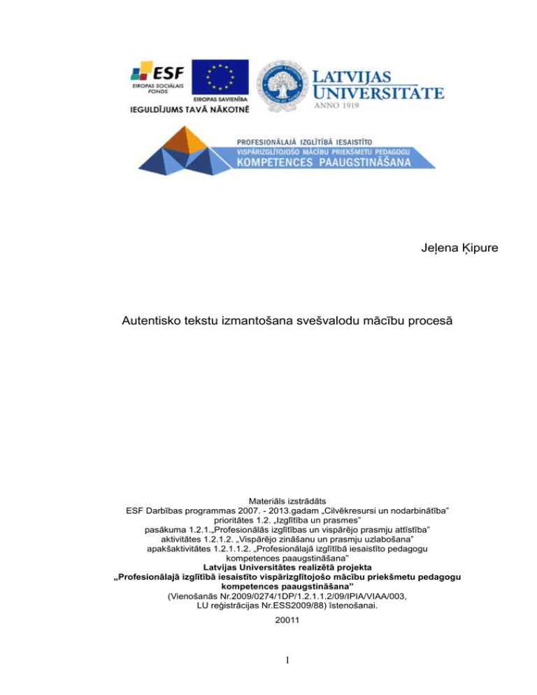 Jeļena Ķipure Autentisko tekstu izmantošana svešvalodu mācību procesā Materiāls izstrādāts ESF Darbības programmas 2007. - 2013.gadam „Cilvēkresursi un nodarbinātība” prioritātes 1.2. „Izglītība un prasmes” pasākuma 1.2.1.„Profesionālās izglītības un vispārējo prasmju attīstība” aktivitātes 1.2.1.2. „Vispārējo zināšanu un prasmju uzlabošana” apakšaktivitātes 1.2.1.1.2. „Profesionālajā izglītībā iesaistīto pedagogu kompetences paaugstināšana” Latvijas Universitātes realizētā projekta „Profesionālajā izglītībā iesaistīto vispārizglītojošo mācību priekšmetu pedagogu kompetences paaugstināšana” (Vienošanās Nr.2009/0274/1DP/1.2.1.1.2/09/IPIA/VIAA/003, LU reģistrācijas Nr.ESS2009/88) īstenošanai. 20011 1 ESF projekts „Profesionālajā izglītībā iesaistīto vispārizglītojošo mācību priekšmetu pedagogu kompetences paaugstināšana” Vienošanās Nr.2009/0274/1DP/1.2.1.1.2/09/IPIA/VIAA/003 Jeļena Ķipure IM/V/1 Einsatz der authentischen Texte im Fremdsprachenunterricht Die Rolle des Lesens im Fremdsprachenunterricht Immer häufiger wird der Fremdsprachenunterricht aufgrund des schriftlich fixierten fremdsprachigen Materials, d.h. eines fremdsprachigen Textes, organisiert, und die Fähigkeit, in einer Fremdsprache zu lesen, hat eine große Bedeutung, denn das Lesen ist ein aktiver Prozess, anhand dessen die Information aus der geschriebenen Sprache, d.h. einem Text, erworben wird. Das Ziel des Lesens und der weiteren Textarbeit im Fremdsprachenunterricht ist Erwerb, Verarbeitung und Anwendung der herausgezogenen Information. Die Qualität des Leseprozesses wird durch das Verständnis kontrolliert, das durch die Menge der herausgezogenen Information und das Niveau ihrer vollen Wiederholung charakterisiert wird. Das Lesen als Prozess und weitere Textarbeit erfüllen im Fremdsprachenunterricht mehrere Funktionen, die eine Fremdsprache lernen und die Kenntnisse darüber entwickeln helfen, und zwar: - Entwicklung und Vergrößerung des Wortschatzes; - Vermittlung von sprachlichen Mustern; - Üben des Sprachmaterials; - Grammatikschulung; - Entwicklung der Lesefertigkeit bzw. des Leseverstehens; - Impuls zur Kommunikation im Fremdsprachenunterricht; Entwicklung der Kommunikationsfähigkeit; - Vermittlung von Informationen verschiedener Art (landeskundliche, soziokulturelle, fachspezifische u.Ä.); - Entwicklung des Wissenshorizonts; - Kombiniertes/integratives Üben aller Sprachfertigkeiten; - Unterhaltung; Wecken des Interesses und der Motivation der Lernenden. Jedes im Fremdsprachenunterricht zu lesende fremdsprachige Material enthält ein Pensum vom unbekannten Stoff, in diesem Fall wäre es eine Menge von neuer Lexik, die während des Unterrichts durchgearbeitet und von Lernenden eingeprägt wird, wodurch die Lernenden auf eine höhere Ebene der Sprachbeherrschung gestellt werden; 2 IM/V/1 der fremdsprachige Lesestoff bietet eine bestimmte Menge vom grammatischen, lexikalischen, linguistischen Material an, dessen richtige Einführung im Text sowie entsprechende Organisation des Lesens zur Festigung dieses Sprachmaterials beitragen; jeder Lesestoff im Fremdsprachenunterricht tritt als die Grundlage und der Anstoß zu mündlichen Aktivitäten auf. Die Übungen, die das vermitteln (z.B. Fragen-Antworten, Erzählen, Meinungsäußerung) führen zur Entwicklung der gesprochenen Sprache. Das Lesen enthält die Wechselwirkung zwischen dem Denken und der Sprache. Der Lernende wendet eine Menge von Information, Ideen und Ansichten an, wenn er verschiedene Übungen macht; das Lesen selbst ist eine spezielle Technik. Sie beginnt mit den elementaren Prozessen der Entschlüsselung der Wortzeichen und sie endet mit den Methoden der Verarbeitung, der Speicherung und der Wiedergabe/Anwendung des Gelesenen. Die planmäßige Textarbeit im Fremdsprachenunterricht hilft den Lernenden, den Textinhalt zu verstehen und zu assimilieren, z.B. einen Text nach dem ersten Durchsehen zu verstehen, die notwendige Information abzusondern, die Bedeutung eines neuen und unbekannten Wortes aus dem Kontext zu erraten. Das Ziel der Textarbeit im Fremdsprachenunterricht ist, dazu beizutragen, dass die Lernenden einen unbekannten fremdsprachigen Lesestoff ohne Hilfe und mit passender Geschwindigkeit und entsprechendem Verständnis lesen, daraus für sie nötige nicht nur inhaltliche, sondern auch sprachliche Information herausfinden und sie weiter anwenden; das Lesen ist ein komplexer Prozess, der den Umgang mit fremdsprachigen Texten aufgrund der traditionellen methodischen Einteilung des Sprachkönnens in die vier Fertigkeiten, d.h. Hören, Sprechen, Lesen und Schreiben voraussetzt. Die Anwendung aller vier Fertigkeiten, ihre variationsreiche Kombinierung und gegenseitige Zusammenwirkung können durch den geeignenten Lesestoff und entsprechende Aufgabenstellung und Übungsformen realisiert werden. Die Textarbeit im Fremdsprachenunterricht In den gegenwärtigen textdidaktischen Theorien lässt sich die doppelte Auslegung des Begriffs „Textarbeit“ unterscheiden: 1. dieser Begriff wird überwiegend im engeren Sinne gebraucht und als das auf die Rezeption bzw. (Lese-)Verstehen zielende Verfahren interpretiert, das von einigen Textdidaktikern dem 3 IM/V/1 Bereich der Arbeit mit komplexeren, längeren Texten insbesondere im Fremdsprachenunterricht zugezählt wird (Solmecke, 1993; Westhoff, 1987; Löschmann, 1985; Rampillon, 1996; Doye´, 1992); 2. das weitere Verständnis der Textarbeit umreißt nicht nur die unmittelbar während des Lesens stattfindende Sinnentnahme, sondern „jede intensive mündliche oder schriftliche Beschäftigung mit Texten, ihren Inhalten und dem darin enthaltenen Sprachmaterial“ (Jung, 1998, S. 228). Dieser Ansatz stimmt mit Piephos (1990) „Arbeit an, mit und nach Texten“ (Piepho, 1990, S. 4) überein und schließt das Textverstehen an sich ebenso wie das weitere eigene Textproduktion mit ein. Dem gleichen