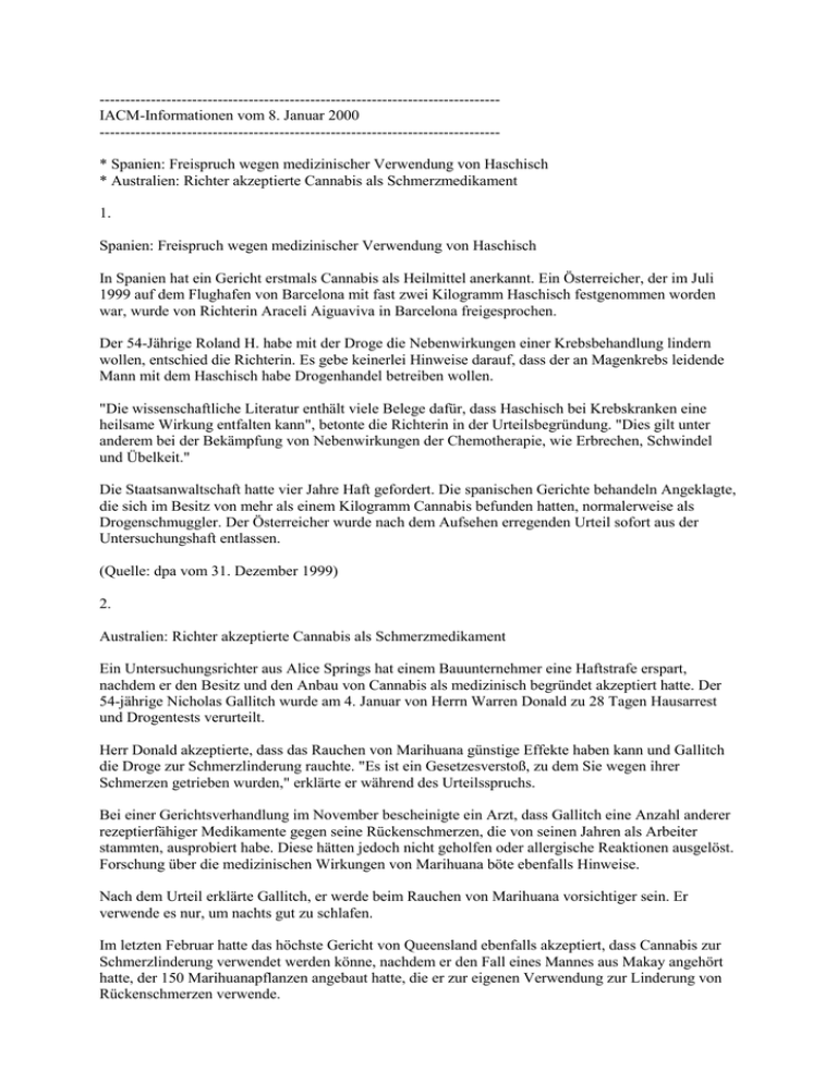 -----------------------------------------------------------------------------IACM-Informationen vom 8. Januar 2000 -----------------------------------------------------------------------------* Spanien: Freispruch wegen medizinischer Verwendung von Haschisch * Australien: Richter akzeptierte Cannabis als Schmerzmedikament 1. Spanien: Freispruch wegen medizinischer Verwendung von Haschisch In Spanien hat ein Gericht erstmals Cannabis als Heilmittel anerkannt. Ein Österreicher, der im Juli 1999 auf dem Flughafen von Barcelona mit fast zwei Kilogramm Haschisch festgenommen worden war, wurde von Richterin Araceli Aiguaviva in Barcelona freigesprochen. Der 54-Jährige Roland H. habe mit der Droge die Nebenwirkungen einer Krebsbehandlung lindern wollen, entschied die Richterin. Es gebe keinerlei Hinweise darauf, dass der an Magenkrebs leidende Mann mit dem Haschisch habe Drogenhandel betreiben wollen. "Die wissenschaftliche Literatur enthält viele Belege dafür, dass Haschisch bei Krebskranken eine heilsame Wirkung entfalten kann", betonte die Richterin in der Urteilsbegründung. "Dies gilt unter anderem bei der Bekämpfung von Nebenwirkungen der Chemotherapie, wie Erbrechen, Schwindel und Übelkeit." Die Staatsanwaltschaft hatte vier Jahre Haft gefordert. Die spanischen Gerichte behandeln Angeklagte, die sich im Besitz von mehr als einem Kilogramm Cannabis befunden hatten, normalerweise als Drogenschmuggler. Der Österreicher wurde nach dem Aufsehen erregenden Urteil sofort aus der Untersuchungshaft entlassen. (Quelle: dpa vom 31. Dezember 1999) 2. Australien: Richter akzeptierte Cannabis als Schmerzmedikament Ein Untersuchungsrichter aus Alice Springs hat einem Bauunternehmer eine Haftstrafe erspart, nachdem er den Besitz und den Anbau von Cannabis als medizinisch begründet akzeptiert hatte. Der 54-jährige Nicholas Gallitch wurde am 4. Januar von Herrn Warren Donald zu 28 Tagen Hausarrest und Drogentests verurteilt. Herr Donald akzeptierte, dass das Rauchen von Marihuana günstige Effekte haben kann und Gallitch die Droge zur Schmerzlinderung rauchte. "Es ist ein Gesetzesverstoß, zu dem Sie wegen ihrer Schmerzen getrieben wurden," erklärte er während des Urteilsspruchs. Bei einer Gerichtsverhandlung im November bescheinigte ein Arzt, dass Gallitch eine Anzahl anderer rezeptierfähiger Medikamente gegen seine Rückenschmerzen, die von seinen Jahren als Arbeiter stammten, ausprobiert habe. Diese hätten jedoch nicht geholfen oder allergische Reaktionen ausgelöst. Forschung über die medizinischen Wirkungen von Marihuana böte ebenfalls Hinweise. Nach dem Urteil erklärte Gallitch, er werde beim Rauchen von Marihuana vorsichtiger sein. Er verwende es nur, um nachts gut zu schlafen. Im letzten Februar hatte das höchste Gericht von Queensland ebenfalls akzeptiert, dass Cannabis zur Schmerzlinderung verwendet werden könne, nachdem er den Fall eines Mannes aus Makay angehört hatte, der 150 Marihuanapflanzen angebaut hatte, die er zur eigenen Verwendung zur Linderung von Rückenschmerzen verwende. (Quelle: Sydney Morning Herald vom 5. Januar 2000) 3. Kurzmeldungen ***Schweiz: Ein Beratungsgremium der Regierung erklärte am 5. Januar, es favorisiere die Entkriminalisierung des Drogenkonsums, und bezeichnete dies als "pragmatischen Ansatz". Die Eidgenössische Kommission für Jugendfragen argumentierte, das gültige Gesetz kriminalisiere vor allem Jugendliche und einfache Konsumenten, und nicht die Dealer weicher und harter Drogen. Die Kommission erklärte, sie unterstütze das holländische Modell. Der Bundesrat führt zur Zeit Konsultationen zur Revision des Betäubungsmittelgesetzes durch. Es wird später in der zweiten Jahreshälfte mit Empfehlungen an die eidgenössischen Räte gerechnet. Auch die politischen Parteien haben sich an den Konsultationen beteiligt. Zwei der Vier-Parteien-Koalition unterstützen die Entkriminalisierung, eine favorisiert die Entkriminalisierung von Cannabis allein, während die andere keine Gesetzesänderung will. (Quellen: AP vom 5. Januar 2000, Basler Zeitung vom 6. Januar 2000) ***USA: Darrell E. Putman, ehemaliger Angehöriger der Green Berets und konservativer Republikaner, der sich zu einem Verfechter der medizinischen Anwendung von Marihuana wandelte, starb am 29. Dezember an einem Non-Hodgkin-Lymphom. In den letzten Monaten seines Lebens wurde Herr Putman zum Unterstützer der Legalisierung von Marihuana für medizinische Zwecke. Er rauchte die Droge, um seinen Appetit wiederzuerlangen und um in Vorbereitung auf die Krebsbehandlung zuzunehmen. (Quelle: Baltimore Sun vom 30. Dezember 1999) 4. DAS ZITAT: "Wenn ich ein Vermächtnis hinterlasse, dann dass versucht wird, Marihuana anderen Patienten zugänglich zu machen." Darrell E. Putman, der am 29. Dezember an Krebs starb, Baltimore Sun vom 30. Dezember 1999. 5. VOR EINEM JAHR - Erste legale Ernte von Marihuana für die medizinische Verwendung in Großbritannien - Forschung zu den blutdrucksenkenden Eigenschaften von Endocannabinoiden durch britische Herzstiftung unterstützt VOR ZWEI JAHREN - Editorial zu Cannabis als Medizin in der Fachzeitschrift Lancet -----------------------------------------------------------------------------IACM-Informationen vom 22. Januar 2000 -----------------------------------------------------------------------------* USA: Entwicklung eines Cannabinoid-Pflasters durch Krebsgesellschaft gefördert * Malta: Krebspatient wurde Haftstrafe wegen Cannabisanbau erspart 1. USA: Entwicklung eines Cannabinoid-Pflasters durch Krebsgesellschaft gefördert Audra Stinchcomb vom Albany College für Pharmazie erhielt am 21. Januar von der Amerikanischen Krebsgesellschaft eine dreijährige Forschungsförderung in Höhe von 361,000 US-Dollar (ca. 700.000 DM). Sie wird untersuchen, ob Cannabinoide erfolgreich durch die Haut aufgenommen werden können. Diese Forschung könnte zur Entwicklung eines Cannabinoid-Pflasters zur therapeutischen Verwendung führen. Es könnte Schmerzen, Übelkeit un