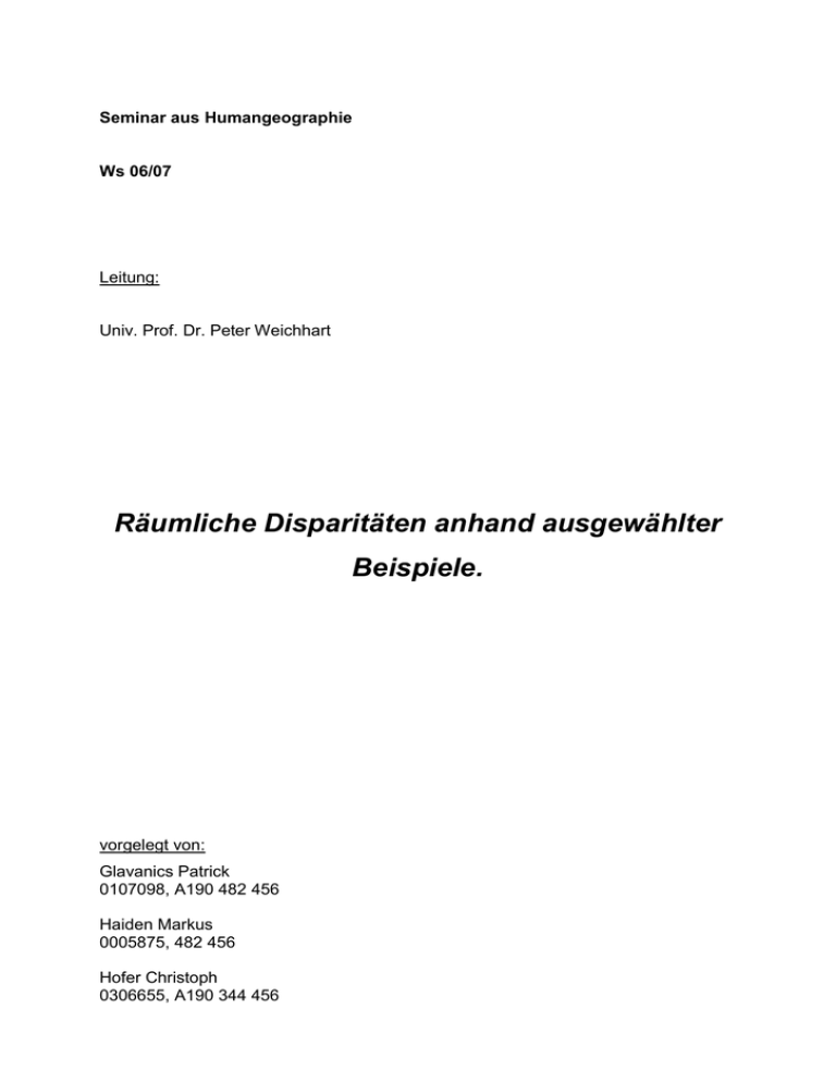 Seminar aus Humangeographie Ws 06/07 Leitung: Univ. Prof. Dr. Peter Weichhart Räumliche Disparitäten anhand ausgewählter Beispiele. vorgelegt von: Glavanics Patrick 0107098, A190 482 456 Haiden Markus 0005875, 482 456 Hofer Christoph 0306655, A190 344 456 Seminar Humangeographie Inhaltsverzeichnis Vorwort 4 Teil 1 Haiden Markus 1. Begrifflichkeit 5 1.1 Regionale Disparität 6 1.2 Was ist eine Region? 7 2. Theorien der räumlichen Entwicklung 9 2.1 Konvergenzansätze – die neoklassische regional 2.2 Wachstumstheorie 9 Divergenzansätze 10 2.2.1 Polarisationstheorien oder Divergenztheorien 11 2.2.2 Wachstumspolkonzept von LASUEN 12 2.2.3 Zentrum–Peripherie–Modell 13 2.2.4 Modell globaler Fragmentierung 15 2.2.5 Theorie der Langen Wellen 17 2.2.6 Regionale Produktzykustheorie 18 2.2.7 Regulationstheorie 20 2.2.8 Netzwerke und Innovative Milieus 21 3. Kritik an der Regulationstheorie 22 3.1 Schwachstellen und konzeptionelle Defizite der Regulationstheorie 22 4. Indikatoren zur Messung regionaler Disparitäten 23 4.1 Thematische Einführung 23 4.2 Methodische Einführung 24 4.3 Kriterien für die Auswahl und Bildung von Indikatoren 25 Seite 2 von 110 Seminar Humangeographie Teil 2 Hofer Christoph 5. Regionale Disparitäten in Europa 5.1 Die Messung bzw. die Erfassung von Armutserscheinungen in der EU 5.1.1 Das Dateninstrumentarium (ECHP, EU-SILC) 27 29 31 5.1.2 Methodik - Indikatoren, Variablen und multidimensionale Aspekte 5.1.3 Definitions- und Messschwierigkeiten 5.2 35 39 Der Integrationsprozess und regionale Entwicklungen in Europa 40 5.2.1 Entwicklung regionaler Disparitäten (seit 1960 bis zum Ende der 1990er Jahre) 46 5.2.2 Ost-Europa und die EU-Erweiterung 53 5.3 56 EU-Länder im Vergleich 5.3.1 Das BIP je Einwohner 57 5.3.2 Das Einkommensgefälle 62 5.3.2.1 Stadt-Land-Gefälle 64 5.3.3 Divergierende Ausprägung der Arbeitslosigkeit 66 5.3.3.1Bildung in der EU 71 5.3.4 Lebensverhältnisse – Armut und Materielle Deprivation 74 5.4 78 Herausforderungen an den Sozialstaat 5.4.1 Die EU-Regional- und Stukturpolitik 81 Seite 3 von 110 Seminar Humangeographie Teil 3 Glavanics Patrick 6. Räumliche Disparitäten auf nationaler Ebene 88 6.1 Verdienstunterschiede zwischen den Bundesländern 88 6.1.1 Statistische Analyse von Administrativdaten 89 7. Sozialräumlichen Differenzierung auf Bezirksebene 92 7.1 Sozialraumanalyse anhand der Stadt Wien 92 7.1.1 Der soziale Faktor 95 7.1.2 Der ethnische Faktor 100 7.1.3 Der demographische Faktor 102 8. 105 Literaturverzeichnis Seite 4 von 110 Seminar Humangeographie Vorwort Historisch bedingte Gegebenheiten, die Lage und Distanz zu Arbeits-, Produktionsund Absatzmärkten, aber auch ungleiche quantitative und qualitative Ausstattungen mit Produktionsfaktoren können Ursache dafür sein, warum manche Regionen als arm und rückständig, andere wiederum als reich und prosperierend einzustufen sind. Da die Geographie eines Landes mit den vorhandenen Unterschieden nicht völlig auslöschbar ist, können arme und reiche Regionen, auch durch massive politische Interventionen, niemals restlos beseitigt werden. Tatsache ist, dass regionale Disparitäten den inneren Zusammenhalt einer Region gefährden. Im dritten Teil der Arbeit werden nach Analysen auf internationaler und interregionaler Maßstabsebene, sozialräumliche Differenzierungen auf Bundesländer- und Bezirksebene interpretiert. Räumliche Disparitäten auf nationaler Ebene wie zum Beispiel die Verdienstunterschiede zwischen den Bundesländern und Differenzierungen auf regionaler Ebene, Unterschiede zwischen den Bezirken der Stadt Wien sind die Problemstellungen, die darin ihre Lösung finden. Wie groß sind die regionalen Unterschiede innerhalb einer ausgewählten Region? Sind diese Unterschiede gesellschaftlich noch akzeptabel, oder vergrößern sich die Disparitäten? Im Verlauf dieser Arbeit soll daher der Versuch unternommen werden, auf diese Fragen eine mögliche Antwort zu finden. Seite 5 von 110 Seminar Humangeographie 1. Begrifflichkeit Die Wortkombination „Regionale Disparität“ lässt sich in zwei zentrale Begriffe – „Disparität“ und „Region“ – trennen. Es handelt sich dabei um gängige Terminologien, die trotz differenzierter Zugänge meist ganz selbstverständlich verwendet werden. Wahrscheinlich liegt es gerade daran, dass eine umfassende Definition, weder den Begriff „Disparität“ noch jenen der „Region“ betreffend, nicht möglich ist. 1.1 Regionale Disparität Im Handbuch der Raumordnung ist folgende Definition zu regionalen Disparitäten nachzulesen: „Unter regionalen Disparitäten werden Abweichungen von einer gedachten, je nach Fragestellung auf unterschiedliche räumliche Maßstabsebenen (Regionsabgrenzung) bezogenen Referenzverteilung von als relevant erachteten Merkmalen verstanden.“ (vgl. Arl 1995, S. 185). Im Gegensatz zu dieser genannten allgemeinen Definition, wird der Terminus „regionale Disparität“ im Diercke Wörterbuch der Allgemeinen Geographie (2001) folgendermaßen definiert: „Unausgeglichenheit der Raumstrukturen in einer bzw. in verschiedenen Regionen. Regionale Disparitäten äußern sich in unterschiedlichen Lebensbedingungen sowie in ungleichen wirtschaftlichen Entwicklungsmöglichkeiten. Der Stadt-Land-Gegensatz kann als eine Form der räumlichen Disparität aufgefasst werden.“ Die zweite Definition wird schon etwas genauer spezifiziert, eröffnet aber zugleich wieder eine neue Liste an erklärungsbedürftigen Begriffen. Erklärungsbedarf besteht unter anderem in Bezug auf den Begriff „Region“ und „unterschiedliche Lebensbedingungen“. Seite 6 von 110 Seminar Humangeographie Bei der Bewertung von Lebensbedingungen spielt immer auch eine subjektive Komponente eine erhebliche Rolle. Sind für den einen Bildungs- und Ausbildungschancen, vielfältige Arbeits- und Verdienstmöglichkeiten und dergleichen entscheidend, haben für den anderen möglicherweise ganz andere Faktoren Priorität, wie etwa günstigere Wohnv