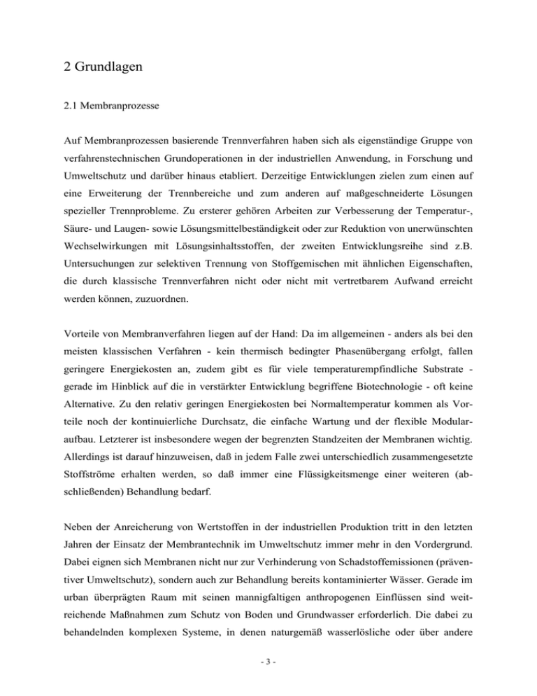 2 Grundlagen 2.1 Membranprozesse Auf Membranprozessen basierende Trennverfahren haben sich als eigenständige Gruppe von verfahrenstechnischen Grundoperationen in der industriellen Anwendung, in Forschung und Umweltschutz und darüber hinaus etabliert. Derzeitige Entwicklungen zielen zum einen auf eine Erweiterung der Trennbereiche und zum anderen auf maßgeschneiderte Lösungen spezieller Trennprobleme. Zu ersterer gehören Arbeiten zur Verbesserung der Temperatur-, Säure- und Laugen- sowie Lösungsmittelbeständigkeit oder zur Reduktion von unerwünschten Wechselwirkungen mit Lösungsinhaltsstoffen, der zweiten Entwicklungsreihe sind z.B. Untersuchungen zur selektiven Trennung von Stoffgemischen mit ähnlichen Eigenschaften, die durch klassische Trennverfahren nicht oder nicht mit vertretbarem Aufwand erreicht werden können, zuzuordnen. Vorteile von Membranverfahren liegen auf der Hand: Da im allgemeinen - anders als bei den meisten klassischen Verfahren - kein thermisch bedingter Phasenübergang erfolgt, fallen geringere Energiekosten an, zudem gibt es für viele temperaturempfindliche Substrate gerade im Hinblick auf die in verstärkter Entwicklung begriffene Biotechnologie - oft keine Alternative. Zu den relativ geringen Energiekosten bei Normaltemperatur kommen als Vorteile noch der kontinuierliche Durchsatz, die einfache Wartung und der flexible Modularaufbau. Letzterer ist insbesondere wegen der begrenzten Standzeiten der Membranen wichtig. Allerdings ist darauf hinzuweisen, daß in jedem Falle zwei unterschiedlich zusammengesetzte Stoffströme erhalten werden, so daß immer eine Flüssigkeitsmenge einer weiteren (abschließenden) Behandlung bedarf. Neben der Anreicherung von Wertstoffen in der industriellen Produktion tritt in den letzten Jahren der Einsatz der Membrantechnik im Umweltschutz immer mehr in den Vordergrund. Dabei eignen sich Membranen nicht nur zur Verhinderung von Schadstoffemissionen (präventiver Umweltschutz), sondern auch zur Behandlung bereits kontaminierter Wässer. Gerade im urban überprägten Raum mit seinen mannigfaltigen anthropogenen Einflüssen sind weitreichende Maßnahmen zum Schutz von Boden und Grundwasser erforderlich. Die dabei zu behandelnden komplexen Systeme, in denen naturgemäß wasserlösliche oder über andere -3- Mechanismen mobilisierte (solubilisierte) Schadstoffe dominieren, stellen gesteigerte Anforderungen an die verfügbaren Technologien. Die noch nicht gänzlich ausgeloteten Separationsmöglichkeiten der Nanofiltration, einem vor allem im letzten Jahrzehnt aufgekommenen und zwischen den eingeführten druckbetriebenen Verfahren Umkehrosmose (UO) und Ultrafiltration (UF) anzusiedelnden Filtrationsverfahren, gelten als vielversprechend. So halten Bowen und Mukhtar /4/ die Entwicklung von Nanofiltrationsmembranen für einen der wichtigsten Fortschritte der letzten Zeit in der Membrantechnologie. Dabei wurden Membranen mit "Nanofiltrationseigenschaften" in der Vergangenheit zumeist von der Umkehrosmose vereinnahmt, Bezeichnungen wie Niederdruckumkehrosmosemembranen /9-11/ oder loose reverse osmosis membranes /3/ stehen für diese Einschätzung. Im Gegensatz dazu ist allerdings die Herkunft des Begriffes Nanofiltration (NF) von der Ultrafiltration her bezeugt. Conlon gibt 1985 an, daß die FilmTec-Corporation den FT50 genannten Membranen aus ihrem Ultrafiltrationssortiment den Namen NF50 in Anlehnung an den hypothetischen Porendurchmesser von 1 nm gab und damit den Namen geprägt hat /1/. Die Bezeichnung und das Bewußtsein, daß weder die Subsummierung unter UO noch unter UF der Nanofiltration vollständig gerecht wird, setzen sich jedoch nur langsam durch, wie die folgenden Titel von Veröffentlichungen der letzten Jahre belegen: 1988 Nanofiltration Membranes broaden the use of membrane separation technology /12/ 1988 Nanofiltration extends the range of membrane filtration /13/ 1990 Separation potential of nanofiltration membranes /14/ 1994 Consider nanofiltration for membrane separations /15/. Die Einteilung der druckgetriebenen Membranprozesse unter Einbeziehung der NF erfolgt nach der Größe der Porenradien (oder - damit korrespondierend - dem Durchmesser der zurückzuhaltenden Teilchen) oder nach dem Druckbereich, in dem sie eingesetzt werden. Tab. 2.1: Einteilung druckgetriebener Membranprozesse. Bezeichnung Porendurchmesser Druckbereich Mikrofiltration (MF) > 0.1m 0.5 - 2 bar Ultrafiltration (UF) > 3 nm 1 - 10 bar Nanofiltration (NF) 1 - 3 nm 10 - 30 bar Umkehrosmose (UO oder RO) 0.1 - 1 nm - 150 bar -4- Daß die Abgrenzungen hier eher vage sind, liegt in der Natur der Sache. Die Porendurchmesser unterliegen einer mehr oder weniger breiten Verteilung, Teilchendurchmesser hängen von den Randbedingungen in der Lösung ab, hier helfen auch die oft genannten Molmassenausschlußgrenzen (MWCO molecular weight cut off) nicht entscheidend weiter. Je nach Art des herangezogenen Experimentes variieren auch die Unwägbarkeiten (Deckschichtbildung usw.). Gelöste Polymerknäuel gleicher Molmasse haben je nach Konzentration unterschiedliche Dimensionen, Proteine gleicher Molmasse können unterschiedlich starr und vor allem unterschiedlich geformt sein. Das Verhalten niedermolekularer Stoffe gegenüber Membranen wird ohnehin weniger von ihrer Größe oder ihrer Molmasse als vielmehr durch ihre übrigen Eigenschaften bestimmt (Polarität, Ladung, Löslichkeit in der Membranphase). Zudem werden Membranen mit einem Porendurchmesser 2 nm per definitionem als "dicht" bezeichnet, was dem Gebrauch von "feinporig" (im englischen neben finely porous auch noch microporous) zur Beschreibung des selben Sachverhaltes nicht im Wege zu stehen scheint. In Anbetracht der Schwierigkeiten und Unsicherheiten bei der Bestimmung von Poren in diesem Größenbereich sollte dies nicht weiter verwundern. Bei der Wahl des Druckbereiches ist zusätzlich der osmotische Druck (UO) oder der Feststoffanteil (MF) der Lösungen zu berücksichtigen. Während die Mikrofilt