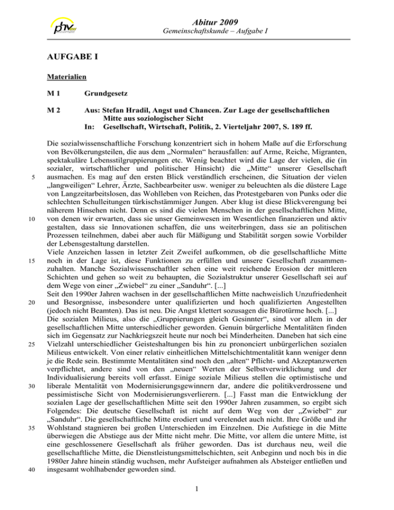 Abitur 2009 Gemeinschaftskunde – Aufgabe I AUFGABE I Materialien 5 10 15 20 25 30 35 40 M1 Grundgesetz M2 Aus: Stefan Hradil, Angst und Chancen. Zur Lage der gesellschaftlichen Mitte aus soziologischer Sicht In: Gesellschaft, Wirtschaft, Politik, 2. Vierteljahr 2007, S. 189 ff. Die sozialwissenschaftliche Forschung konzentriert sich in hohem Maße auf die Erforschung von Bevölkerungsteilen, die aus dem „Normalen“ herausfallen: auf Arme, Reiche, Migranten, spektakuläre Lebensstilgruppierungen etc. Wenig beachtet wird die Lage der vielen, die (in sozialer, wirtschaftlicher und politischer Hinsicht) die „Mitte“ unserer Gesellschaft ausmachen. Es mag auf den ersten Blick verständlich erscheinen, die Situation der vielen „langweiligen“ Lehrer, Ärzte, Sachbearbeiter usw. weniger zu beleuchten als die düstere Lage von Langzeitarbeitslosen, das Wohlleben von Reichen, das Protestgebaren von Punks oder die schlechten Schulleitungen türkischstämmiger Jungen. Aber klug ist diese Blickverengung bei näherem Hinsehen nicht. Denn es sind die vielen Menschen in der gesellschaftlichen Mitte, von denen wir erwarten, dass sie unser Gemeinwesen im Wesentlichen finanzieren und aktiv gestalten, dass sie Innovationen schaffen, die uns weiterbringen, dass sie an politischen Prozessen teilnehmen, dabei aber auch für Mäßigung und Stabilität sorgen sowie Vorbilder der Lebensgestaltung darstellen. Viele Anzeichen lassen in letzter Zeit Zweifel aufkommen, ob die gesellschaftliche Mitte noch in der Lage ist, diese Funktionen zu erfüllen und unsere Gesellschaft zusammenzuhalten. Manche Sozialwissenschaftler sehen eine weit reichende Erosion der mittleren Schichten und gehen so weit zu behaupten, die Sozialstruktur unserer Gesellschaft sei auf dem Wege von einer „Zwiebel“ zu einer „Sanduhr“. [...] Seit den 1990er Jahren wachsen in der gesellschaftlichen Mitte nachweislich Unzufriedenheit und Besorgnisse, insbesondere unter qualifizierten und hoch qualifizierten Angestellten (jedoch nicht Beamten). Das ist neu. Die Angst klettert sozusagen die Bürotürme hoch. [...] Die sozialen Milieus, also die „Gruppierungen gleich Gesinnter“, sind vor allem in der gesellschaftlichen Mitte unterschiedlicher geworden. Genuin bürgerliche Mentalitäten finden sich im Gegensatz zur Nachkriegszeit heute nur noch bei Minderheiten. Daneben hat sich eine Vielzahl unterschiedlicher Geisteshaltungen bis hin zu prononciert unbürgerlichen sozialen Milieus entwickelt. Von einer relativ einheitlichen Mittelschichtmentalität kann weniger denn je die Rede sein. Bestimmte Mentalitäten sind noch den „alten“ Pflicht- und Akzeptanzwerten verpflichtet, andere sind von den „neuen“ Werten der Selbstverwirklichung und der Individualisierung bereits voll erfasst. Einige soziale Milieus stellen die optimistische und liberale Mentalität von Modernisierungsgewinnern dar, andere die politikverdrossene und pessimistische Sicht von Modernisierungsverlierern. [...] Fasst man die Entwicklung der sozialen Lage der gesellschaftlichen Mitte seit den 1990er Jahren zusammen, so ergibt sich Folgendes: Die deutsche Gesellschaft ist nicht auf dem Weg von der „Zwiebel“ zur „Sanduhr“. Die gesellschaftliche Mitte erodiert und verelendet auch nicht. Ihre Größe und ihr Wohlstand stagnieren bei großen Unterschieden im Einzelnen. Die Aufstiege in die Mitte überwiegen die Abstiege aus der Mitte nicht mehr. Die Mitte, vor allem die untere Mitte, ist eine geschlossenere Gesellschaft als früher geworden. Das ist durchaus neu, weil die gesellschaftliche Mitte, die Dienstleistungsmittelschichten, seit Anbeginn und noch bis in die 1980er Jahre hinein ständig wuchsen, mehr Aufsteiger aufnahmen als Absteiger entließen und insgesamt wohlhabender geworden sind. 1 Abitur 2009 Gemeinschaftskunde – Aufgabe I Weil ihre äußeren Lagen und ihre inneren Haltungen so unterschiedlich geworden sind, stellt die gesellschaftliche Mitte heute nur noch teilweise das gesellschaftliche Vorbild dar. Nur Teile der gesellschaftlichen Mitte personifizieren noch die Aufstiegshoffnungen und Gerechtigkeitsvorstellungen anderer sozialer Schichten. M3 5 10 15 20 Aus: Heribert Prantl, Die neue alte soziale Frage In: Süddeutsche Zeitung vom 16.10.2006 „Man muss dafür sorgen, dass der Gegensatz der Reichen und Armen sich möglichst ausgleicht“: Der Satz stammt nicht von Merkel, Müntefering oder Kurt Beck, sondern vom alten Aristoteles. Er hat klarer gedacht als die große Koalition – die sich nun plötzlich darüber zu wundern beginnt, dass es eine neue, wachsende Unterschicht gibt in Deutschland. Am Boden dieser Unterschicht herrscht Verwahrlosung, die leider immer erst dann beklagt wird, wenn ein Kind daran gestorben ist. In einem der reichsten Länder der Welt wächst die Diskrepanz zwischen Arm und Reich; der vormalige Generalbundesanwalt Kay Nehm hat kurz vor Ende seiner Amtszeit vor dem „Auseinanderdriften der Gesellschaft“ gewarnt, das den inneren Frieden gefährden könne. So ist es: Es gibt eine Rutsche in die Armut, genannt Hartz IV, und es gibt eine gewaltige Angst davor, dass man sich auf einmal selbst darauf befinden könnte. Es gibt, auch in der Mittelschicht, eine Anhäufung von Unzufriedenheit, durchwirkt von Existenzangst. Die innere Gewissheit, dass es in einer Leistungsgesellschaft jeder nach oben schaffen und sich dann auch oben halten kann, wenn er nur begabt und fleißig ist, ist dahin – auch in einem Teil des Mittelstandes. [...] Die neue Unterschicht wächst: Die Bildungsoffensive der 70er Jahre, als die Kinder kleiner Leute zu Hunderttausenden auf der Strickleiter, die ihnen das Bafög knüpfte, nach oben kletterten, ist Vergangenheit; die Strickleiter ist eingezogen, das Projekt sozialer Aufstieg zu Ende, die deutsche Gesellschaft verändert sich wieder hin zur Klassengesellschaft. Das System ist semipermeabel1 geworden, durchlässig nur noch in eine Richtung – nach unten. __________ 1 semipermeabel: halbdur