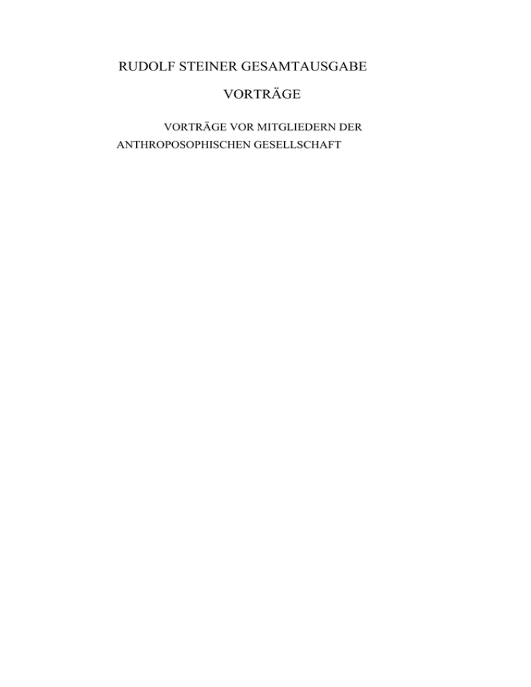 RUDOLF STEINER GESAMTAUSGABE VORTRÄGE VORTRÄGE VOR MITGLIEDERN DER ANTHROPOSOPHISCHEN GESELLSCHAFT RUDOLF STEINER Die Offenbarungen des Karma Ein Zyklus von elf Vorträgen gehalten in Hamburg zwischen dem 16. und 28. Mai 1910 1992 RUDOLF STEINER VERLAG DORNACH/SCHWEIZ Nach vom Vortragenden nicht durchgesehenen Nachschriften herausgegeben von der Rudolf Steiner-Nachlaßverwakung Die Herausgabe besorgte Robert Friedenthal 1. Auflage (Großes Format) Berlin (1911) (Zyklus XII) 2. (1. buchförmige) Auflage Dornach 1932 3. Auflage Dornach 1944 4. Auflage Dornach 1949 5. Auflage, durchgesehen und mit den vorhandenen Unterlagen verglichen, Gesamtausgabe Dornach 1956 6. Auflage, durchgesehen, im wesentlichen unverändert, Gesamtausgabe Dornach 1968 7. Auflage, Gesamtausgabe Dornach 1975 8. Auflage, Gesamtausgabe Dornach 1992 Bibliographie-Nr. 120 Einbandgestaltung von Assja Turgenieff Alle Rechte bei der Rudolf Steiner-Nachlaßverwaltung Dornach/Schweiz © 1956 by Rudolf Steiner-Nachlaßverwaltung, Dornach/Schweiz Printed in Germany by Konkordia Druck GmbH, 7580 Bühl ISBN 3-7274-1200-3 Zu den Veröffentlichungen aus dem Vortragswerk von Rudolf Steiner Die Grundlage der anthroposophisch orientierten Geisteswissenschaft bilden die von Rudolf Steiner (1861-1925) geschriebenen und veröffentlichten Werke. Daneben hielt er in den Jahren 1900 bis 1924 zahlreiche Vorträge und Kurse, sowohl öffentlich wie auch für die Mitglieder der Theosophischen, später Anthroposophischen Gesellschaft. Er selbst wollte ursprünglich, daß seine durchwegs frei gehaltenen Vorträge nicht schriftlich festgehalten würden, da sie als «mündliche, nicht zum Druck bestimmte Mitteilungen» gedacht waren, Nachdem aber zunehmend unvollständige und fehlerhafte Hörernachschriften angefertigt und verbreitet wurden, sah er sich veranlaßt, das Nachschreiben zu regeln. Mit dieser Aufgabe betraute er Marie Steiner-von Sivers. Ihr oblag die Bestimmung der Stenographierenden, die Verwaltung der Nachschriften und die für die Herausgabe notwendige Durchsicht der Texte. Da Rudolf Steiner aus Zeitmangel nur in ganz wenigen Fällen die Nachschriften selbst korrigieren konnte, muß gegenüber allen Vortragsveröffentlichungen sein Vorbehalt berücksichtigt werden: «Es wird eben nur hingenommen werden müssen, daß in den von mir nicht nachgesehenen Vorlagen sich Fehlerhaftes findet.» Über das Verhältnis der Mitgliedervorträge, welche zunächst nur als interne Manuskriptdrucke zugänglich waren, zu seinen öffentlichen Schriften äußert sich Rudolf Steiner in seiner Selbstbiographie «Mein Lebensgang» (35. Kapitel). Der entsprechende Wortlaut ist am Schluß dieses Bandes wiedergegeben. Das dort Gesagte gilt gleichermaßen auch für die Kurse zu einzelnen Fachgebieten, welche sich an einen begrenzten, mit den Grundlagen der Geisteswissenschaft vertrauten Teilnehmerkreis richteten. . Nach dem Tode von Marie Steiner (1867-1948) wurde gemäß ihren Richtlinien mit der Herausgabe einer Rudolf Steiner Gesamtausgabe begonnen. Der vorliegende Band bildet einen Bestandteil dieser Gesamtausgabe. Soweit erforderlich, finden sich nähere Angaben zu den Textunterlagen am Beginn der Hinweise. INHALT Ausführliche Inhaltsangaben siehe Seite 234 ff. ERSTER VORTRAG, Hamburg, 16. Mai 1910 .................................................. 9 Wesen und Bedeutung des Karma in Einzelpersönlichkeit, Individualität, Menschheit, Erde, Welt ZWEITER VORTRAG, 17. Mai 1910 ................................................................. 34 Karma und Tierreich DRITTER VORTRAG, 18. Mai 1910 ................................................................. 55 Krankheit und Gesundheit in Beziehung zu Karma VIERTER VORTRAG, 19. Mai 1910 ................................................................. 76 Heilung und Unheilbarkeit in Beziehung zu Karma FÜNFTERVORTRAG,20.Mail910 .............................................................. Natürliche und zufällige Erkrankungen in Beziehung zu Karma SECHSTER VORTRAG, 21. Mai 1910 ............................................................... 113 Lebensunfälle in Beziehung zu Karma SlEBENTERVoRTRAG,22.Mail910............................................................ 132 Elementarereignisse, Vulkanausbrüche, Erdbeben, Epidemien in Beziehung zu Karma AcHTERVoRTRAG,25.Mail910 .................................................................. 152 Karma der höheren Wesenheiten NEUNTER VORTRAG, 26. Mai 1910 ................................................................ 172 Tod und Geburt im Verhältnis zu Karma 93 ZEHNTERVORTRAG,27.Mail910............................................................... 187 Freier Wille und Karma in der Zukunft der Menschheitsentwicklung ELFTERVoRTRAG,28.Mail910 ................................................................... 206 (Individuelles und Gemeinschaftskarma) EINLADUNG ZUM VORTRAGSZYKLUS .............................................................. 226 Hinweise Zu dieser Ausgabe...................................................................................... 228 Hinweise zum Text .................................................................................... 229 Namenregister ................................................................................................ 233 Ausführliche Inhaltsangaben .......................................................................... 234 Rudolf Steiner über die Vortragsnachschriften .............................................. 239 ERSTER VORTRAG Hamburg, 16. Mai 1910 Dieser Zyklus von Vorträgen soll Fragen behandeln aus dem Gebiete der Geisteswissenschaft, die tief in das Leben einschneidend sind. Aus den verschiedenen Darstellungen, die im Laufe der Zeit gegeben worden sind, ist es uns ja geläufig, daß Geisteswissenschaft nicht eine abstrakte Theorie sein soll, nicht eine bloße Doktrin oder Lehre, sondern ein Quell für Leben und Lebenstüchtigkeit, und sie erfüllt erst dann ihre Aufgabe, wenn du