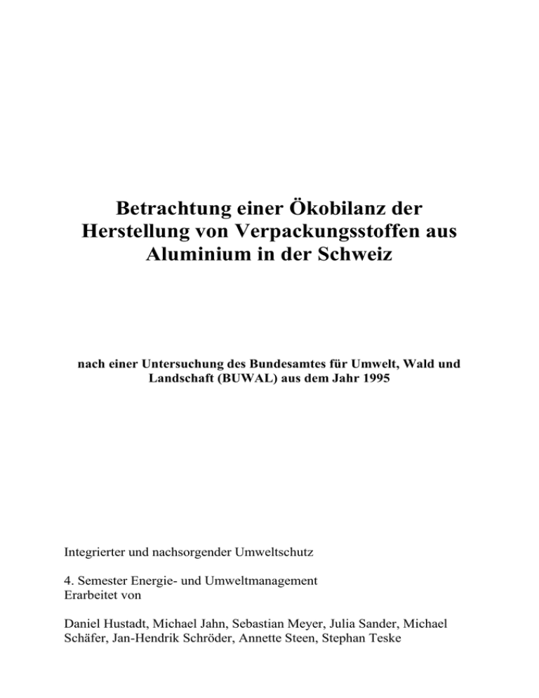 Betrachtung einer Ökobilanz der Herstellung von Verpackungsstoffen aus Aluminium in der Schweiz nach einer Untersuchung des Bundesamtes für Umwelt, Wald und Landschaft (BUWAL) aus dem Jahr 1995 Integrierter und nachsorgender Umweltschutz 4. Semester Energie- und Umweltmanagement Erarbeitet von Daniel Hustadt, Michael Jahn, Sebastian Meyer, Julia Sander, Michael Schäfer, Jan-Hendrik Schröder, Annette Steen, Stephan Teske 2 Gliederung 1. Grundlegendes über die Aluminiumherstellung ................................. 4 2. Fließbild zur Herstellung von Aluminiumfolie.................................... 5 3. Herstellung von Aluminiumoxid ........................................................... 7 3.1 Einrücken in den Gesamtprozess ................................................................................ 7 3.2 Beschreibung der relevanten Teilprozesse ................................................................. 8 3.3 Umweltemissionen aus der Nutzung thermischer und chemischer Energie .......... 9 4. Herstellung von Aluminium in Barren aus Aluminiumoxid ............ 11 4.1 Einordnung in den Gesamtprozess ............................................................................ 11 4.2 Beschreibung der relevanten Teilprozesse ............................................................... 11 4.3 Berechnung der Umweltemissionen aus der Nutzung elektrischer und thermischer Energie ........................................................................................................... 12 5. Herstellung von Aluminiumfolie ......................................................... 16 5.1 Was ist Aluminiumfolie?............................................................................................ 16 5.2 Beschreibung der relevanten Teilprozesse ............................................................... 17 5.2.1 Warmwalzen............................................................................................................ 17 5.2.2 Kaltwalzen ............................................................................................................... 18 5.3 Ökoinventar für 1000kg Aluminiumfolie................................................................. 19 5.3.1 Schadstoffemissionen .............................................................................................. 19 5.3.2 Luftschadstoffemissionen........................................................................................ 20 5.3.3 Wasserschadstoffemissionen ................................................................................... 21 6. Transportprozesse von Aluminiumoxid, Aluminium in Barren und Aluminiumfolie ......................................................................................... 22 6.1 Einordnung der Betrachtung ...................................................................................... 22 6.2 Transporte von Primärstoffen der Herstellung ........................................................ 22 6.3 Aluminiumoxid ............................................................................................................ 23 6.3.1 Energieverbrauch .................................................................................................... 23 6.3.2 Umweltemissionen .................................................................................................. 23 6.4 Aluminium in Barren .................................................................................................. 24 6.4.1 Energieverbrauch .................................................................................................... 24 6.4.2 Umweltemissionen .................................................................................................. 26 6.5 Aluminiumfolie ........................................................................................................... 27 6.5.1 Energieverbrauch .................................................................................................... 27 6.5.2 Umweltemissionen .................................................................................................. 28 6.6 Recycling-Aluminium ................................................................................................ 29 7. Herstellung von Recycling-Aluminium .............................................. 30 7.1 Grundsätzliche Betrachtung ....................................................................................... 30 7.2 Beschreibung der relevanten Teilprozesse ............................................................... 30 3 7.3 Energieverbrauch ......................................................................................................... 31 7.4 Ressourcenverbrauch .................................................................................................. 32 7.5 Umweltemissionen bei der Herstellung von Recycling-Aluminium .................... 32 7.5.1 Luftschadstoffe aus der Nutzung thermischer und elektrischer Energie ............. 32 7.5.2 Wasserschadstoffe aus der Nutzung thermischer und elektrischer Energie ............ 33 7.5.3 Nicht energiebezogene Umweltemissionen ........................................................... 33 8. Aluminium mit unterschiedlichen Rezyklatanteilen......................... 34 8.1 Einordnung in den Prozess ......................................................................................... 34 8.2 Darstellung und Vergleich der Emissionen für die ................................................. 35 unterschiedlichen Rezyklatanteile ................................................................................... 35 8.2.1 Allgemeines ............................................................................................................. 35 8.2.2 Energetisch verwertete Ressourcen ......................................................................... 35 8.2.3 Rohstofflich verwertete Ressourcen .....................................................