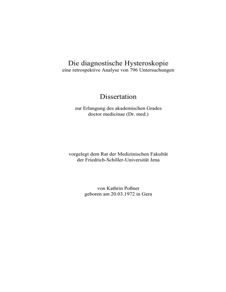 Die diagnostische Hysteroskopie eine retrospektive Analyse von 796 Untersuchungen Dissertation zur Erlangung des akademischen Grades doctor medicinae (Dr. med.) vorgelegt dem Rat der Medizinischen Fakultät der Friedrich-Schiller-Universität Jena von Kathrin Poßner geboren am 20.03.1972 in Gera Gutachter 1. 2. 3. Tag der öffentlichen Verteidigung: Verzeichnis verwendeter Abkürzungen AAGL American Association of Gynecologic Laparoscopists bzw. beziehungsweise GABA Gamma-Aminobuttersäure histolog. histologisch hypoplast. hypoplastisch hysteroskop. hysteroskopisch IUP Intrauterinpessar patholog. pathologisch prolif. proliferierend sekretor. sekretorisch vaginalsonograph. vaginalsonographisch V. a. Verdacht auf z. B. zum Beispiel Inhaltsverzeichnis Seite 1 1. Einführung 2. Die historische Entwicklung der Hysteroskopie 2 3. Technik der Hysteroskopie 4 3.1. 3.2. 3.3. 3.3.1. 3.3.2. Instrumentarium Distensionsmedien Die Durchführung der diagnostischen Flüssigkeitshysteroskopie Benötigte Instrumente Ablauf 4 6 8 8 8 4. Indikationen der Hysteroskopie 10 5. Kontraindikationen der Hysteroskopie 11 6. Komplikationen der Hysteroskopie 11 6.1. 6.1.1. 6.2. 6.3. Intraoperative Komplikationen Die hypotone Hyperhydratation Postoperative Komplikationen Spätkomplikationen 11 13 14 15 7. Die Problematik der Tumorzellverschleppung 15 8. Zur diagnostischen Unsicherheit der Abrasio 16 9. Der Stellenwert der diagnostischen Hysteroskopie 17 10. Zielstellung 22 11. Material und Methode 23 11.1. 11.2. 12. 12.1. 12.2. 12.2.1. Patientengut Praktisches Vorgehen Ergebnisse Charakterisierung des Patientengutes Indikationen zur Hysteroskopie Altersverteilung der Hysteroskopieindikationen 23 24 25 25 28 29 12.3. 12.3.1. 12.3.2. 12.3.3. 12.4. 12.4.1. 12.4.2. 12.5. 12.6. 12.6.1. 12.6.2. 12.6.3. 12.6.4. 12.6.5. 12.6.6. 12.6.7. 12.6.8. 12.6.9. 12.6.10. 12.7. 12.8. 12.9. 12.9.1. 12.9.2. 12.9.3. 12.10. 12.10.1. 12.10.2. 12.11. 12.12. 13. 14. 15. 16. Hysteroskopiebefunde Hysteroskopische Beurteilung des Uterus Hysteroskopische Endometriumbeurteilung Hysteroskopischer Endometriumbefund und Alter der Patientin Histologiebefunde Histologischer Endometriumbefund Histologischer Endometriumbefund und Alter der Patientin Korrelation der Häufigkeit der hysteroskopisch bzw. histologisch diagnostizierten pathologischen Endometriumbefunde in Abhängigkeit vom Alter Vergleich der einzelnen Hysteroskopiebefunde mit den histologischen Diagnosen „Unauffälliges“ Endometrium Endometriumatrophie Endometriumhyperplasie Endometriumpolyp Endometriummalignom Endometritis Gravidität / Graviditätsreste Zusammenfassung der hysteroskopischen und histologischen Endometriumbefunde Myombefunde Zervixbeurteilung Kongenitale Fehlbildungen des Uterus Intrauterinpessar - hysteroskopische Entfernung Hysteroskopische und histologische Befunde in Bezug auf die häufigsten Indikationen Befunde bei der Postmenopausenblutung Befunde bei Blutungsstörungen vor der Menopause Befunde bei asymptomatischen Patientinnen mit auffälligem sonographischen Befund des Uterus Alleinige Abrasio versus Hysteroskopie und Abrasio in Kombination Indikationen im Vergleich Wesentliche Befunde im Vergleich Probleme bei der Hysteroskopie Komplikationen bei der Hysteroskopie mit anschließender Abrasio Diskussion Zusammenfassung Literaturverzeichnis Anhang 30 30 30 31 34 34 36 39 40 40 42 43 45 47 49 49 50 52 53 55 57 58 58 59 61 65 65 66 69 70 71 80 1. Einführung Dank optimierter Technologie mit der Möglichkeit exzellenter Visualisation von Körperhöhlen haben endoskopische Techniken zur Diagnostik und Therapie verschiedener Erkrankungen in den letzten Jahren zunehmend an Bedeutung gewonnen. Diese zeichnen sich zusätzlich durch die Möglichkeit der gleichzeitigen gezielten chirurgischen Behandlung bei minimaler Invasivität mit geringer Traumatisierung und somit auch kurzer Hospitalisationsdauer des Patienten oder sogar ambulanter Durchführbarkeit aus (105). In der Gynäkologie ist die Laparoskopie seit Jahren fest als diagnostische und therapeu-tische Methode etabliert, was nun auch in zunehmendem Maße auf die Hysteroskopie zutrifft. 1869 wurde erstmals von Pantaleoni über die diagnostische Hysteroskopie berichtet (97). Die Akzeptanz und der Einsatz der Methode als suffizientes bildgebendes Diagnostikum nahm jedoch erst in den letzten Jahren, über 100 Jahre nach der Erstbeschreibung, erheblich zu. Gründe hierfür waren die Weiterentwicklung des Instrumentariums, insbesondere der optischen Systeme, die sich heute durch exzellente Eigenschaften bei immer geringerem Durchmesser auszeichnen sowie die Möglichkeit der hysteroskopisch-operativen Behandlung intrakavitärer Pathologien bieten. In der Klinik für Frauenheilkunde und Geburtshilfe des Klinikums der FriedrichSchiller-Universität Jena kommt die Hysteroskopie seit Dezember 1991 zum Einsatz. In der nachfolgenden Arbeit wurden 796 im Zeitraum von Dezember 1991 bis Juni 1995 im klinischen Ablauf routinemäßig durchgeführte diagnostische Flüssigkeitshysteroskopien mit anschließender fraktionierter Abrasio retrospektiv analysiert. 2 2. Die historische Entwicklung der Hysteroskopie Die Anfänge der Endoskopie finden sich schon zu Beginn des 19. Jahrhunderts. 1807 stellte Bozzini (6) einen mehrschäftigen „Lichtleiter“ vor, mit dem menschliche Körperhöhlen ausgeleuchtet werden sollten. Als Lichtquelle diente eine Kerze. Doch wegen Bedenken der Wiener Medizinischen Akademie (71), den verborgensten Winkel des menschlichen Körpers anzutasten, wurde diese Entwicklung zunächst nicht weiter vorangetrieben. Erst 1896, über 60 Jahre später, beschrieb Pantaleoni (97) die Durchführung der ersten Gebärmutterspiegelung bei einer 60jährigen Frau mit rezidivierenden Blutungen. Zur Untersuchung benutzte er ein Zystoskop nach Desormeaux (25). Als Beleuchtungssystem wurde eine Kerze mit einem Hohlspiegel verwendet. Das Cavum uteri mußte ohne jegliche Distension beurteilt werden. 1817 stellte Nitze (92) ein Zystos