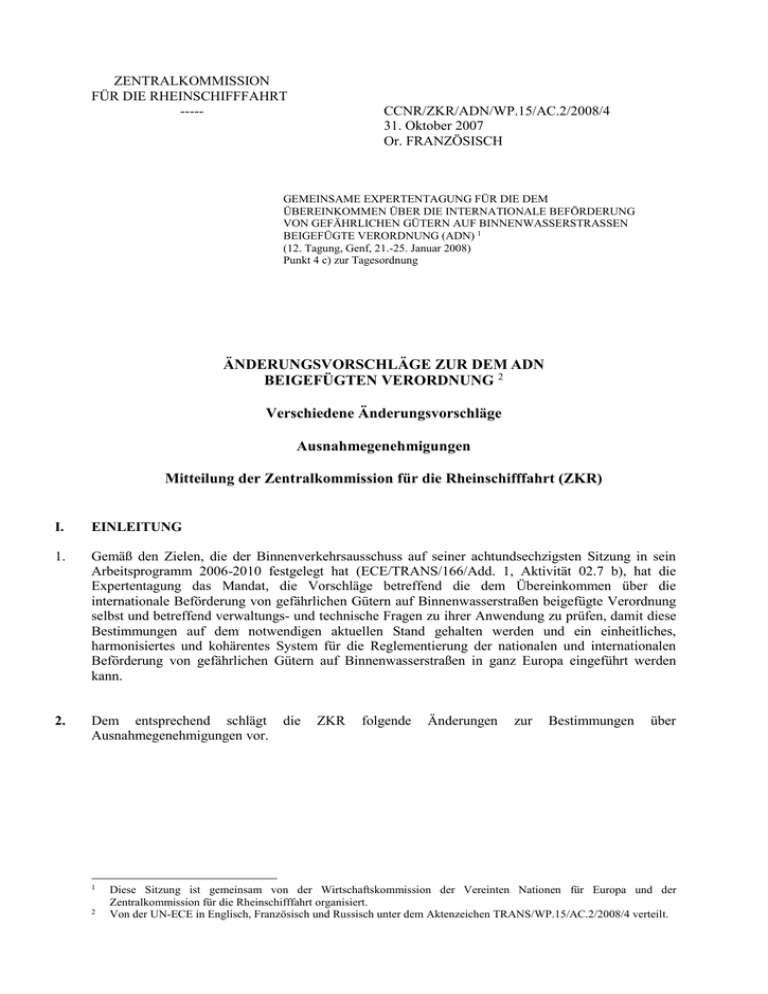 ZENTRALKOMMISSION FÜR DIE RHEINSCHIFFFAHRT ----- CCNR/ZKR/ADN/WP.15/AC.2/2008/4 31. Oktober 2007 Or. FRANZÖSISCH GEMEINSAME EXPERTENTAGUNG FÜR DIE DEM ÜBEREINKOMMEN ÜBER DIE INTERNATIONALE BEFÖRDERUNG VON GEFÄHRLICHEN GÜTERN AUF BINNENWASSERSTRASSEN BEIGEFÜGTE VERORDNUNG (ADN) 1 (12. Tagung, Genf, 21.-25. Januar 2008) Punkt 4 c) zur Tagesordnung ÄNDERUNGSVORSCHLÄGE ZUR DEM ADN BEIGEFÜGTEN VERORDNUNG 2 Verschiedene Änderungsvorschläge Ausnahmegenehmigungen Mitteilung der Zentralkommission für die Rheinschifffahrt (ZKR) I. EINLEITUNG 1. Gemäß den Zielen, die der Binnenverkehrsausschuss auf seiner achtundsechzigsten Sitzung in sein Arbeitsprogramm 2006-2010 festgelegt hat (ECE/TRANS/166/Add. 1, Aktivität 02.7 b), hat die Expertentagung das Mandat, die Vorschläge betreffend die dem Übereinkommen über die internationale Beförderung von gefährlichen Gütern auf Binnenwasserstraßen beigefügte Verordnung selbst und betreffend verwaltungs- und technische Fragen zu ihrer Anwendung zu prüfen, damit diese Bestimmungen auf dem notwendigen aktuellen Stand gehalten werden und ein einheitliches, harmonisiertes und kohärentes System für die Reglementierung der nationalen und internationalen Beförderung von gefährlichen Gütern auf Binnenwasserstraßen in ganz Europa eingeführt werden kann. 2. Dem entsprechend schlägt Ausnahmegenehmigungen vor. 1 2 die ZKR folgende Änderungen zur Bestimmungen über Diese Sitzung ist gemeinsam von der Wirtschaftskommission der Vereinten Nationen für Europa und der Zentralkommission für die Rheinschifffahrt organisiert. Von der UN-ECE in Englisch, Französisch und Russisch unter dem Aktenzeichen TRANS/WP.15/AC.2/2008/4 verteilt. CCNR-ZKR/ADN/WP.15/AC.2/2008/4 Seite 2 3. Abschnitt 1.5.2 wie folgt ändern: - In 1.5.2.1.3 „in dieser Verordnung“ ändern in: „in Unterabschnitt 3.2.4.1“ - In 1.5.2.2.1 wird der erste Satz von Absatz 2 wie folgt gefasst: „Für den Antrag sind die Angaben gemäß Unterabschnitt 3.2.4.2 zu machen.“ - In 1.5.2.2.2 Satz 2 „vom Verwaltungsausschuss“ ändern in: „in Unterabschnitt 3.2.4.3. “ 4. Nach Tabelle C und den dazu gehörigen Fußnoten und Bemerkungen folgenden Abschnitt einfügen: „3.2.4 Anwendungsverfahren des Abschnitts 1.5.2 betreffend Ausnahmegenehmigungen für die Beförderung in Tankschiffen. 3.2.4.1 Muster der Ausnahmegenehmigung von 1.5.2 ADN Ausnahmegenehmigung auf Grund von 1.5.2 ADN Auf Grund von 1.5.2 ADN ist die Beförderung des in der Anlage zu dieser Ausnahmegenehmigung bezeichneten Gutes unter den dort festgelegten Bedingungen zur Beförderung in Tankschiffen zugelassen. Der Beförderer muss den Stoff vor dem Transport von einer zugelassenen Klassifikationsgesellschaft in die in 1.16.1.2.5 ADN genannte Liste eintragen lassen. Diese Ausnahmegenehmigung gilt für .................................................................................................................................. (Orte und/oder Strecken der Gültigkeit) Sie gilt vom Tag der Unterzeichnung, vorbehaltlich vorherigen Widerrufs, zwei Jahre. Staat der Ausstellung : .............................................. Zuständige Behörde : .............................................. Datum : ..................................... Unterschrift : ..................................... CCNR-ZKR/ADN/WP.15/AC.2/2008/4 Seite 3 3.2.4.2 Formblatt für Anträge im Gefahrgutbereich auf Erteilung einer Ausnahmegenehmigung gemäß 1.5.2 ADN Bei Anträgen auf Erteilung von Ausnahmegenehmigungen sind Angaben zu folgenden Fragen oder Punkten zu machen *). Die Angaben werden nur für amtliche Zwecke und vertraulich behandelt. Antragsteller .............................................................................................................................................. (Name) (Firma) .............................................................................................................................................. ( ) ................................................................................... .............................................................................................................................................. (Anschrift) Kurzbeschreibung des Antrags Zulassung der Beförderung von ........................................................................................................................... als Stoff der Klasse ........................ zur Beförderung in Tankschiffen. Anlagen (mit Kurzbeschreibung) Aufgestellt: Ort: .................................................................................................................................................. Datum: ........................................................................................................................................... Unterschrift: .................................................................................................................................. (des für die Angaben Verantwortlichen) 1. Allgemeine Angaben zum Gefahrgut 1.1 Handelt es sich um einen reinen Stoff , um eine Mischung , um eine Lösung ? 1.2 Technische Bezeichnung (möglichst ADN [ADR/RID, IMDG Code oder UN]-Nomenklatur). 1.3 Synonyme. 1.4 Handelsname. 1.5 Strukturformel und bei Gemischen die Zusammensetzung und Konzentration. 1.6 Gefahrklasse gegebenenfalls [Klassifizierungscode], Verpackungsgruppe. 1.7 Stoffnummer (soweit vorhanden). _________________ *) Bei Fragen, die für den betreffenden Antragsgegenstand nicht zutreffen, ist „entfällt“ einzutragen. CCNR/ZKR/ADN/WP.15/AC.2/2008/3 Seite 4 2. Physikalisch-chemische Eigenschaften 2.1 Zustand während der Beförderung (z.B. gasförmig, flüssig, geschmolzen, ...) 2.2 Dichte der Flüssigkeit bei 20 C. oder bei der Beförderungstemperatur bei Stoffen, die erwärmt oder gekühlt transportiert werden. 2.3 Beförderungstemperatur (bei Stoffen, die in aufgeheiztem oder gekühltem Zustand befördert werden). 2.4 Schmelzpunkt oder Schmelzbereich ...