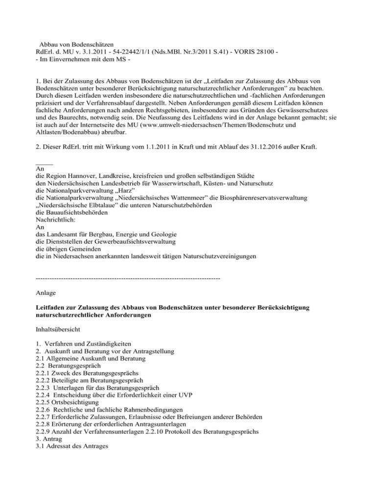 Abbau von Bodenschätzen RdErl. d. MU v. 3.1.2011 - 54-22442/1/1 (Nds.MBl. Nr.3/2011 S.41) - VORIS 28100 - Im Einvernehmen mit dem MS 1. Bei der Zulassung des Abbaus von Bodenschätzen ist der „Leitfaden zur Zulassung des Abbaus von Bodenschätzen unter besonderer Berücksichtigung naturschutzrechtlicher Anforderungen” zu beachten. Durch diesen Leitfaden werden insbesondere die naturschutzrechtlichen und -fachlichen Anforderungen präzisiert und der Verfahrensablauf dargestellt. Neben Anforderungen gemäß diesem Leitfaden können fachliche Anforderungen nach anderen Rechtsgebieten, insbesondere aus Gründen des Gewässerschutzes und des Baurechts, notwendig sein. Die Neufassung des Leitfadens wird in der Anlage bekannt gemacht; sie ist auch auf der Internetseite des MU (www.umwelt-niedersachsen/Themen/Bodenschutz und Altlasten/Bodenabbau) abrufbar. 2. Dieser RdErl. tritt mit Wirkung vom 1.1.2011 in Kraft und mit Ablauf des 31.12.2016 außer Kraft. _____ An die Region Hannover, Landkreise, kreisfreien und großen selbständigen Städte den Niedersächsischen Landesbetrieb für Wasserwirtschaft, Küsten- und Naturschutz die Nationalparkverwaltung „Harz” die Nationalparkverwaltung „Niedersächsisches Wattenmeer” die Biosphärenreservatsverwaltung „Niedersächsische Elbtalaue” die unteren Naturschutzbehörden die Bauaufsichtsbehörden Nachrichtlich: An das Landesamt für Bergbau, Energie und Geologie die Dienststellen der Gewerbeaufsichtsverwaltung die übrigen Gemeinden die in Niedersachsen anerkannten landesweit tätigen Naturschutzvereinigungen -------------------------------------------------------------------------------Anlage Leitfaden zur Zulassung des Abbaus von Bodenschätzen unter besonderer Berücksichtigung naturschutzrechtlicher Anforderungen Inhaltsübersicht 1. Verfahren und Zuständigkeiten 2. Auskunft und Beratung vor der Antragstellung 2.1 Allgemeine Auskunft und Beratung 2.2 Beratungsgespräch 2.2.1 Zweck des Beratungsgesprächs 2.2.2 Beteiligte am Beratungsgespräch 2.2.3 Unterlagen für das Beratungsgespräch 2.2.4 Entscheidung über die Erforderlichkeit einer UVP 2.2.5 Ortsbesichtigung 2.2.6 Rechtliche und fachliche Rahmenbedingungen 2.2.7 Erforderliche Zulassungen, Erlaubnisse oder Befreiungen anderer Behörden 2.2.8 Erörterung der erforderlichen Antragsunterlagen 2.2.9 Anzahl der Verfahrensunterlagen 2.2.10 Protokoll des Beratungsgesprächs 3. Antrag 3.1 Adressat des Antrages 3.2 Entscheidung über die Erforderlichkeit einer UVP 3.3 Entscheidung über die Erforderlichkeit einer FFH-Verträglichkeitsprüfung 3.4 Bestandteile des Antrages 3.5 Vollständigkeitsprüfung und Verfahrensdauer 3.6 Prüfung nach Baurecht 4. Behördenbeteiligung und Mitwirkung von Verbänden 4.1 Koordinierung sonstiger Genehmigungen, Projektmanagement 4.2 Besondere Beteiligungen 4.3 Am Verfahren zu Beteiligende 4.4 Grenzüberschreitende Beteiligung 4.5 Hinweis auf Rechte und Fristen 4.6 Beratung in Fachfragen 4.7 Antragskonferenz 5. Öffentlichkeitsbeteiligung bei UVP-pflichtigen Vorhaben und wasserrechtlichen Planfeststellungsverfahren 6. Zulassung 6.1 Zusammenfassende Darstellung und Bewertung bei UVP-Pflicht 6.2 Zulassungsbescheid 6.3 Entscheidungsfrist 6.4 Zulässigkeit in Wasserschutz- und Überschwemmungsgebieten 6.5 Ausnahmen oder Befreiungen in geschützten Teilen von Natur und Landschaft 6.6 FFH-Verträglichkeit 6.7 Ausnahmen oder Befreiungen von den Schädigungs- und Störungsverboten des § 44 BNatSchG 6.8 Abwägung nach § 15 Abs. 5 BNatSchG 6.9 Einhaltung sonstiger Rechtsvorschriften 6.10 Folgenutzung 6.11 Nebenbestimmungen 6.12 Herrichtungs-, Ausgleichs- und Ersatzmaßnahmen, Dauer der Zulassung 6.13 Sicherheitsleistung 6.14 Einverständnis der Grundeigentümer 6.15 Vorlage von Unterlagen während und nach Abschluss des Abbaus 6.16 Änderungen von Zulassungsvoraussetzungen 6.17 Zustellung des Zulassungsbescheides 6.18 Bekanntgabe 7. Überwachung 7.1 Kontrolle und Beratung 7.2 Verfüllung mit Bodenmaterial 8. (Teil-)Verfüllung der Abbaustelle 8.1 Voraussetzungen 8.2 Anforderungen an unbelastetes Bodenmaterial 8.3 Verfahren 9. Zulassung des Bodenabbaus nach anderen Rechtsvorschriften 9.1 Immissionsschutzrechtliche Zulassung 9.2 Bergrechtliche Zulassung 9.3 Abfallrechtliches Vorhaben Anlagen 1 Entscheidungsbaum: Bedarf ein Bodenabbauvorhaben einer Genehmigung nach § 8 NAGBNatSchG? 2 Inhalt des Erläuterungstextes sowie des Karten- und Planwerkes unter besonderer Berücksichtigung der naturschutzfachlichen Bestandsaufnahme gemäß § 9 NAGBNatSchG und der Anforderungen des § 17 Abs. 4 BNatSchG 2 a Inhalt des Erläuterungstextes sowie des Karten- und Planwerkes, weitergehende Anforderungen zur Umweltverträglichkeitsprüfung 2 b Inhalt des Erläuterungstextes sowie des Karten- und Planwerkes, weitergehende Anforderungen zur Umweltverträglichkeitsprüfung und Verträglichkeitsprüfung gemäß § 34 BNatSchG 2 c Inhalt des Erläuterungstextes sowie des Karten- und Planwerkes, weitergehende Anforderungen zur Verträglichkeitsprüfung gemäß § 34 BNatSchG 3 Technische Hinweise für die Herrichtung von Torfabbauflächen 4 Naturschutzfachliche Hinweise für die Herrichtung von sonstigen Bodenabbauflächen 5 Ablauf eines Bodenabbau-Zulassungsverfahrens - Verfahren vor Antragstellung 5 a Ablauf eines Bodenabbau-Zulassungsverfahrens - ohne UVP oder Planfeststellung 5 b Ablauf eines Bodenabbau-Zulassungsverfahrens - mit UVP, Planfeststellungsverfahren Hinweise auf weitere Arbeitsgrundlagen (Quellen) Arbeitshilfe zur Anwendung der Eingriffsregelung bei Bodenabbauvorhaben (Informationsdienst Naturschutz Niedersachsen 4/2003) 10 Empfehlungen des Initiativkreises „Konfliktbewältigung beim Bodenabbau”, Herausgeber: Unternehmerverbände Niedersachsen e.V., Niedersächsischer Städtetag und Niedersächsischer Landkreistag, November 2000 1. Verfahren und Zuständigkeiten (1) Das für ein Bodenabbauvorhaben vorgeschriebene Zulassungsverfahren und die jeweils zuständige Behö