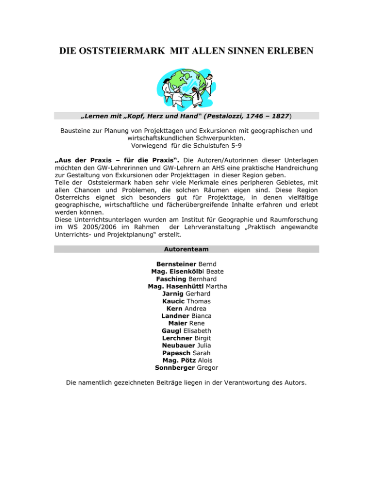 DIE OSTSTEIERMARK MIT ALLEN SINNEN ERLEBEN „Lernen mit „Kopf, Herz und Hand“ (Pestalozzi, 1746 – 1827) Bausteine zur Planung von Projekttagen und Exkursionen mit geographischen und wirtschaftskundlichen Schwerpunkten. Vorwiegend für die Schulstufen 5-9 „Aus der Praxis – für die Praxis“. Die Autoren/Autorinnen dieser Unterlagen möchten den GW-Lehrerinnen und GW-Lehrern an AHS eine praktische Handreichung zur Gestaltung von Exkursionen oder Projekttagen in dieser Region geben. Teile der Oststeiermark haben sehr viele Merkmale eines peripheren Gebietes, mit allen Chancen und Problemen, die solchen Räumen eigen sind. Diese Region Österreichs eignet sich besonders gut für Projekttage, in denen vielfältige geographische, wirtschaftliche und fächerübergreifende Inhalte erfahren und erlebt werden können. Diese Unterrichtsunterlagen wurden am Institut für Geographie und Raumforschung im WS 2005/2006 im Rahmen der Lehrveranstaltung „Praktisch angewandte Unterrichts- und Projektplanung“ erstellt. Autorenteam Bernsteiner Bernd Mag. Eisenkölbl Beate Fasching Bernhard Mag. Hasenhüttl Martha Jarnig Gerhard Kaucic Thomas Kern Andrea Landner Bianca Maier Rene Gaugl Elisabeth Lerchner Birgit Neubauer Julia Papesch Sarah Mag. Pötz Alois Sonnberger Gregor Die namentlich gezeichneten Beiträge liegen in der Verantwortung des Autors. INHALTE 1. 1.1. 1.2. 1.3. 1.4. Unterkünfte Bezirk Hartberg Bezirk Feldbach Bezirk Fürstenfeld Bezirk Radkersburg 2. Geographische und wirtschaftliche Grundlagen der Region (Lehrerinformation) Allgemeine natürliche Grundlagen der Oststeiermark Oststeirischer Vulkanismus Der Geo-Trail von Kapfenstein Hydrogeologische Voraussetzungen der Thermenregion Riedellandschaft – Landschaftsform und Klima Klima, Wetter, Böden der Oststeiermark als Grundlage von Produkten der Region Wetterdaten der Oststeiermark am Beispiel von Feldbach Strukturwandel der Landwirtschaft der Region am Beispiel des Vulkanlandes Strukturwandel der Region am Beispiel dreier oststeirischer Gemeinden Thermen als Wirtschaftsfaktor der Oststeiermark Wein als Wirtschaftsfaktor der Region: Beispiel Traminer Geographisches und Historisches zu Wallfahrten am Beispiel von Pöllauberg Geographisches und Historisches zu Klöstern am Beispiel von Vorau und Pöllau Geographisches und Historisches zu Schlösserstraße Begegnung schaffen: Slawische Gewässer-,Berg- und Siedlungsnamen in der Oststeiermark 2.1. 2.2. 2.3. 2.4. 2.5. 2.6. 2.7. 2.8. 2.9. 2.10. 2.11. 2.12. 2.13. 2.14. 2.15. 3. 3.1. 3.2. 3.3. Geographische Standorte/Aussichtswarten Bezirk Weiz Bezirk Hartberg Bezirk Radkersburg und Feldbach 4. 4.1. 4.2. 4.3. 4.4. 4.5. Natur erleben und Sport betreiben können – Projektmodule Der Geo-Trail von Kapfenstein Der Planetenweg in Feldbach Natur und Sport im Raum Stubenberg –Schielleiten Natur erleben im Tierpark Herberstein Natur eleben und Sport betreiben im Raum Bad Gleichenberg-GnasRiegersburg Kneipp Aktiv Park Mitteres Feistritztal Pöllauer Becken – Naturpark Pöllau Waldlehrpfad Vorau Honiglehrpfad und Hummelnest in Anger Ökopark Hartberg Apfelstrasse: Haus des Apfels 4.6. 4.7. 4.8. 4.9. 4.10. 4.11. 5. 5.1. 5.2. 5.3. 5.4. 5.5. 5.6. 5.7. 5.4. 5.2. Kultur erleben können – Projektmodule Kulm – Keltendorf Villa Rustica Schlösserstraße Schloss Herberstein Riegersburg Schloss Kornberg Schloss/ehemaliges Stift Pöllau Stift Vorau Maria Fieberbründl 6. Den gesellschaftlichen und wirtschaftlichen Wandel mit allen Sinnen erleben Beispiel Thermenorte 6.1. 7. 7.3. 7.4. Sich durch die Produktionsbetriebe und Dienstleistungsbetriebe kosten – Projektmodule Vulcano Schinken – Familie Habel Essigmanufaktur und Schnapsbrennerei – Familie Gölles Schnaps – Alkohol und Sucht (Oberstufe!) Ölmühle Schokolade - Firma Zotter 8. Literatur 7.1.. 7.2. 1. Unterkünfte 1.1. Bezirk Hartberg Jugend- und Familiengästehaus Marktstraße 603 8225 Pöllau Tel: 03335/30011 e-mail: [email protected] www.jfgh.at/poellau Waldhof Muhr Zeil 46 8225 Pöllau Tel: 03335/ 3600 e-mail: [email protected] www.waldhof-muhr.at Gasthaus Pack Josef-Hallamayr-Str. 30 8230 Hartberg Tel:03332/62470 www.gasthof-pack.at e-mail: [email protected] Gasthof Heschl Prätis 3 8225 Pöllau Tel: 03335/ 2244 e-mail: [email protected] Haus Kerngast Zeil 175 8223 Stubenberg am See Tel: 03176/8175 1.2. Bezirk Feldbach (Eisenkölbl) Jugend & Familiengästehaus Gnas - Sport & Erlebniswelt Gästehausleitung:Raimund del Negro 8342 Gnas Nr. 194 Tel.: 03151/51472 e-mail: [email protected] 172 Betten Aufteilung: 172 Betten, 2 – 5 Bettzimmer mit Galerie und getrenntem Bad und WC, Zimmer großteils mit Balkon, kombinierbare Einzel- oder Doppelbetten mit großzügigen Aufenthaltsräumen, Abenteuerzimmer Einrichtungen: Seminarräume, Internet-Café, Stüberl, Sauna, Bar, Fußballplätze, Kunstrasenplatz, teilbare Sporthalle, Erlebnisfoyer, Boulderwand, Kletterwand, Tennishalle, Tennisfreiplätze, Fitnessraum in Zusammenarbeit mit MOVEFIT, Diagnostikraum Das Gästehaus und die Sporteinrichtungen sind zur Gänze rollstuhlfreundlich ausgestattet! Lage: Das Gästehaus liegt am Rande des Ortskerns von Gnas im Grünen mit angrenzendem Sportzentrum. 1.3. Bezirk Fürstenfeld Jugend & Familiengästehaus Thermenland Gästehausleitung: Mag. Peter Meier Burgenlandstraße 15-17 8280 Fürstenfeld Tel.: 03382/52152 e-mail: [email protected] Aufteilung: Komfortable Zimmereinheiten (je 2 Zimmer, Vorraum, DU/WC), Zimmer mit 2-5 Betten Einrichtungen: Seminarräume, Aufenthaltsräume, Café Restaurant Cateringservice, Dart, Tischfußball, Internetterminals, Computerschulungszentrum, Terrassencafé, Tischtennis, Kinderspielplatz, Spielwiese, Busparkplatz, Fahrradraum, ausgestattet mit Original Grander-Technologie Lage: Im Stadtzentrum von Fürstenfeld, mitten im steirischen Thermengebiet, ist unser neues Gästehaus idealer Ausgangspunkt für einen Besuch der zahlreichen Heilund Erlebnisthermen wie der Therme Loipersdorf oder der Therme Bad Blumau, der Stei