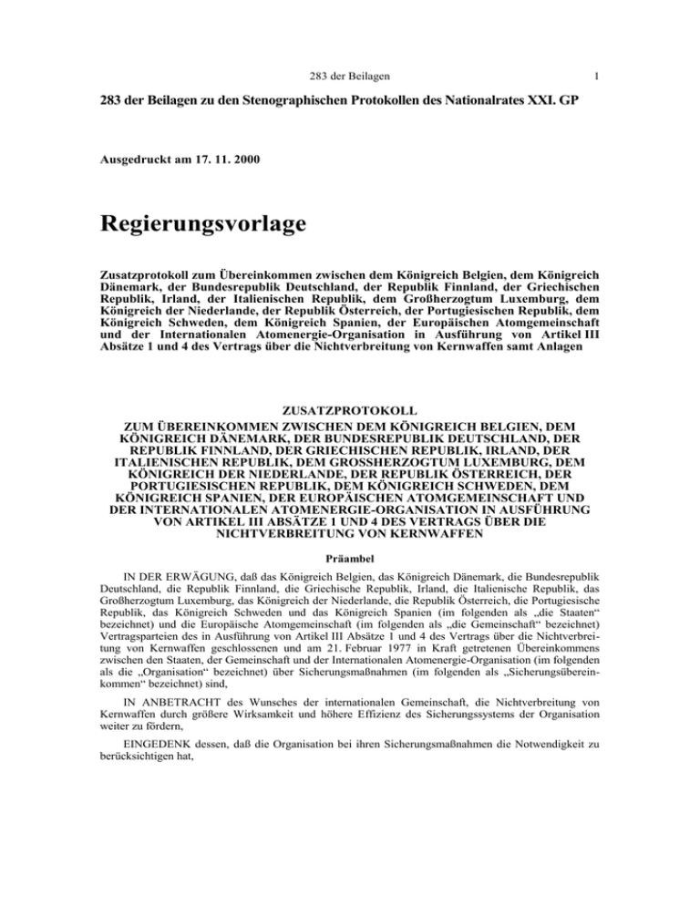 283 der Beilagen 1 283 der Beilagen zu den Stenographischen Protokollen des Nationalrates XXI. GP Ausgedruckt am 17. 11. 2000 Regierungsvorlage Zusatzprotokoll zum Übereinkommen zwischen dem Königreich Belgien, dem Königreich Dänemark, der Bundesrepublik Deutschland, der Republik Finnland, der Griechischen Republik, Irland, der Italienischen Republik, dem Großherzogtum Luxemburg, dem Königreich der Niederlande, der Republik Österreich, der Portugiesischen Republik, dem Königreich Schweden, dem Königreich Spanien, der Europäischen Atomgemeinschaft und der Internationalen Atomenergie-Organisation in Ausführung von Artikel III Absätze 1 und 4 des Vertrags über die Nichtverbreitung von Kernwaffen samt Anlagen ZUSATZPROTOKOLL ZUM ÜBEREINKOMMEN ZWISCHEN DEM KÖNIGREICH BELGIEN, DEM KÖNIGREICH DÄNEMARK, DER BUNDESREPUBLIK DEUTSCHLAND, DER REPUBLIK FINNLAND, DER GRIECHISCHEN REPUBLIK, IRLAND, DER ITALIENISCHEN REPUBLIK, DEM GROSSHERZOGTUM LUXEMBURG, DEM KÖNIGREICH DER NIEDERLANDE, DER REPUBLIK ÖSTERREICH, DER PORTUGIESISCHEN REPUBLIK, DEM KÖNIGREICH SCHWEDEN, DEM KÖNIGREICH SPANIEN, DER EUROPÄISCHEN ATOMGEMEINSCHAFT UND DER INTERNATIONALEN ATOMENERGIE-ORGANISATION IN AUSFÜHRUNG VON ARTIKEL III ABSÄTZE 1 UND 4 DES VERTRAGS ÜBER DIE NICHTVERBREITUNG VON KERNWAFFEN Präambel IN DER ERWÄGUNG, daß das Königreich Belgien, das Königreich Dänemark, die Bundesrepublik Deutschland, die Republik Finnland, die Griechische Republik, Irland, die Italienische Republik, das Großherzogtum Luxemburg, das Königreich der Niederlande, die Republik Österreich, die Portugiesische Republik, das Königreich Schweden und das Königreich Spanien (im folgenden als „die Staaten“ bezeichnet) und die Europäische Atomgemeinschaft (im folgenden als „die Gemeinschaft“ bezeichnet) Vertragsparteien des in Ausführung von Artikel III Absätze 1 und 4 des Vertrags über die Nichtverbreitung von Kernwaffen geschlossenen und am 21. Februar 1977 in Kraft getretenen Übereinkommens zwischen den Staaten, der Gemeinschaft und der Internationalen Atomenergie-Organisation (im folgenden als die „Organisation“ bezeichnet) über Sicherungsmaßnahmen (im folgenden als „Sicherungsübereinkommen“ bezeichnet) sind, IN ANBETRACHT des Wunsches der internationalen Gemeinschaft, die Nichtverbreitung von Kernwaffen durch größere Wirksamkeit und höhere Effizienz des Sicherungssystems der Organisation weiter zu fördern, EINGEDENK dessen, daß die Organisation bei ihren Sicherungsmaßnahmen die Notwendigkeit zu berücksichtigen hat, – daß eine Behinderung der wirtschaftlichen und technologischen Entwicklung in der Gemeinschaft oder der internationalen Zusammenarbeit bei friedlichen nuklearen Tätigkeiten vermieden werden muß, – die geltenden Gesundheits-, Sicherheits-, Objektschutz- und sonstigen Sicherheitsvorschriften und die Rechte des einzelnen zu beachten sind und – alle Vorkehrungen getroffen werden müssen, damit Geschäfts-, Technologie- und Betriebsgeheimnisse sowie andere vertrauliche Informationen, von denen sie Kenntnis erhält, geschützt werden, IN DER ERWÄGUNG, daß die Häufigkeit und die Intensität der in diesem Protokoll beschriebenen Tätigkeiten auf das Mindestmaß zu beschränken sind, das mit dem Ziel wirksamerer und effizienterer Sicherungsmaßnahmen der Organisation vereinbar ist – SIND die Gemeinschaft, die Staaten und die Organisation wie folgt ÜBEREINGEKOMMEN: VERHÄLTNIS ZWISCHEN PROTOKOLL UND SICHERUNGSÜBEREINKOMMEN Artikel 1 Die Bestimmungen des Sicherungsübereinkommens finden auf dieses Protokoll Anwendung, soweit sie relevant und mit diesem Protokoll zu vereinbaren sind. Bei einem Widerspruch zwischen den Bestimmungen des Sicherungsübereinkommens und denen dieses Protokolls gelten letztere. ERTEILUNG VON INFORMATIONEN Artikel 2 a. Jeder Staat übermittelt der Organisation eine Erklärung mit den unter den Ziffern i, ii, iv, ix und x angegebenen Informationen. Die Gemeinschaft übermittelt der Organisation eine Erklärung mit den unter den Ziffern v, vi und vii angegebenen Informationen. Jeder Staat und die Gemeinschaft übermitteln der Organisation eine Erklärung mit den unter den Ziffern iii und viii angegebenen Informationen: i) eine allgemeine Beschreibung und Ortsangabe von Forschungs- und Entwicklungsarbeiten auf dem Gebiet des Kernbrennstoffkreislaufs, die ohne Anwesenheit von Kernmaterial irgendwo durchgeführt werden und die der betreffende Staat finanziert, besonders genehmigt hat oder kontrolliert oder in seinem Namen durchführen läßt; ii) von der Organisation auf Grund erwarteter Wirksamkeits- oder Effizienzverbesserungen angegebene und von dem betreffenden Staat akzeptierte Informationen über die für Sicherungsmaßnahmen relevanten Betriebstätigkeiten in Anlagen und an Orten außerhalb von Anlagen, wo üblicherweise Kernmaterial verwendet wird; iii) eine allgemeine Beschreibung jedes Gebäudes an jedem Standort, einschließlich seiner Verwendung und, sofern dies nicht aus der Beschreibung hervorgeht, seines Inhalts. Die Beschreibung schließt einen Plan des Standorts ein; iv) eine Beschreibung des Umfangs der betrieblichen Tätigkeiten für jeden Ort, an dem die in Anlage I dieses Protokolls genannten Tätigkeiten durchgeführt werden; v) Angabe des Ortes, des Betriebszustands und der geschätzten jährlichen Produktionskapazität von Uranbergwerken und -konzentrierungsanlagen sowie Thoriumkonzentrierungsanlagen in jedem Staat sowie der aktuellen Jahresproduktion dieser Bergwerke und Konzentrierungsanlagen. Die Gemeinschaft gibt auf Ersuchen der Organisation die aktuelle Jahresproduktion eines bestimmten Bergwerks oder einer bestimmten Konzentrierungsanlage an. Für die Erteilung dieser Angaben ist keine detaillierte Kernmaterialbuchführung erforderlich; vi) folgende Informationen über Ausgangsmaterial, das nach Zusammensetzung und Reinheit noch nicht für die Brennstoffherstellung oder die Isotopenanreicherung geeignet ist: a) Menge, 