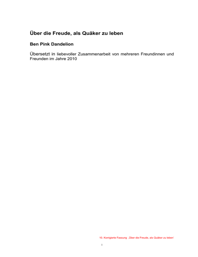 Über die Freude, als Quäker zu leben Ben Pink Dandelion Übersetzt in liebevoller Zusammenarbeit von mehreren Freundinnen und Freunden im Jahre 2010 10. Korrigierte Fassung ‚Über die Freude, als Quäker zu leben’ 1 Vorwort Die Treuhänder des Joseph Rowntree Charitable Trust haben dieses kurze erbauende Werk in Auftrag gegeben, uns zu helfen, jene Art des Quäkertums zu beschreiben und zu feiern, die wir in der britischen Jahresversammlung kennen und praktizieren und die auch andernorts ausgeübt wird. Dies ist eine Form des Quäkertums, die manchmal als 'liberal' oder 'unprogrammiert' bezeichnet wird, um es vom evangelikalen oder programmierten Quäkertum zu unterscheiden, das in anderen Teilen der Welt zu finden ist; Im Grunde jedoch ist dieses Buches für all diejenigen bestimmt, die sich der offenen Andacht als Teil ihrer Quäkererfahrung erfreuen und danach streben, ihr Leben als Freunde zu leben. Es stellt eine Form des Quäkertums dar, die wir zwar kennen und aus der wir viel Kraft, Trost und Herausforderung schöpfen, die jedoch schwer zu beschreiben ist. Wir fühlen uns zueinander hingezogen, näher zu Gott und Gottes Plan, wodurch wir einen sicheren Standpunkt erhalten, ein Verständnis dafür, wie wir unser Leben leben sollen. Was wir miteinander teilen, reicht tiefer als es Worten möglich ist. Es ist jedoch wichtig, diese Worte zu finden - für unser eigenes klares Verständnis, um anderen Einblick zu gewähren und für das Wachstum unserer Andachtsgruppen. Wo wir redegewandt sein sollten, bringen wir oft keinen Ton heraus. In einer religiösen Gesellschaft ohne ausgebildete Pastoren ist es nicht nur Aufgabe einiger weniger sondern eines jeden, zu versuchen, das auszudrücken, was wir über die Natur und die Absicht Gottes wissen und wie wir sie verstehen. Dies ist etwas, wozu wir einander ermutigen müssen. Wir sind zutiefst dankbar für das, was Ben geschaffen hat. Seine Gedanken bringt er uns in seiner eigenen Stimme und den Stimmen der Freunde nahe, mit denen er gesprochen hat. Wir hoffen, dass es weithin gelesen wird und jeden anregt, seine und ihre je eigene Stimme dafür zu finden, engagiert von unseren Überzeugungen zu sprechen, und jene Kraft zu benennen, die wir in unserem Quäkerglauben erfahren, nämlich Gottes Gesandte in der heutigen Welt zu sein. Marion McNaughton Vorsitzende der Stiftung Joseph Rowntree Charitable Trust 10. Korrigierte Fassung ‚Über die Freude, als Quäker zu leben’ 2 Für uns alle Dieses Büchlein in Taschenformat feiert das Quäkertum und bestätigt die wunderbaren Reichtümer der Quäkertradition in Großbritannien und in der ‚liberalen Tradition’ darüber hinaus. Es ist eher ein Buch für Quäker als eines über sie. Es spricht von ‚uns' und ‚wir' und ist für ‚Insider'. Es ist ein erbauendes Buch, für uns. Ich spreche von Gott so, wie Freunde von jeher über das Göttliche gesprochen haben, obwohl einige heute eher andere Begriffe bevorzugen, und ich hoffe, dass diejenigen Leser ‚übersetzen' oder hören können, wo diese Worte herkommen, so wie sie auch einen Wortbeitrag während der Andacht annehmen würden. Ich schreibe als Quäker, der als Atheist/Agnostiker zu den Freunden kam, angezogen vom Friedenszeugnis, ein Ex-Anarchist, glücklich einen anderen Ort zu finden - ohne Oberhäupter und ohne Abstimmungen. Zwei Jahre später hatte ich ein Erlebnis in einem Greyhound-Bus in Amerika, das mir ein Gefühl gab, getragen zu werden, gehalten, und seitdem wurde ich ständig von dem begleitet, was ich Gott nenne, aber von dem ich weiß, dass es sich letztendlich um ein Mysterium handelt und es nicht an mir ist, es allzu eingehend zu ergründen. Damit rückte das Quäkertum für mich von einer vorwiegend politischen Vereinigung an eine Stelle, an der ich mich immer wieder mit dem von Gnade erfüllten Gefühl verbinden konnte, bewacht, behütet und geleitet zu werden. Es hat sich nicht nur intellektuell sondern auch praktisch in mein Glaubensleben eingefügt. Es gibt mir genau die Art von Andacht und die Möglichkeit des Ausdrucks und Dienstes, die meiner eigenen Erfahrung der direkten inneren Begegnung entspricht. Wir alle sind zu einer Aufgabe oder einer Reihe von Aufgaben berufen, jede zu ihrer Zeit, in denen wir die uns von Gott gegebenen spirituellen Gaben nutzen. Das Buch habe ich als Teil meiner Aufgabe geschrieben. Es schöpft aus meiner Erfahrung des Quäkertums, aus allem, was ich während dieser letzten Jahrzehnte gehört und gelesen habe und auch aus rund zwanzig Gesprächen, die ich speziell für dieses Buch geführt habe. (Die Worte dieser Freunde stehen in Anführungszeichen.) Ich hoffe, ich gebe das wahrheitsgetreu wider, was mir anvertraut wurde. Ich fange an mit einem Hinweis darauf, was es bedeutet, uns selbst als Quäker zu bezeichnen. Der zweite Teil ist nachdenklicher im Ton, und ich würdige die Natur der stillen Andacht mit ihrem Wandlungspotenzial, dem Ruf zu mündlichen Beiträgen, der spirituell getragenen Entscheidungsfindung und der Gemeinschaft. Der dritte Teil erforscht den Aufruf, aus unserer direkten Beziehung zu Gott heraus zu handeln – er gilt unserem ‚Zeugnis'. 10. Korrigierte Fassung ‚Über die Freude, als Quäker zu leben’ 3 1: Ich bin Quäker. Ich bin Quäker. Ich bin Teil einer weltweiten Quäkergemeinschaft und ich lebe täglich in diesem Wissen. Es hilft mir dabei, so zu leben, wie ich es möchte. Das Wissen und die Wirklichkeit der Mitgliedschaft in dieser Gemeinschaft beseelt mein Leben und gibt mir die Stärke, die ich benötige, um meinem Glauben getreu zu leben, Mächtigen gegenüber zur Wahrheit zu stehen, der Welt Zeugnis zu geben. Ich fühle, dass ich mich von den Menschen um mich herum unterscheide, und mein Glaube drängt mich, ein anderes Leben zu leben, als es mir von der säkularen Welt vorgeschrieben wird. Während ich die Straße entlang gehe, den Bus oder den Zug nehme, fahre, esse, rede oder einkaufe, folge ich nicht den gesellschaftlichen, sondern den