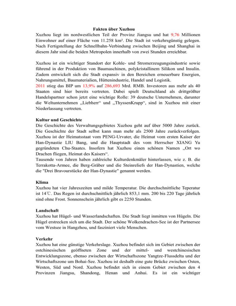 Fakten über Xuzhou Xuzhou liegt im nordwestlichen Teil der Provinz Jiangsu und hat 9,76 Millionen Einwohner auf einer Fläche von 11.258 km². Die Stadt ist verkehrsgünstig gelegen. Nach Fertigstellung der Schnellbahn-Verbindung zwischen Beijing und Shanghai in diesem Jahr sind die beiden Metropolen innerhalb von zwei Stunden erreichbar. Xuzhou ist ein wichtiger Standort der Kohle- und Stromerzeugungsindustrie sowie führend in der Produktion von Baumaschinen, polykristallinem Silikon und Insulin. Zudem entwickelt sich die Stadt expansiv in den Bereichen erneuerbare Energien, Nahrungsmittel, Baumaterialien, Hüttenindustrie, Handel und Logistik. 2011 stieg das BIP um 13,9% auf 286,693 Mrd. RMB. Investoren aus mehr als 40 Staaten sind hier bereits vertreten. Dabei spielt Deutschland als drittgrößter Handelspartner schon jetzt eine wichtige Rolle: 39 deutsche Unternehmen, darunter die Weltunternehmen ,,Liebherr“ und ,,ThyssenKrupp“, sind in Xuzhou mit einer Niederlassung vertreten. Kultur und Geschichte Die Geschichte des Verwaltungsgebietes Xuzhou geht auf über 5000 Jahre zurück. Die Geschichte der Stadt selbst kann man mehr als 2500 Jahre zurückverfolgen. Xuzhou ist der Heimatsstaat vom PENG-Urvater, die Heimat vom ersten Kaiser der Han-Dynastie LIU Bang, und die Hauptstadt des vom Herrscher XIANG Yu gegründeten Chu-Staates. Insofern hat Xuzhou einen schönen Namen ,,Ort wo Drachen fliegen, Heimat des Kaisers“. Tausende von Jahren haben zahlreiche Kulturdenkmäler hinterlassen, wie z. B. die Terrakotta-Armee, die Berg-Gräber und die Steinreliefs der Han-Dynastien, welche die "Drei Bravourstücke der Han-Dynastie" genannt werden. Klima Xuzhou hat vier Jahreszeiten und milde Temperatur. Die durchschnittliche Teperatur ist 14℃. Das Regen ist durchschnittlich jährlich 853,1 mm. 200 bis 220 Tage jährlich sind ohne Frost. Sonnenschein jährlich gibt es 2250 Stunden. Landschaft Xuzhou hat Hügel- und Wasserlandschaften. Die Stadt liegt inmitten von Hügeln. Die Hügel erstrecken sich um die Stadt. Der schöne Wolkendrachen-See ist der Partnersee vom Westsee in Hangzhou, und fasziniert viele Menschen. Verkehr Xuzhou hat eine günstige Verkehrslage. Xuzhou befindet sich im Gebiet zwischen der ostchinesischen geöffneten Zone und der mittel- und westchinesischen Entwicklungszone, ebenso zwischen der Wirtschaftszone Yangtze-Flussdelta und der Wirtschaftszone um Bohai-See. Xuzhou ist deshalb eine gute Brücke zwischen Osten, Westen, Süd und Nord. Xuzhou befindet sich in einem Gebiet zwischen den 4 Provinzen Jiangsu, Shandong, Henan und Anhui. Es ist ein wichtiger Verkehrsknotenpunkt in China für die Transport-Bereiche Eisenbahn, Auto, Schifffahrt, Flug und Ölkanal. Hohen Energieversorgungsgrad Xuzhou ist eine wichtige Kohlenbasis in China und die Strombasis in der Provinz Jiangsu. Xuzhou hat insgesamt mehr als 30 Mineralien. Die verifizierten Kohlenlager sind über 3,9 Mrd. Tonnen. Die Unternehmen produktieren jährlich über 25 Mio. Tonnen Kohlen, und dies sind über 95% in der Provinz Jiangsu. Jährlich kann Xuzhou 5 Mio. Tonnen Gips gewinnen, und dies ist Nr. 1 in Ostchina. Die Solsalzlager mit guter Qualität sind 22 Mrd. Tonnen. Außerdem hat Xuzhou noch viel Eisen, Kalk, Quarzlager, Mamor usw. Xuzhou ist eine staatliche Getreide- und Baumwollebasis und die Produktions- Bearbeitungs- und Exportsbasis für gute Agrarprodukte. Industrie Das Industriesystem in Xuzhou ist komplett: Baumaschinenerzeugung, photovoltaische Industrie und moderner Service sind die Hauptzweige; Lebensmittel, Baumaterialien, chemische Industrie, Schnittholz-Möbel usw. sind vier weitere wichtige Bereiche; Kohlegewinnung, Stromerzeugung, Hütten- und Textilindustrie usw. sind die traditionellen Bereiche; IT, Medizin usw. haben sich ebenfalls schnell entwickelt; Logistik, Geschäft, Handel usw. haben sich bis heute auch schon gut entwickelt. Zum Projekt „Ökologische Modellzone“ Im Zuge der dynamischen Modernisierung Chinas vor allem im Energie- und Umweltsektor entwickeln sich für nordrhein-westfälische Unternehmen immer mehr Kooperationsmöglichkeiten. Eine besondere Chance für den Markteinstieg und den Ausbau von Geschäftsbeziehungen bietet das Projekt „Eco-City Xuzhou“. Umweltschutz, erneuerbare Energien und Energieeffizienz sowie moderne Technologien im Maschinenbau sind die Schwerpunktbranchen, die zu einer erfolgreichen Umstrukturierung der vom Bergbau geprägten Region führen sollen. Auf dem „Xuzhou Ruhr-Industriepark“ werden staatlich geförderte Projekte im industriellen Bereich, aber auch in der Weiterbildung - wie beispielsweise Ingenieurtraining - realisiert. Die Zusammenarbeit mit den Universitäten Aachen, Dortmund, Duisburg-Essen, Wuppertal und der China University of Mining and Technology sowie das geplante „Chinesisch-Deutsche Forschungszentrum über Energien und ökologische Umwelt der Bergbaugebiete“ sollen die Grundlagen für die Erneuerung erarbeiten.
