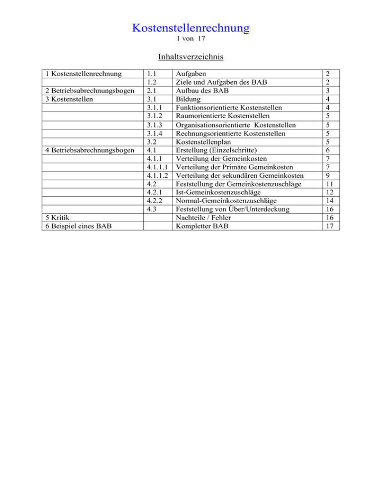 Kostenstellenrechnung 1 von 17 Inhaltsverzeichnis 1 Kostenstellenrechnung 2 Betriebsabrechnungsbogen 3 Kostenstellen 4 Betriebsabrechnungsbogen 5 Kritik 6 Beispiel eines BAB 1.1 1.2 2.1 3.1 3.1.1 3.1.2 3.1.3 3.1.4 3.2 4.1 4.1.1 4.1.1.1 4.1.1.2 4.2 4.2.1 4.2.2 4.3 Aufgaben Ziele und Aufgaben des BAB Aufbau des BAB Bildung Funktionsorientierte Kostenstellen Raumorientierte Kostenstellen Organisationsorientierte Kostenstellen Rechnungsorientierte Kostenstellen Kostenstellenplan Erstellung (Einzelschritte) Verteilung der Gemeinkosten Verteilung der Primäre Gemeinkosten Verteilung der sekundären Gemeinkosten Feststellung der Gemeinkostenzuschläge Ist-Gemeinkostenzuschläge Normal-Gemeinkostenzuschläge Feststellung von Über/Unterdeckung Nachteile / Fehler Kompletter BAB 2 2 3 4 4 5 5 5 5 6 7 7 9 11 12 14 16 16 17 Kostenstellenrechnung 2 von 17 1 Kostenstellenrechnung Kostenstellenrechnung ist die zweite Stufe der Kostenrechnung. Sie dient der prozentualen Zurechnung der in der Kostenartenrechnung nicht unmittelbar zurechenbaren Gemeinkosten zu den verschiedenen Betriebsbereichen, entsprechend der jeweiligen Innanspruchnahme. 1.1 Aufgaben der Kostenstellenrechnung -Verteilung der Gemeinkosten aus der Kostenrechnung - Durchführung der innerbetrieblichen Leistungsverrechnung - Vorbereitung einer verursachungsgerechten Kalkulation - Kontrolle der Wirtschaftlichkeit Kostenstellenrechnung Betriebsabrechnungsbogen Innerbetriebliche Leistungsverrechnung 1.2 Ziele und Aufgaben des Betriebsabrechnungsbogen Im Rahmen der Kostenstellenrechnung wird der Betriebsabrechnungsbogen als Hilfsmittel zur Kostenverteilung benutzt, indem den einzelnen betrieblichen Kostenstellen die dort verursachten Kosten zugerechnet werden. Der BAB enthält in der Vertikalen alle Kostenarten (primäre Einzel- und Gemeinkosten sowie sekundäre Kosten), die den in der Horizontalen aufgeführten Haupt-, Neben- und Hilfskostenstellen zugeführt werden. Außerdem kann mithilfe des BAB durch Vergleich der Soll – und Istkosten der Kostenstellen eine permanente Wirtschaftlichkeitskontrolle durchgeführt werden. Kostenstellenrechnung 3 von 17 2 Betriebsabrechnungsbogen (BAB) Er dient zur tabellarischen Erfassung und Verrechnung der in der Buchhaltung ermittelten Gemeinkosten auf die verursachenden Kostenstellen. Gemeinkosten Dabei handelt es sich um Kosten , die den Kostenträgern nicht unmittelbar zugerechnet werden. Sie fallen für verschiedene Erzeugnisse gemeinsam an. Die Gemeinkosten werden auch als indirekte Kosten bezeichnet. Man unterscheidet in echte Gemeinkosten (nicht zurechenbare) und unechte Gemeinkosten (Kosten die direkt zugerechnet werden könnten aber bei denen diese Zurechnung nicht gewollt ist) . 2.1 Aufbau des Betriebsabrechnungsbogens Der BAB weist in industriellen Unternehmen folgende Grundstruktur auf: Kostenstellen Kostenarten Zahlen AllgeMateFertiVerwal- VerEntder meiner rialgungs- tungstriebs- wicklungsBuchBereich bereich bereich bereich bereich bereich haltung Die in der Buchhaltung ermittelten nicht direkt zuordenbaren Kosten werden auf die einzelnen Kostenstellen entsprechend der jeweiligen Verursachung aufgeteilt. In vertikaler Richtung sind alle Kostenarten mit den jeweiligen Kosten aufgeführt, die dem Unternehmen entstanden sind und keinem Kostenträger direkt zugeordnet werden können, die Gemeinkosten. Meist werden vorab auch die Einzelkosten aufgelistet, da diese die Bezugsgröße für die zu ermittelnden Zuschlagssätze sind. In horizontaler Richtung sind die Kostenstellen als Orte, an denen die zur Leistungserstellung benötigten Güter und Dienstleistungen verbraucht werden aufgeführt. Man unterscheidet hierbei in Haupt- und Hilfskostenstellen. Hauptkostenstellen Sie werden nicht auf andere Kostenstellen weiter verrechnet. Ihre Kosten werden in der Kostenträgerrechnung mithilfe von prozentuellen Zuschlagsätzen den Einzelkosten zugeschlagen. Ihre Kosten werden grundsätzlich auf die Hauptkostenstellen Hilfskostenstellen verrechnet. Sie bekommen im Fertigungsbereich, mitunter auch im Materialbereich vor. Um alle Kosten richtig zurechnen zu können benötigt man also neben den Kostenarten auch Kostenstellen. Kostenstellenrechnung 4 von 17 3 Kostenstellen Als Kostenstellen bezeichnet man die Orte an denen die zur Leistungserstellung benötigten Güter und Dienstleistungen verbraucht werden. Dazu muss man den Betrieb (das Unternehmen) in solche Stellen aufteilen. 3.1 Bildung der Kostenstellen Das hauptsächliche Kriterium ist hierbei die Funktionsorientierung. Die Hauptkostenstellen werden also funktionsorientiert gebildet! Kostenstellen Hauptkostenstellen funktionsorientierte Kostenstellen Organisationsorientierte Kostenstelle Raumorientierte Kostenstellen Rechnungsorientierte Kostenstellen Hilfskostenstellen 3.1.1 Funktionsorientierte Kostenstellen Es ergeben sich folgende Kostenstellen, die auch als Kostenbereiche bezeichnet werden können: Allgemeiner Bereich Hier werden alle Kosten erfasst die für anderen Kostenstellen des Unternehmens Materialbereich Fertigungsbereich Verwaltungsbereich Vertriebsbereich erbracht werden bzw. dem gesamten Unternehmen dienen. Die allgemeinen Kostenstellen werden entsprechend ihrer Inanspruchnahme auf die Hilfskostenstellen und die Hauptkostenstellen verrechnet, z.B. für Beleuchtung, Energie, Heizung. Er dient dazu, das Material - Fertigungsstoffe, Hilfsstoffe, Betriebsstoffe – für den Fertigungsbereich zu beschaffen, zu lagern und zu verteilen. Hier befindet sich die Leistungserbringung des Unternehmens. Daher ist hier eine möglichst detaillierte Aufschlüsselung aller Kosten notwendig! Es empfiehlt sich den Fertigungsbereich in mehrere Hauptkostenstellen zu unterteilen. Die Hilfskostenstellen, deren Kosten für mehrere Hauptkostenstellen der Fertigung gemeinsam anfallen, sind ebenfalls aufzugliedern. Bei der größtmöglichen Aufteilung der Fertigungskostenstellen bis hin zum einzelnen Arbeitsplatz, spricht man von Platzkostenrechnung. Dabei sind spe