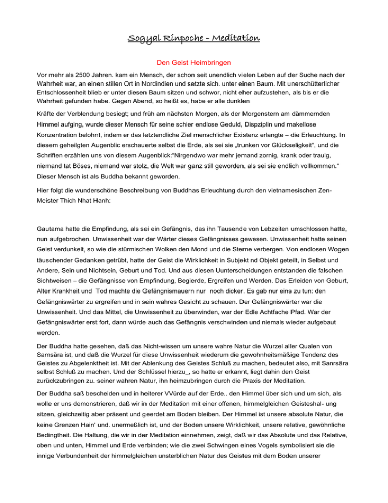 Sogyal Rinpoche - Meditation Den Geist Heimbringen Vor mehr als 2500 Jahren. kam ein Mensch, der schon seit unendlich vielen Leben auf der Suche nach der Wahrheit war, an einen stillen Ort in Nordindien und setzte sich. unter einen Baum. Mit unerschütterlicher Entschlossenheit blieb er unter diesen Baum sitzen und schwor, nicht eher aufzustehen, als bis er die Wahrheit gefunden habe. Gegen Abend, so heißt es, habe er alle dunklen Kräfte der Verblendung besiegt; und früh am nächsten Morgen, als der Morgenstern am dämmernden Himmel aufging, wurde dieser Mensch für seine schier endlose Geduld, Dispziplin und makellose Konzentration belohnt, indem er das letztendliche Ziel menschlicher Existenz erlangte – die Erleuchtung. In diesem geheilgten Augenblic erschauerte selbst die Erde, als sei sie „trunken vor Glückseligkeit“, und die Schriften erzählen uns von diesem Augenblick:“Nirgendwo war mehr jemand zornig, krank oder trauig, niemand tat Böses, niemand war stolz, die Welt war ganz still geworden, als sei sie endlich vollkommen.“ Dieser Mensch ist als Buddha bekannt geworden. Hier folgt die wunderschöne Beschreibung von Buddhas Erleuchtung durch den vietnamesischen ZenMeister Thich Nhat Hanh: Gautama hatte die Empfindung, als sei ein Gefängnis, das ihn Tausende von Lebzeiten umschlossen hatte, nun aufgebrochen. Unwissenheit war der Wärter dieses Gefängnisses gewesen. Unwissenheit hatte seinen Geist verdunkelt, so wie die stürmischen Wolken den Mond und die Sterne verbergen. Von endlosen Wogen täuschender Gedanken getrübt, hatte der Geist die Wirklichkeit in Subjekt nd Objekt geteilt, in Selbst und Andere, Sein und Nichtsein, Geburt und Tod. Und aus diesen Uunterscheidungen entstanden die falschen Sichtweisen – die Gefängnisse von Empfindung, Begierde, Ergreifen und Werden. Das Erleiden von Geburt, Alter Krankheit und Tod machte die Gefängnismauern nur noch dicker. Es gab nur eins zu tun: den Gefängniswärter zu ergreifen und in sein wahres Gesicht zu schauen. Der Gefängniswärter war die Unwissenheit. Und das Mittel, die Unwissenheit zu überwinden, war der Edle Achtfache Pfad. War der Gefängniswärter erst fort, dann würde auch das Gefängnis verschwinden und niemals wieder aufgebaut werden. Der Buddha hatte gesehen, daß das Nicht-wissen um unsere wahre Natur die Wurzel aller Qualen von Samsära ist, und daß die Wurzel für diese Unwissenheit wiederum die gewohnheitsmäßige Tendenz des Geistes zu Abgelenktheit ist. Mit der Ablenkung des Geistes Schluß zu machen, bedeutet also, mit Sanrsära selbst Schluß zu machen. Und der Schlüssel hierzu_, so hatte er erkannt, liegt dahin den Geist zurückzubringen zu. seiner wahren Natur, ihn heimzubringen durch die Praxis der Meditation. Der Buddha saß bescheiden und in heiterer VVürde auf der Erde.. den Himmel über sich und um sich, als wolle er uns demonstrieren, daß wir in der Meditation mit einer offenen, himmelgleichen Geisteshal- ung sitzen, gleichzeitig aber präsent und geerdet am Boden bleiben. Der Himmel ist unsere absolute Natur, die keine Grenzen Hain' und. unermeßlich ist, und der Boden unsere Wirklichkeit, unsere relative, gewöhnliche Bedingtheit. Die Haltung, die wir in der Meditation einnehmen, zeigt, daß wir das Absolute und das Relative, oben und unten, Himmel und Erde verbinden; wie die zwei Schwingen eines Vogels symbolisiert sie die innige Verbundenheit der himmelgleichen unsterblichen Natur des Geistes mit dem Boden unserer flüchtigen, sterblichen Existenz. Meditation zu erlernen, ist das größte Geschenk, das Sie sich in diesem Leben machen können. Denn nur durch Meditation können Sie sich aufmachen zur Entdeckung ihrer wahren Natur. Und nur in ihr werden Sie die Stabilität und das Vertrauen finden, die nötig sind, um gut zu leben und gut zu sterben. Meditation ist der Weg, der zur Erleuchtung führt. Schulung des Geistes Es gibt so viele Möglichkeiten, Meditation vorzustellen, und ich habe sie wohl schon Tausende Male gelehrt, aber jedesmal ist sie wieder anders, jedesmal ist sie unmittelbar und frisch. Glücklicherweise leben wir in einer Zeit, in der überall auf der Welt viele Menschen langsam mit Meditation vertraut werden. Sie findet zunehmend Anerkennung als eine Übung, die kulturelle und religiöse Grenzen überschreitet, und die denen, die üben, einen direkten Kontakt mit der Wahrheit ihres Seins ermöglicht. Meditation ist eine Praxis, die die Dogmen der Religionen überschreitet und gleichzeitig die Essenz aller Religion ist. Normalerweise sind wir von unseren wahren Selbst abgelenkt und vergeuden unser Leben in endlosem Tun. Meditation dagegen ist der Weg, der uns zu uns selbst zurückführt und auf dem wir – jenseits aller Gewohnheitsmuster – unser wahres Wesen erfahren und spüren können. Wir verbringen unser Leben in intensivem und angstvoIlem Kampf, in Greifen, Verlangen und Besitzeitwollen und belasten uns unaufhörlich mit sinnlosen Aktivitäten und Vorhaben. Meditation ist das genaue Gegenteil. Meditation bedeutet, aus unseren „normalen“ Handlungsmustern vollständig auszubrechen, denn sie ist ein Zustand ohne a l l e Sorgen und Bedenken, in dem es keinerlei Wettbewerb gibt, keine Gier, irgend etwas ergreifen oder besitzen zu wollen, keinen angstvollen Kampf und keinen Zwang, irgend etwas erreichen zu müssen. Meditation ist ein Zustand ohne Ehrgeiz, in dem es weder Annehmen noch ablehnen gibt, weder Hoffnung noch Furcht; ein Zustand, in dem sich langsam alle Emotionen und Konzepte, die uns schon. so lange gefangengehaltenhalten, auflösen in den Raum natürlicher Einfachheit. Die buddhistischen Meditationsmeister wissen, wie flexibel und beeinflußbar der Geist ist. Wenn wir ihn schulen, ist alles möglich. Tatsächlich sind wir ja bereits perfekt von und für Samsära trainiert: Wir haben Übung darin eifersüchtig zu werden, festzuhalten, ängstlich, traurig, verzweifelt und gierig zu sein, wir sind geübt., mit Ärger auf alles zu reagieren. w