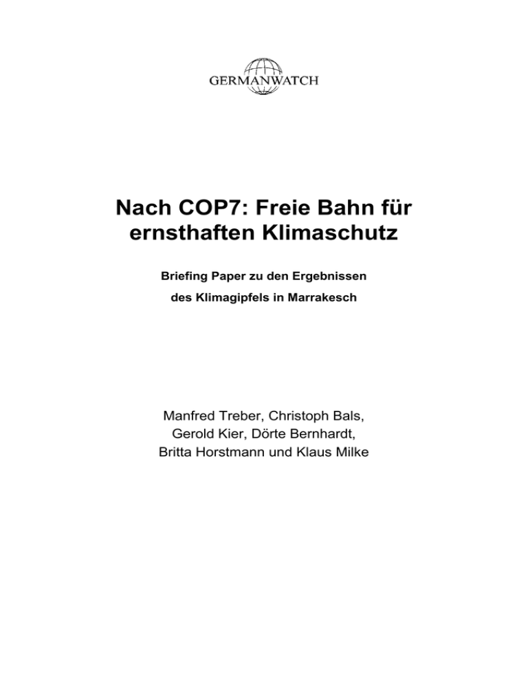 Nach COP7: Freie Bahn für ernsthaften Klimaschutz Briefing Paper zu den Ergebnissen des Klimagipfels in Marrakesch Manfred Treber, Christoph Bals, Gerold Kier, Dörte Bernhardt, Britta Horstmann und Klaus Milke 2 GERMANWATCH Briefing Paper zu den Ergebnissen des Klimagipfels in Marrakesch GERMANWATCH Briefing Paper zu den Ergebnissen des Klimagipfels in Marrakesch 3 Inhalt Die Rahmenbedingungen seit Anfang 2001 ........................................................................ 4 Die Siebte Vertragsstaatenkonferenz in Marrakesch: Bedeutung und allgemeiner Auftrag ................................................................................................................................. 4 Die Hauptstreitpunkte, die Ausgestaltung der offenen Punkte des Protokolls und Forderungen von GERMANWATCH ................................................................................... 5 Die Schwächen des Kyoto-Protokolls .............................................................................................................5 Generelle Fragen der Kyoto-Mechanismen ....................................................................................................6 Clean Development Mechanism .....................................................................................................................6 Atomkraft im CDM...........................................................................................................................................7 Heiße Luft (Hot Air) .........................................................................................................................................7 Senken (Sinks) ...............................................................................................................................................8 Flugverkehr .....................................................................................................................................................8 Erfüllungskontrolle: Haftung und Sanktionen bei Nichterreichen der Ziele (Liability / NonCompliance-Mechanismus) ............................................................................................................................9 Finanzierung und weitere Anliegen von Entwicklungsländern ......................................................................10 Zweite Verpflichtungsperiode (Second Commitment Period) .......................................................................10 Weitere Ergebnisse von COP7 .....................................................................................................................11 Kriterien zur Bewertung ................................................................................................................................11 Spannungsfeld zwischen Klimaschutz und WTO .............................................................. 12 Jetzt kann das Kyoto-Protokoll in Kraft treten .................................................................... 13 Die Vorgeschichte: von Rio bis Kyoto ................................................................................ 14 Internet-Links "Das Kyoto-Protokoll: Ohne Alternative und voller Risiken". Briefing Paper zum 5. UN-Klimagipfel im Oktober 1999 in Bonn. Hier werden einige noch heute aktuelle Themen und Zusammenhänge vertieft behandelt. www.germanwatch.org/rio/bpcop5.htm "Klima, Politik und Wissenschaft – der internationale Klimaverhandlungsprozess und der Beitrag der Wissenschaften", September 2000. Gibt einen kurzen Überblick über die seit über zehn Jahren laufenden internationalen Klimaverhandlungen. www.germanwatch.org/rio/bpsb13.htm "Globaler Klimawandel: Neue und stärkere Evidenz", Oktober 2001. Enthält zentrale Passagen der Summaries for Policymakers (Zusammenfassungen für Entscheidungsträger) des IPCC Third Assessment Report (Dritter Sachstandsbericht) in deutscher Übersetzung, jeweils gefolgt von einem GERMANWATCHKommentar. www.germanwatch.org/rio/bpipcc01.htm Matthias Buck / Roda Verheyen, Juli 2001: International Trade Law and Climate Change – A Positive Way Forward. Herausgeber: Friedrich-Ebert-Stiftung. http://library.fes.de/pdf-files/stabsabteilung/01052.pdf GERMANWATCH e.V. · Kaiserstr. 201 · D-53113 Bonn Tel.: ++49 / (0)228 / 60 49 2-0 · Fax: ++49 / (0)228 / 60 49 2-19 E-mail: [email protected], Internet: www.germanwatch.org Das vorliegende Briefing Paper kann in seiner aktuellen Fassung unter www.germanwatch.org/rio/bpcop7.htm abgerufen werden. Stand: 21.2.02 Dieses Projekt wird finanziell vom Bundesumweltministerium und vom Umweltbundesamt gefördert. Die Förderer übernehmen keine Gewähr für die Richtigkeit, die Genauigkeit und Vollständigkeit der Angaben sowie für die Beachtung privater Rechte Dritter. Die geäußerten Ansichten und Meinungen müssen nicht mit denen der Förderer übereinstimmen. 4 GERMANWATCH Briefing Paper zu den Ergebnissen des Klimagipfels in Marrakesch Die Rahmenbedingungen seit Anfang 2001 Folgende wichtige Entwicklungen der jüngsten Zeit beeinflussten den Klimagipfel von Marrakesch. Die weltweit höchste wissenschaftliche Autorität in Klimafragen, das Intergovernmental Panel on Climate Change (IPCC) hat im Laufe des Jahres 2001 seinen jüngsten, den Dritten Sachstandsbericht (TAR) vorgelegt. Er bekräftigt und verschärft die vorherigen Aussagen zum bevorstehenden Klimawandel und legt in ihren Auswirkungen nach oben korrigierte Projektionen über wesentliche Indikatoren der bis zum Jahr 2100 zu erwartenden Klimaänderung (wie Weltmitteltemperatur) vor. Allerdings stellt der TAR fest, dass der Fortschritt hinsichtlich einsatzreifer Techniken zur Verminderung der Emissionen schneller vonstatten ging, als 5 Jahre vorher erwartet worden war, so dass die Emissionsreduktion gegenüber den vorherigen Aussagen deutlich kostengünstiger ausfällt. Die EU-Kommission legte noch vor dem Klimagipfel in Marrakesch ein "Ratifikationspaket" zum KyotoProtokoll vor. Ein wichtiger Besta