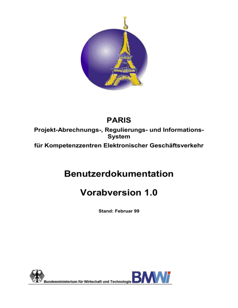 PARIS Projekt-Abrechnungs-, Regulierungs- und InformationsSystem für Kompetenzzentren Elektronischer Geschäftsverkehr Benutzerdokumentation Vorabversion 1.0 Stand: Februar 99 PARIS ist ein System zur Unterstützung und Rationalisierung von Verwaltungs-, Abrechnungs- und Dokumentationsvorgängen in Kompetenzzentren für den Elektronischen Geschäftsverkehr. Projektrelevante Daten (Kontakte zu Firmen und Institutionen, Beratungsaktivitäten, Veranstaltungen, etc.) werden in eine Projektdatenbank des jeweiligen Kompetenzzentrums eingetragen und können flexibel ausgewertet werden. Für den Projektträger wichtige Subsets der Daten können schnell und einfach gewonnen und dem Projektträger zugestellt werden. Das Programmsystem PARIS wurde von der Berufsakademie Heidenheim im Rahmen der Initiative "Kompetenzzentren für Elektronischen Geschäftsverkehr zur Unterstützung kleiner und mittlerer Unternehmen sowie des Handwerks" des Bundesministeriums für Wirtschaft und Technologie (BMWi)" entwickelt (Fördermaßnahme). Das System steht daher allen Kompetenzzentren sowie GMD-PTF und BMWi kostenlos zur Verfügung. Eine weitere Anwendung und Verbreitung des ausgelieferten Systems ist nur nach vorheriger Zustimmung durch den Zuwendungsgeber zulässig. Inhalt: 1. PARIS-Systemvarianten........................................................................................... 2 2 Systemvoraussetzungen ......................................................................................... 2 2.1 Offline-Version: ....................................................................................................... 2 2.2 Online-Version ........................................................................................................ 2 3 Installation ................................................................................................................ 3 3.1 Offline-Version: ....................................................................................................... 3 3.2 Online-Version ........................................................................................................ 3 4 Konfiguration des Systems und Programmstart ................................................... 4 4.1 Programmstart ........................................................................................................ 4 4.2 Eingabe und Verwaltung von Stammdaten ............................................................. 5 4.2.1 auf die Struktur des Kompetenzzentrums bezogene Daten ............................. 5 4.2.2 ressourcenbezogene Daten ............................................................................. 6 4.2.3 Kategorien in Formular-Auswahlfeldern ........................................................... 6 4.2.4 Aktivitätsklassen .............................................................................................. 7 5 Eingabe von Aktivitätsdaten.................................................................................... 7 5.1 Beratung einer Firma neu eintragen........................................................................ 9 5.2 Vortrag auf einer Veranstaltung des Kompetenzzentrums neu eintragen .............. 10 5.3 Vortrag bei einer Firma oder einer externen Veranstaltung bearbeiten ................. 11 5.4 Eingabe von sonstigen Aktivitäten des Kompetenzzentrums ................................ 12 6 Auswertungen ........................................................................................................ 13 6.1 Einnahmen-/Kostenstrukturen............................................................................... 13 6.2 Erinnerungsliste .................................................................................................... 13 7 Datenimport und -export........................................................................................ 14 7.1 Daten-Export ........................................................................................................ 14 7.2 Daten-Import......................................................................................................... 14 7.3 Daten-Import von Alt-Datenbeständen .................................................................. 15 8 Ansprechspartner, Hotline .................................................................................... 15 Anlage 1: PARIS-Datenmodell ...................................................................................... 16 68619098 Seite 2 von 18 Stand: 14.05.2016 07:29:00 1. PARIS-Systemvarianten PARIS besteht aus folgenden Systemvarianten, die alternativ lauffähig sind: ● Offline-Version: MS ACCESS97-Anwendung mit komfortablen Eingabeformularen und auf die Bedürfnisse aller Kompetenzzentren abgestimmten Auswertungen (Formulare, Berichte, Listen). Die Anwendung enthält eine Funktionalität, die es erlaubt, innerhalb eines Kompetenzzentrums dezentral geführte Datenbestände zu aggregieren, die in verschiedenen Standorten dezentral geführt werden. Diese Anwendung ist vom einzelnen Kompetenzzentrum leicht im Hinblick auf zusätzliche zentrenspezifische Anforderungen anpaßbar bzw. erweiterbar (zusätzliche Daten, zusätzliche Auswertungen, Übernahme von Alt-Datenbeständen). ● Online-Version: Client-Server-Anwendung, wobei die Projektdaten auf einer ServerDatenbank des Kompetenzzentrums liegen und über Internet gepflegt werden können. Die Auswertung erfolgt mit einem Auswertungs- und Dokumentationsprogramm unter MS ACCESS, das über ODBC auf die Server-Datenbank zugreift, d.h. das Auswertungsprogramm kann von beliebiger Stelle aus über das Internet auf die Daten zugreifen. Die Online-Version liegt als Prototyp für zwei System-Landschaften vor: - LINUX, Apache-Webserver, Postgres-DB mit PHP/FI-CGI: Die Daten werden über HTML-Seiten mit integrierten PHP/FI-Skripten mittels üblichen Browsern in die Postgres-Datenbank eingepflegt; - WIN NT 4, MS ACCESS, IIS/ASP: Die Daten werden über Active Ser
