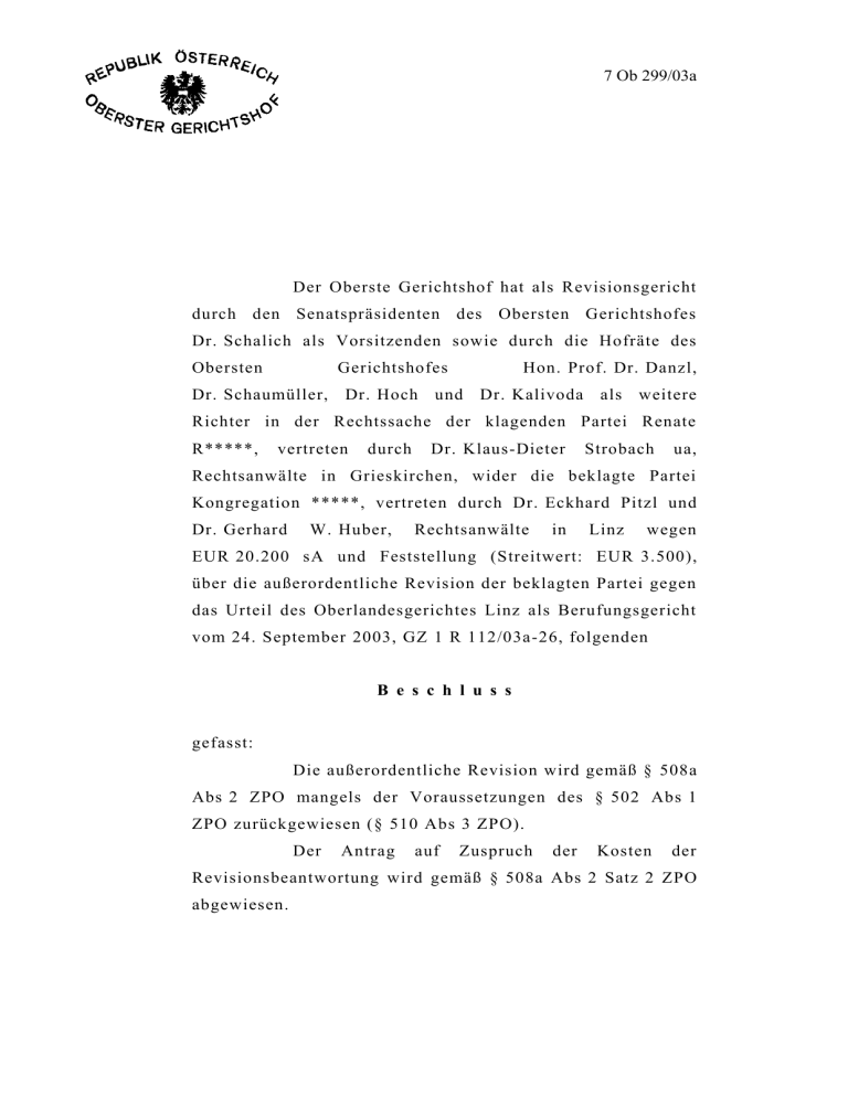 7 Ob 299/03a Der Oberste Gerichtshof hat als Revisionsgericht durch den Senatspräsidenten des Obersten Gerichtshofes Dr. Schalich als Vorsitzenden sowie durch die Hofräte des Obersten Gerichtshofes Dr. Schaumüller, Hon. Prof. Dr. Danzl, Dr. Hoch und Dr. Kalivoda als weitere Richter in der Rechtssache der klagenden Partei Renate R*****, vertreten durch Dr. Klaus-Dieter Strobach ua, Rechtsanwälte in Grieskirchen, wider die beklagte Partei Kongregation *****, vertreten durch Dr. Eckhard Pitzl und Dr. Gerhard W. Huber, Rechtsanwälte in Linz wegen EUR 20.200 sA und Feststellung (Streitwert: EUR 3.500), über die außerordentliche Revision der beklagten Partei gegen das Urteil des Oberlandesgerichtes Linz als Berufungsgericht vom 24. September 2003, GZ 1 R 112/03a-26, folgenden B e s c h l u s s gefasst: Die außerordentliche Revision wird gemäß § 508a Abs 2 ZPO mangels der Voraussetzungen des § 502 Abs 1 ZPO zurückgewiesen (§ 510 Abs 3 ZPO). Der Antrag auf Zuspruch der Kosten der Revisionsbeantwortung wird gemäß § 508a Abs 2 Satz 2 ZPO abgewiesen. 2 7 Ob 299/03a B e g r ü n d u n g : Zur ärztlichen Aufklärungspflicht liegt eine umfangreiche Rechtsprechung des Obersten Gerichtshofes vor (RIS-Justiz RS0026340; RS0026581; RS0114848 RS0026499; uva), deren RS0026578; Grundsätze vom Berufungsgericht richtig wiedergegeben wurden. Der konkrete Umfang dieser Pflicht ist - wie die ao Revision selbst festhält - eine Frage des Einzelfalles; sie hängt von den jeweiligen Umständen ab und stellt daher regelmäßig keine Rechtsfrage von erheblicher Bedeutung dar (RIS -Justiz RS0026529 [T3, T4 und T18]; zuletzt: 5 Ob 162/03i und 9 Ob 30/03g). Die Zulassungsbeschwerde wird damit begründet, dass zur Frage, ob ein Arzt eine Patientin ungefragt über die theoretische Möglichkeit eines nicht indizierten Eingriffs aufzuklären hat, in Österreich noch keine Rechtsprechung vorliege. Tatsächlich hat der Oberste Gerichtshof jedoch gerade zum angesprochenen "Themenkreis" (medizinisch nicht indizierter Kaiserschnitt) bereits festgehalten, aus der Entscheidung 10 Ob 107/02m sei abzuleiten, „dass - mangels Indikation für eine Kaiserschnittentbindung - der Patientin nicht ungefragt zu erläutern ist, welche Behandlungs-(Entbindungs-)methoden theoretisch in Betracht kommen und was für und gegen die eine oder andere dieser Methoden spricht, solange der Arzt eine Methode anwendet, die dem medizinischen Standard genügt" (E v 8. 7. 2003, 5 Ob 162/03i; Senat). Hervorhebungen durch den erkennenden 3 7 Ob 299/03a Im vorliegenden Fall geht es aber gar nicht um eine ungefragte Erläuterung bei Indikation . Das gegenteilige fehlender medizinischer Zitat der ao Revision ist unvollständig, weil das Erstgericht an der angegebenen Stelle (Seite 3 des Ersturteils) tatsächlich festgehalten hat, dass eine medizinische Indikation "jedenfalls nicht wegen auffälliger kindlicher Herzaktionen oder wegen des mangelnden Geburtsfortschrittes" gegeben war. Nach den weiteren Feststellungen ist jedoch davon auszugehen, dass bekannt (bzw durch jedenfalls erforderliche Untersuchungen feststellbar) war, dass sich das Kind nicht in einer normalen Lage befand (sondern eine „verkehrt rotierte Hinterhaupthaltung", bei nur 20 %iger Wahrscheinlichkeit, dass sich das Kind vor der Geburt rechtzeitig in eine normale Lage dreht, vorlag); und dass diese Lageanomalie eine erhöhte Platzbeanspruchung im Bereich des Beckenausganges und damit ein erhöhtes Risiko für einen Dammriss (insbes auch für einen solchen dritten Grades) bewirkt hat ; weiters dass die Klägerin weder über dieses erhöhte Risiko (Lageanomalie), noch über die Folgen eines dadurch (möglicherweise) drohenden Dammrisses oder über die Möglichkeit, einen solchen durch einen Kaiserschnitt (bei dadurch insgesamt aber höherem Risiko - insbes Mortalitätsrisiko - für die Klägerin) sicher zu vermeiden, aufgeklärt wurde; sowie davon, dass das erhöhte Risiko bei der Geburt eines Kindes aufgrund seiner Lageanomalie (auch) als typisches, ja sogar erhöhtes Risiko für einen Dammriss dritten Grades einzuschätzen ist (Seite 4 und 7 des Ersturteils bzw Seite 8 der Berufungsentscheidung). Dazu hat das Berufungsgericht ua ausgeführt, dass die Beklagte verpflichtet gewesen wäre, diese Umstände gegenüber der Klägerin offenzulegen und sie (entsprechend) 4 7 Ob 299/03a aufzuklären. Ein solche Verpflichtung bestehe nämlich insbes dann, wenn die Risken den nicht informierten Patienten überraschen und bei Verwirklichung seine Lebensführung erheblich belasten können, zumal sie der Patient nicht mit dem (unterbliebenen) Eingriff in Verbindung bringe; insoweit sprächen die körperlichen und gesundheitlichen Beeinträchtigungen der Klägerin bei der in Rede stehenden Geburt laut Seite 4 des Ersturteils (Dammriss dritten Grades [= Durchriss auch des äußeren Schließmuskels des Afters], wobei bisher keine einwandfreie Wiederherstellung der Funktion des Schließmuskels erzielt werden konnte) für sich. Diese berufungsgerichtliche Beurteilung des Einzelfalles bewegt sich im Rahmen der Grundsätze der Rechtsprechung des Obersten Gerichtshofes und enthält keine auffallende Fehlbeurteilung, die der Oberste Gerichtshof im Interesse der Rechtssicherheit wahrnehmen müsste: Eine Pflicht zu Aufklärung besteht nämlich nicht nur dann, wenn Durchführung die einer Einwilligung ärztlichen des Patienten Heilbehandlung zur erreicht werden soll, sondern auch dann, wenn dem Patienten eine sachgerechte Entscheidung zu ermöglichen ist, ob er eine (weitere) ärztliche Behandlung unterlassen kann (RIS -Justiz RS0026578; zuletzt: 10 Ob 24/00b [Behandlungsfehler durch unterlassen der sog therapeutischen Aufklärung ]). Außerdem ist die ärztliche Aufklärungspflicht bei Vorliegen einer typischen Gefahr nach stRsp sogar verschärft (RIS -Justiz RS0026340; RS0026581 [T1; T2; T5]), wobei sich die Typizität nicht aus der Komplikationshäufigkeit, sondern daraus ergibt, dass das Risiko spez