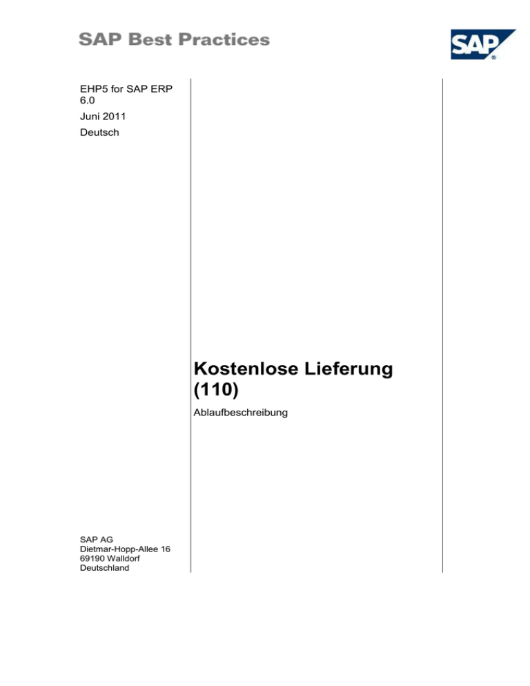 EHP5 for SAP ERP 6.0 Juni 2011 Deutsch Kostenlose Lieferung (110) Ablaufbeschreibung SAP AG Dietmar-Hopp-Allee 16 69190 Walldorf Deutschland SAP Best Practices Kostenlose Lieferung (110): AB Copyright © 2011 SAP AG. Alle Rechte vorbehalten. Weitergabe und Vervielfältigung dieser Publikation oder von Teilen daraus sind, zu welchem Zweck und in welcher Form auch immer, ohne die ausdrückliche schriftliche Genehmigung durch SAP AG nicht gestattet. In dieser Publikation enthaltene Informationen können ohne vorherige Ankündigung geändert werden. Die von SAP AG oder deren Vertriebsfirmen angebotenen Softwareprodukte können Softwarekomponenten auch anderer Softwarehersteller enthalten. Microsoft, Windows, Excel, Outlook und PowerPoint sind eingetragene Marken der Microsoft Corporation. IBM, DB2, DB2 Universal Database, System i, System i5, System p, System p5, System x, System z, System z10, System z9, z10, z9, iSeries, pSeries, xSeries, zSeries, eServer, z/VM, z/OS, i5/OS, S/390, OS/390, OS/400, AS/400, S/390 Parallel Enterprise Server, PowerVM, Power Architecture, POWER6+, POWER6, POWER5+, POWER5, POWER, OpenPower, PowerPC, BatchPipes, BladeCenter, System Storage, GPFS, HACMP, RETAIN, DB2 Connect, RACF, Redbooks, OS/2, Parallel Sysplex, MVS/ESA, AIX, Intelligent Miner, WebSphere, Netfinity, Tivoli und Informix sind Marken oder eingetragene Marken der IBM Corporation. Linux ist eine eingetragene Marke von Linus Torvalds in den USA und anderen Ländern. Adobe, das Adobe-Logo, Acrobat, PostScript und Reader sind Marken oder eingetragene Marken von Adobe Systems Incorporated in den USA und/oder anderen Ländern. Oracle ist eine eingetragene Marke der Oracle Corporation. UNIX, X/Open, OSF/1 und Motif sind eingetragene Marken der Open Group. Citrix, ICA, Program Neighborhood, MetaFrame, WinFrame, VideoFrame und MultiWin sind Marken oder eingetragene Marken von Citrix Systems, Inc. HTML, XML, XHTML und W3C sind Marken oder eingetragene Marken des W3C®, World Wide Web Consortium, Massachusetts Institute of Technology. Java ist eine eingetragene Marke von Sun Microsystems, Inc. JavaScript ist eine eingetragene Marke der Sun Microsystems, Inc., verwendet unter der Lizenz der von Netscape entwickelten und implementierten Technologie. SAP, R/3, SAP NetWeaver, Duet, PartnerEdge, ByDesign, SAP BusinessObjects Explorer, StreamWork und weitere im Text erwähnte SAP-Produkte und -Dienstleistungen sowie die entsprechenden Logos sind Marken oder eingetragene Marken der SAP AG in Deutschland und anderen Ländern. Business Objects und das Business-Objects-Logo, BusinessObjects, Crystal Reports, Crystal Decisions, Web Intelligence, Xcelsius und andere im Text erwähnte Business-Objects-Produkte und -Dienstleistungen sowie die entsprechenden Logos sind Marken oder eingetragene Marken der Business Objects Software Ltd. Business Objects ist ein Unternehmen der SAP AG. Sybase und Adaptive Server, iAnywhere, Sybase 365, SQL Anywhere und weitere im Text erwähnte Sybase-Produkte und -Dienstleistungen sowie die entsprechenden Logos sind Marken oder eingetragene Marken der Sybase Inc. Sybase ist ein Unternehmen der SAP AG. Alle anderen Namen von Produkten und Dienstleistungen sind Marken der jeweiligen Firmen. Die Angaben im Text sind unverbindlich und dienen lediglich zu Informationszwecken. Produkte können länderspezifische Unterschiede aufweisen. In dieser Publikation enthaltene Informationen können ohne vorherige Ankündigung geändert werden. Die vorliegenden Angaben werden von SAP AG und ihren Konzernunternehmen („SAP-Konzern“) bereitgestellt und dienen ausschließlich Informationszwecken. Der SAP-Konzern übernimmt keinerlei Haftung oder Garantie für Fehler oder Unvollständigkeiten in dieser Publikation. Der SAP-Konzern steht lediglich für Produkte und Dienstleistungen nach der Maßgabe ein, die in der Vereinbarung über die jeweiligen Produkte und Dienstleistungen ausdrücklich geregelt ist. Aus den in dieser Publikation enthaltenen Informationen ergibt sich keine weiterführende Haftung. © SAP AG Seite 2 von 25 SAP Best Practices Kostenlose Lieferung (110): AB Symbole Symbol Bedeutung Achtung Beispiel Hinweis Empfehlung Syntax Externer Prozess Alternativer Geschäftsprozess/Wahlmöglichkeit Typografische Konventionen Format Beschreibung Beispieltext Wörter oder Zeichen, die von der Oberfläche zitiert werden. Dazu gehören Feldbezeichner, Bildtitel, Drucktastenbezeichner sowie Menünamen, Menüpfade und Menüeinträge. Verweise auf andere Dokumentationen Beispieltext hervorgehobene Wörter oder Ausdrücke im Fließtext, Titel von Grafiken und Tabellen BEISPIELTEXT Namen von Systemobjekten Dazu gehören Reportnamen, Programmnamen, Transaktionscodes, Tabellennamen und einzelne Schlüsselbegriffe einer Programmiersprache, die von Fließtext umrahmt sind, wie z. B. SELECT und INCLUDE. Beispieltext Ausgabe auf der Oberfläche Dazu gehören Datei- und Verzeichnisnamen und ihre Pfade, Meldungen, Namen von Variablen und Parametern, Quelltext und Namen von Installations-, Upgrade- und Datenbankwerkzeugen. BEISPIELTEXT Tasten auf der Tastatur, wie z. B. die Funktionstaste F2 oder die StrgTaste. Beispieltext Exakte Benutzereingabe. Dazu gehören Wörter oder Zeichen, die Sie genau so in das System eingeben müssen, wie es in der Dokumentation angegeben ist. <Beispieltext> Variable Benutzereingabe. Die Wörter und Zeichen in spitzen Klammern müssen Sie durch entsprechende Eingaben ersetzen, bevor Sie sie in das System eingeben. © SAP AG Seite 3 von 25 SAP Best Practices Kostenlose Lieferung (110): AB Inhalt 1 Einsatzmöglichkeiten .............................................................................................................. 5 2 Voraussetzungen .................................................................................................................... 5 2.1 Stamm- und Organisationsdaten .................................................................................... 5 2.2 Vorau