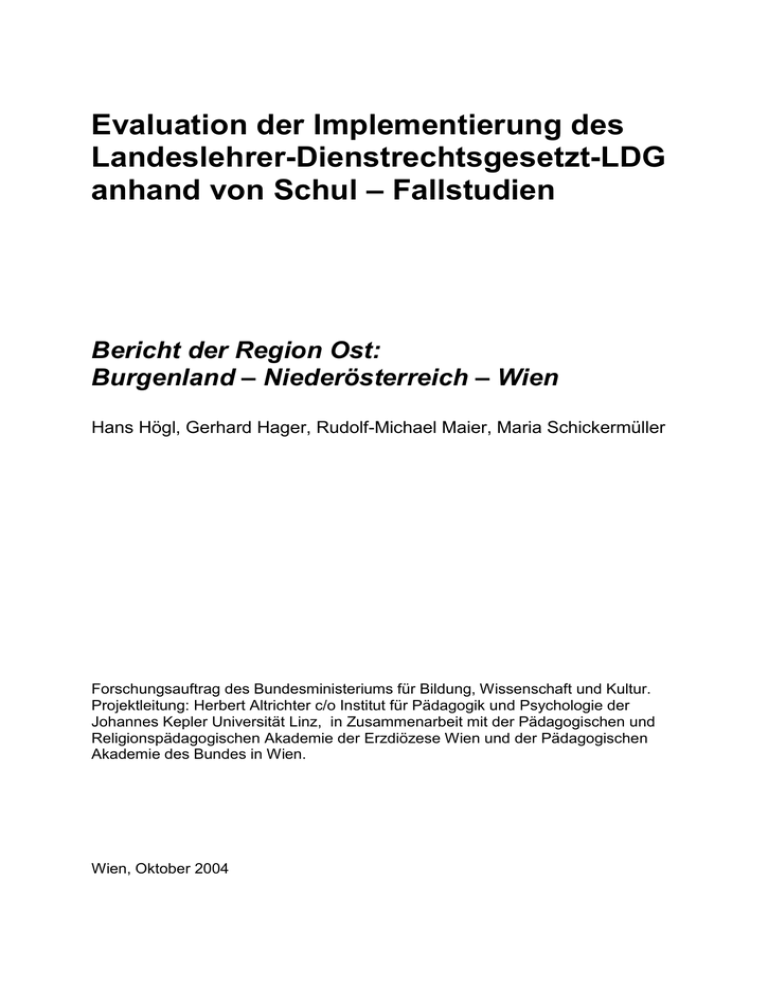 Evaluation der Implementierung des Landeslehrer-Dienstrechtsgesetzt-LDG anhand von Schul – Fallstudien Bericht der Region Ost: Burgenland – Niederösterreich – Wien Hans Högl, Gerhard Hager, Rudolf-Michael Maier, Maria Schickermüller Forschungsauftrag des Bundesministeriums für Bildung, Wissenschaft und Kultur. Projektleitung: Herbert Altrichter c/o Institut für Pädagogik und Psychologie der Johannes Kepler Universität Linz, in Zusammenarbeit mit der Pädagogischen und Religionspädagogischen Akademie der Erzdiözese Wien und der Pädagogischen Akademie des Bundes in Wien. Wien, Oktober 2004 Inhaltsverzeichnis A Vergleichende Analyse der Schulfallstudien ...................... 1 Vergleichende Analyse der Schulfallstudien der Bundesländer Burgenland, Niederösterreich und Wien .................................................................................... 1 1 Einführung ...................................................................................................... 1 1.1 Hinführung ................................................................................................. 1 1.2 Methodische Vorbemerkungen .................................................................. 2 1.3 Differenzen der Wahrnehmung ................................................................. 2 1.4 Differenz in Perspektiven ........................................................................... 3 2 Vorinformation zur Einführung des LDG neu .................................................. 4 3 Umsetzung vor Ort - Implementation............................................................ 10 3.1 Prozess und Form der Dienstaufteilung .................................................. 10 3.2 Verhandlungsergebnis der Dienstaufteilung ............................................ 14 3.3 Adaptierung der Dienstvereinbarung im Laufe des Schuljahres ............. 19 Rolle der Schulleitung „Selbst- und Fremdbild“ ............................................ 20 4 4.1 Veränderungen der Leiterrolle ................................................................. 20 4.2 Stil der Kontrolle und Bezug: Leitung - Lehrkräfte .................................. 21 4.3 Schulentwicklung, Autonomie und Schulaufsicht ..................................... 25 5 Die neue Tätigkeitsstruktur der Lehrkräfte ................................................... 29 5.1 Änderung der Arbeitszeit ........................................................................ 30 5.2 Einfluss auf Arbeitszufriedenheit und Engagement ............................... 31 5.3 Eigenverantwortung, Teamarbeit und das Miteinander............................ 33 6 Auswirkungen des LDG und seiner Umsetzung in den Schulen .................. 35 6.1 Fortbildung ............................................................................................... 35 6.2 Einbindung der Eltern .............................................................................. 36 7 Bilanz und Perspektiven ............................................................................... 37 7.1 Lehrerselbstbild und soziales Ansehen.................................................... 37 7.2 Fairness und Gerechtigkeit ...................................................................... 44 7.3 Autonomie und Flexibilität ........................................................................ 47 7.4 8 Stärken des LDG neu .............................................................................. 47 Schwächen, Änderungsideen und offene Fragen ........................................ 48 8.1 9 Im Gesetz selbst ...................................................................................... 48 Abgeltung ..................................................................................................... 54 9.2 Umsetzung des Gesetzes am Schulort ................................................... 55 9.3 Stärke – Schwäche - Relationen des LDG............................................... 56 10 Resumé – im Rückgriff auf die Projektziele ................................................. 60 10.1 "Gerechte" Verteilung der Aufgaben des Bereichs C ............................... 60 10.2 Dokumentation der Aufgaben und ihrer Durchführung ............................ 61 10.3 Umsetzung des Handlungsspielraumes................................................... 63 10.4 Implementierungsvarianz an verschiedenen Standorten ........................ 64 10.5 LDG - Implementierung............................................................................ 65 10.6 Rolle des Bezirksschulinspektors bzw. der Bezirksschulinspektorin ........ 66 10.7 Stärken und Schwächen des LDG ........................................................... 66 11 Gegenüberstellung der Dienstvereinbarungen ............................................. 68 12 Literaturverzeichnis ...................................................................................... 71 12.1 Implementierungsberichte........................................................................ 74 12.2 Schulfallstudien ........................................................................................ 74 12.3 Pressestimmen ........................................................................................ 75 12.4 D i v e r s a............................................................................................... 76 B Schulfallstudien ................................................................... 78 Schulfallstudie Volksschule im Burgenland ....................................................... 78 1 Schulprofil und Sozialkontext ....................................................................... 79 1.1 Gesundheit .............................................................................................. 79 1.2 Leitmotiv: Gutes nachbarliches Zusammenleben .................................... 80 2 Vorinformation und Hilfestellung von außen ....................................